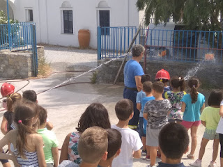 Στο σχολείο βρέθηκαν τέσσερα μέλη του ΣΕΔΑ με ένα πυροσβεστικό όχημα, ώστε να ακολουθήσει και το "παιχνίδι κατάσβεσης" της υποτιθέμενης πυρκαγιάς.
