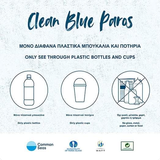 Η Clean Blue Paros στηρίζει τον Δήμο και την προσπάθεια των κατοίκων να γίνει η Πάρος το πρώτο νησί στη Μεσόγειο χωρίς πλαστικά σκουπίδια και έναν πρωτοπόρο σε παγκόσμιο επίπεδο στον αγώνα κατά της μόλυνσης της θάλασσας από πλαστικά. Ο σκοπός της Clean Blue Paros είναι διπλός: να μειώσει δραστικά τον όγκο των παραγομένων πλαστικών μιας χρήσης και να βελτιστοποιήσει τη διαχείριση του εναπομείναντος όγκου πλαστικών απορριμμάτων.