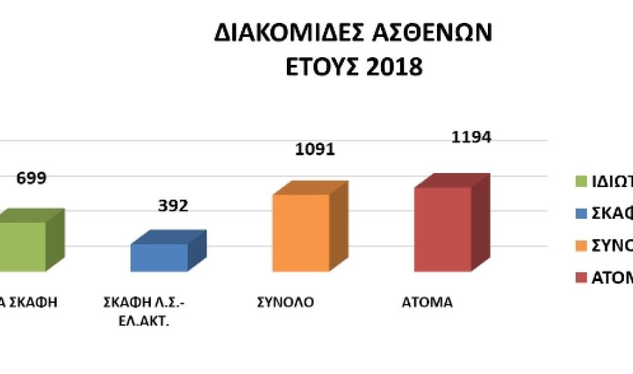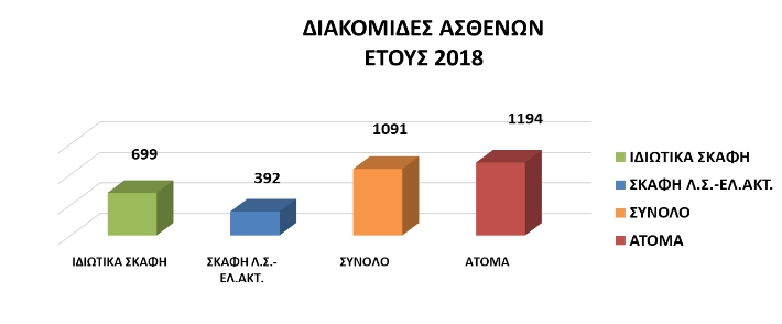 Στο πλαίσιο του κοινωνικού έργου του Λ.Σ.-ΕΛ.ΑΚΤ. και της υφιστάμενης συνεργασίας με άλλους Φορείς, κατόπιν σχετικού αιτήματος του Ε.Κ.Α.Β, ανευρίσκονται μέσω των Λιμενικών Αρχών, κατάλληλα πλωτά μέσα για την πραγματοποίηση διακομιδών ασθενών - τραυματιών από τη νησιωτική χώρα σε λιμένες, όπου βρίσκονται εκείνες οι υγειονομικές μονάδες (όπως νοσοκομεία κ.α.), οι οποίες δύναται να ανταποκριθούν στο περιστατικό. Κατά το έτος 2018, το Κ.ΕΠΙΧ./Λ.Σ.-ΕΛ.ΑΚΤ. συνέδραμε συνολικά σε (1091) διακομιδές ασθενών,