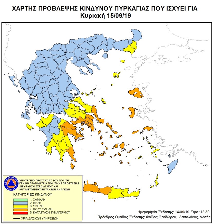 Η Αυτοτελής Διεύθυνση Πολιτικής Προστασίας της Περιφέρειας Νοτίου Αιγαίου ενημερώνει ότι την Κυριακή 15-9-2019, σύμφωνα με τον Ημερήσιο Χάρτη Πρόβλεψης Κινδύνου Πυρκαγιάς που συντάσσει η Διεύθυνση Σχεδιασμού και Αντιμετώπισης Έκτακτων Αναγκών της Γενικής Γραμματείας Πολιτικής Προστασίας, ο κίνδυνος για την εκδήλωση πυρκαγιών στην Περιφέρεια Νοτίου Αιγαίου (Π.Ε. Κυκλάδων) είναι πολύ υψηλός (Κατηγορία κινδύνου 4) και όλες οι αρμόδιες υπηρεσίες βρίσκονται σε κατάσταση αυξημένης ετοιμότητας.