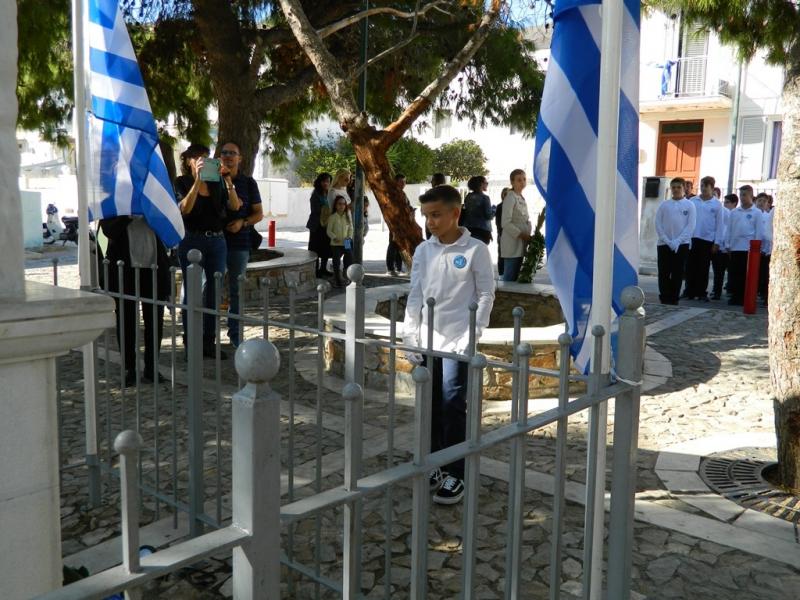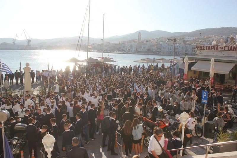 Λίγο πριν τις τέσσερις το απόγευμα, τα τμήματα των σχολείων κατέφθασαν κιόλας στο Ηρώο των Πεσόντων, όπου αποδόθηκε φόρος τιμής από μαθητές του Ενιαίου Ειδικού Επαγγελματικού Γυμνασίου – Λυκείου Σύρου, του ΕΠΑΛ Σύρου, του 3ου Γυμνασίου Σύρου, του 5ου Δημοτικού Σχολείου Ερμούπολης, του Εσπερινού ΕΠΑΛ Σύρου και τους σπουδαστές και τις σπουδάστριες του Δημόσιου Ινστιτούτου Επαγγελματικής Κατάρτισης (ΔΙΕΚ) του Γενικού Νοσοκομείου Σύρου. Στην Πλατεία Ηρώων παρευρέθηκαν μεταξύ άλλων, ο Δήμαρχος Σύρου – Ερμούπολης, Νίκος Λειβαδάρας και ο Αντιπεριφερειάρχης Μεταφορών & Επικοινωνιών Κυκλάδων, Μάρκος Δαδάος.