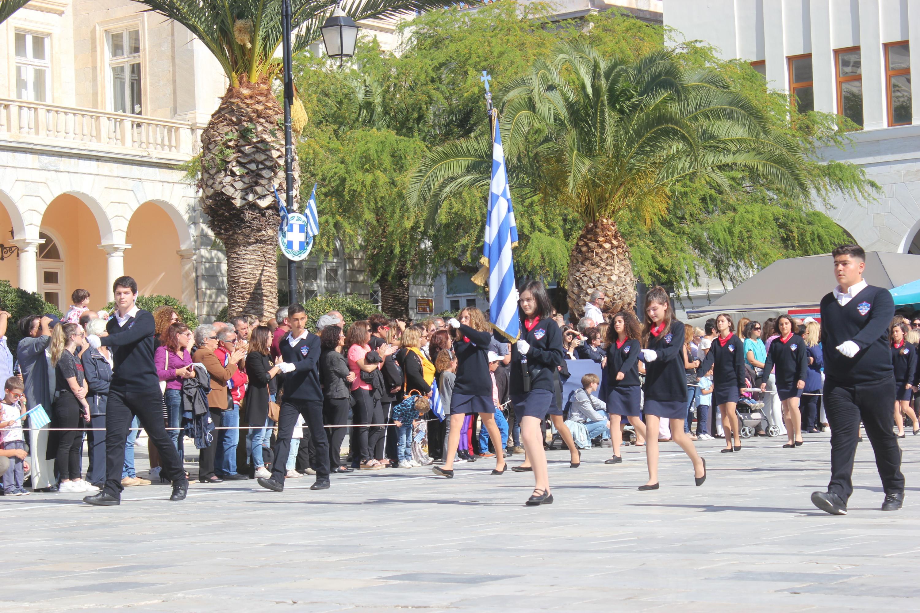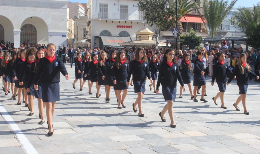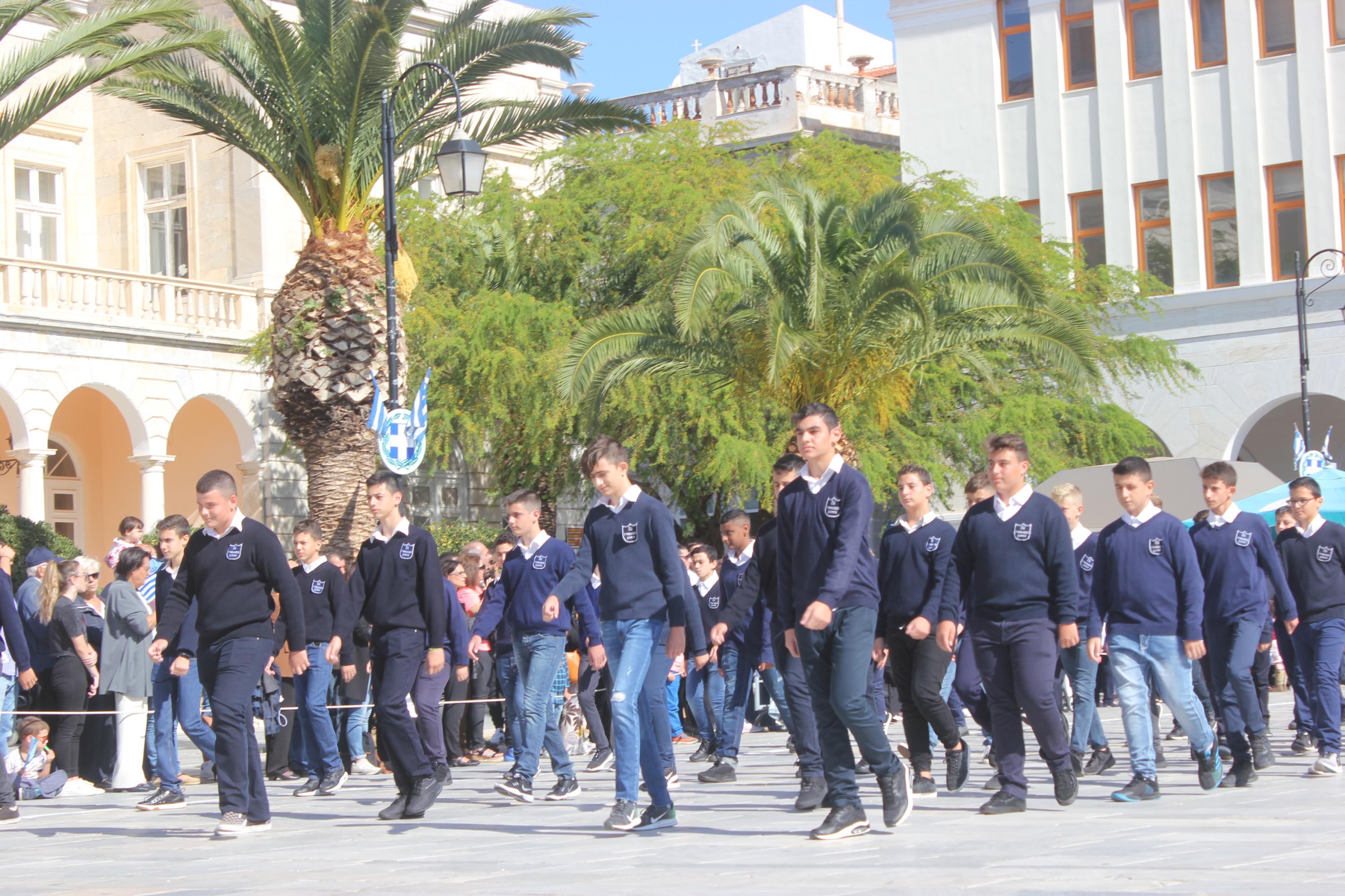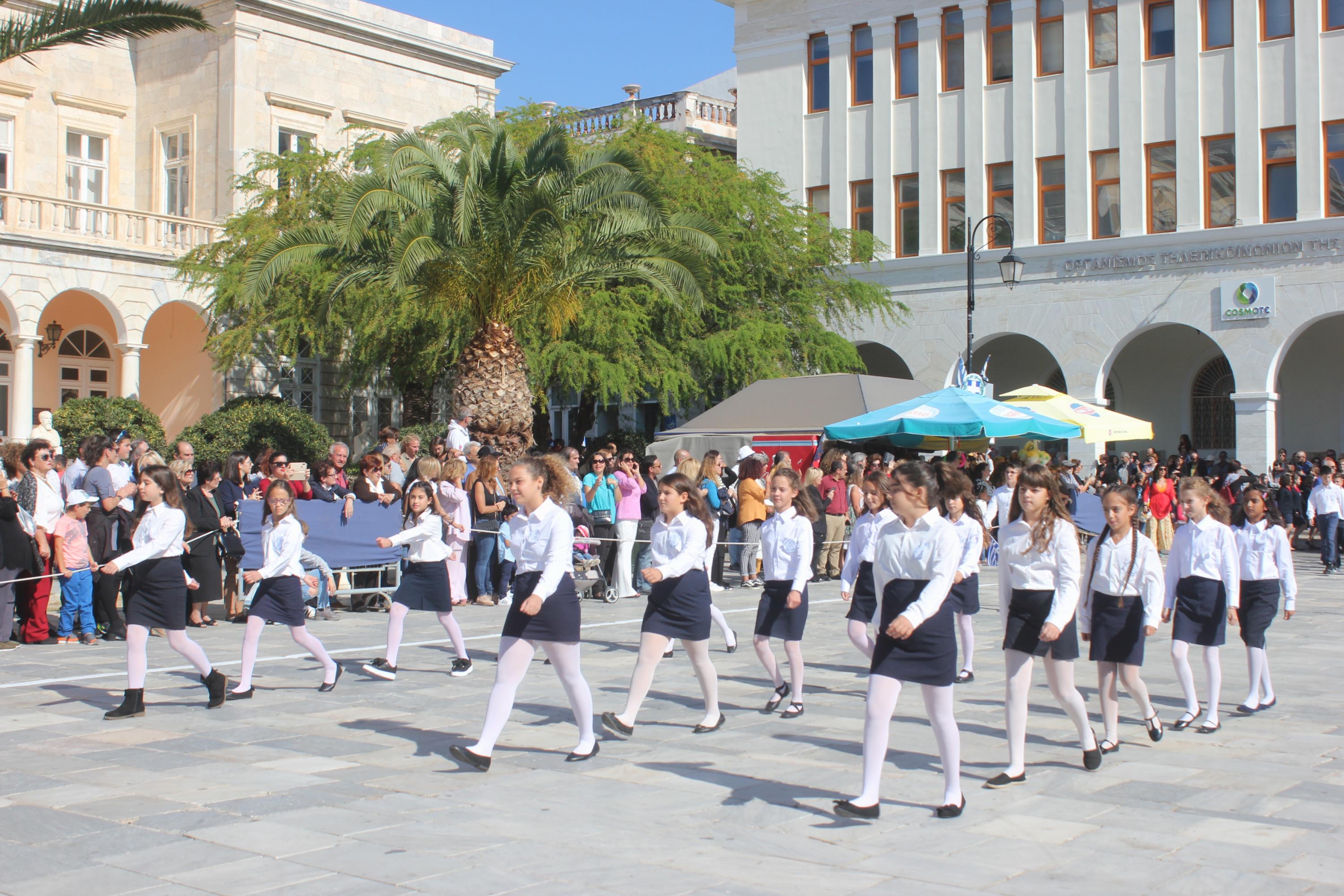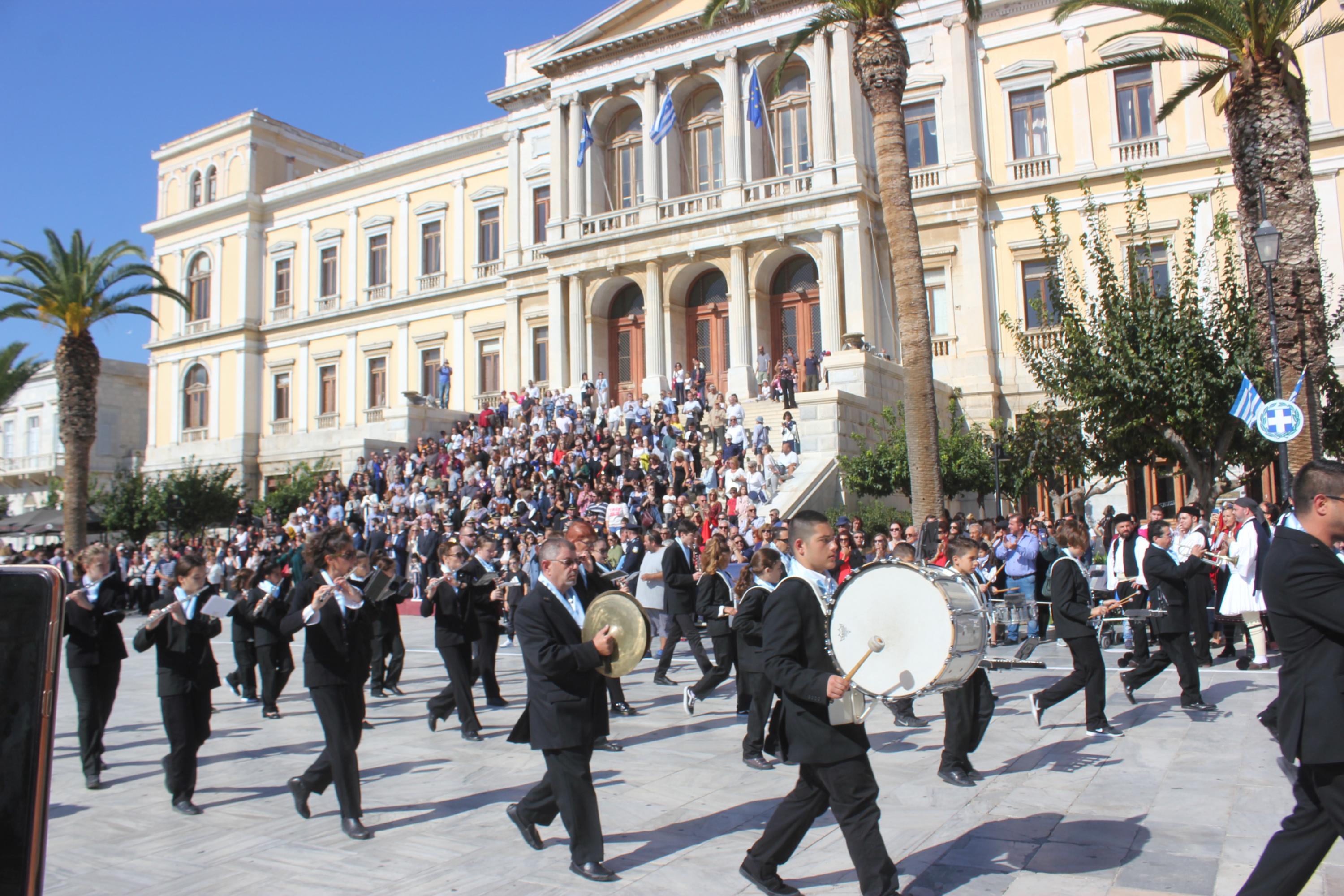 Οι εκδηλώσεις ολοκληρώθηκαν με την καθιερωμένη μαθητική παρέλαση στην πλατεία Μιαούλη. Επικεφαλής της παρέλασης ήταν και φέτος η Φιλαρμονική Δήμου Σύρου – Ερμούπολης, ενώ συμμετείχαν επίσης το Λύκειο Ελληνίδων Σύρου, ο Σύλλογος Μικρασιατών Ερμούπολης Σύρου, ο Σύλλογος Ποντίων και Βορειοελλαδιτών Σύρου «Ο ΕΥΞΕΙΝΟΣ ΠΟΝΤΟΣ», ο Ναυτικός Όμιλος Σύρου, ο Αθλητικός Σύλλογος Tae Kwon Do Ερμούπολης, το Σώμα Ελλήνων Προσκόπων, οι σπουδαστές της Ακαδημίας Εμπορικού Ναυτικού Σύρου και ένοπλο πεζοπόρο τμήμα του Τάγματος Εθνοφυλακής Ερμούπολης.