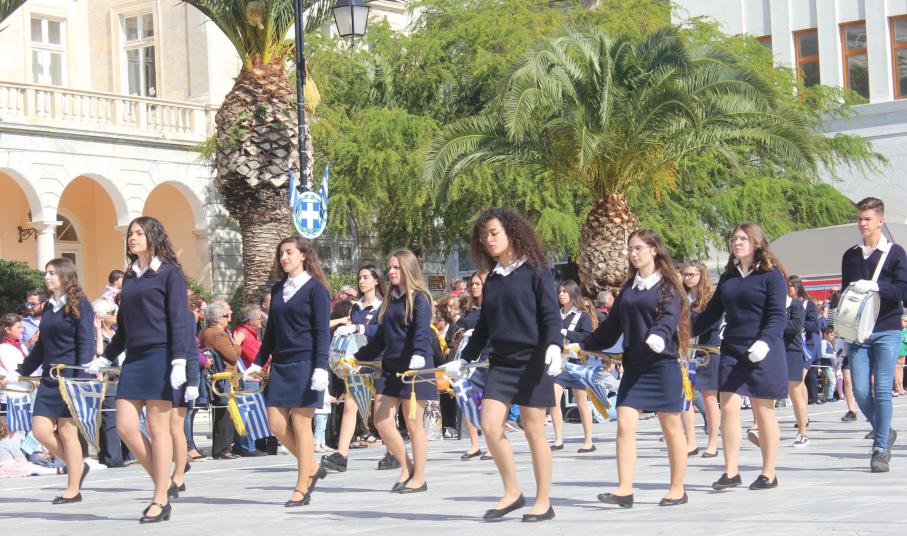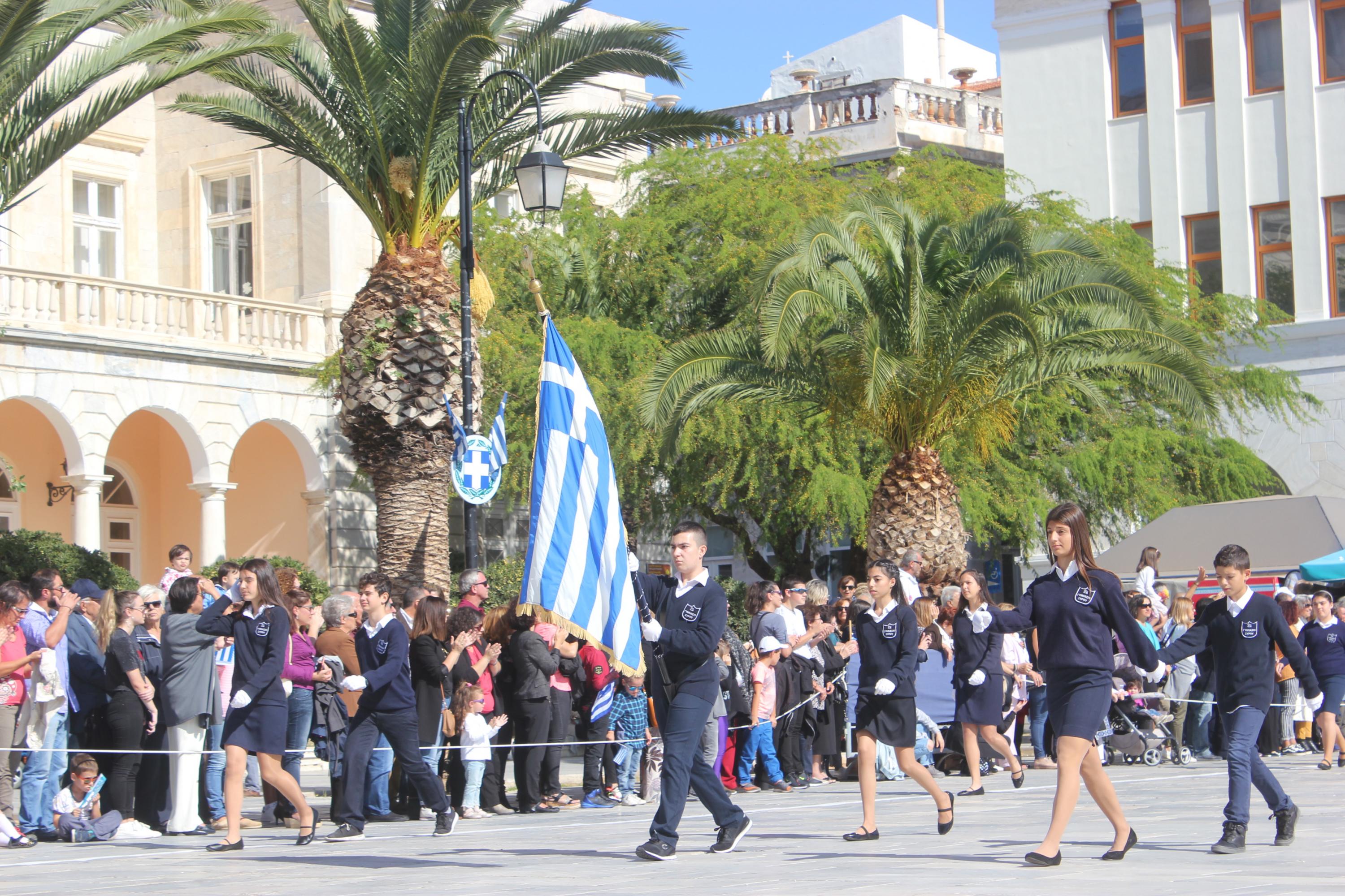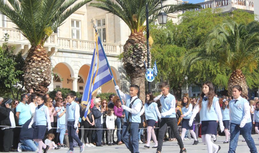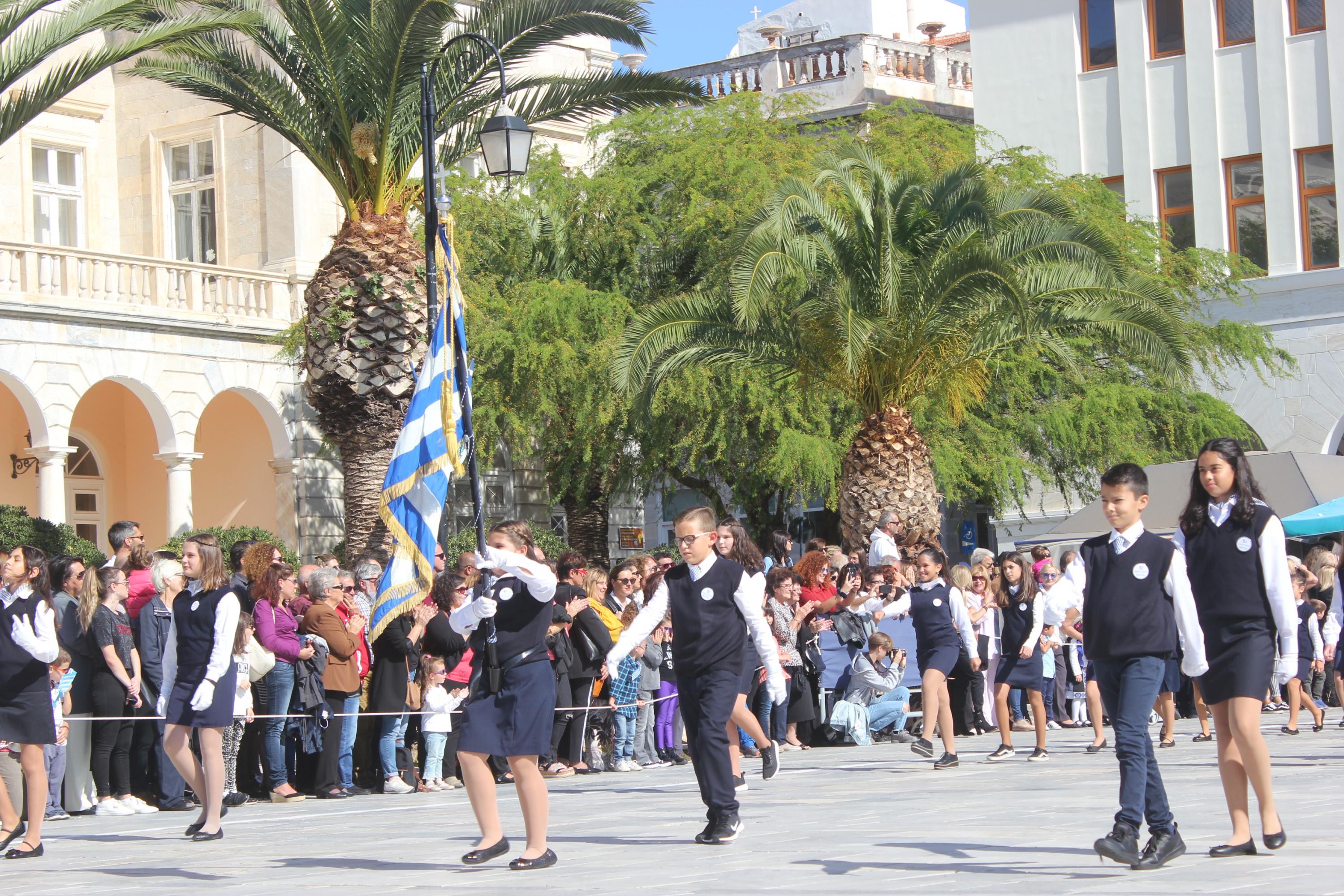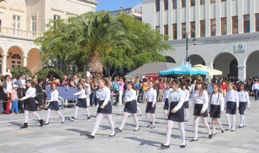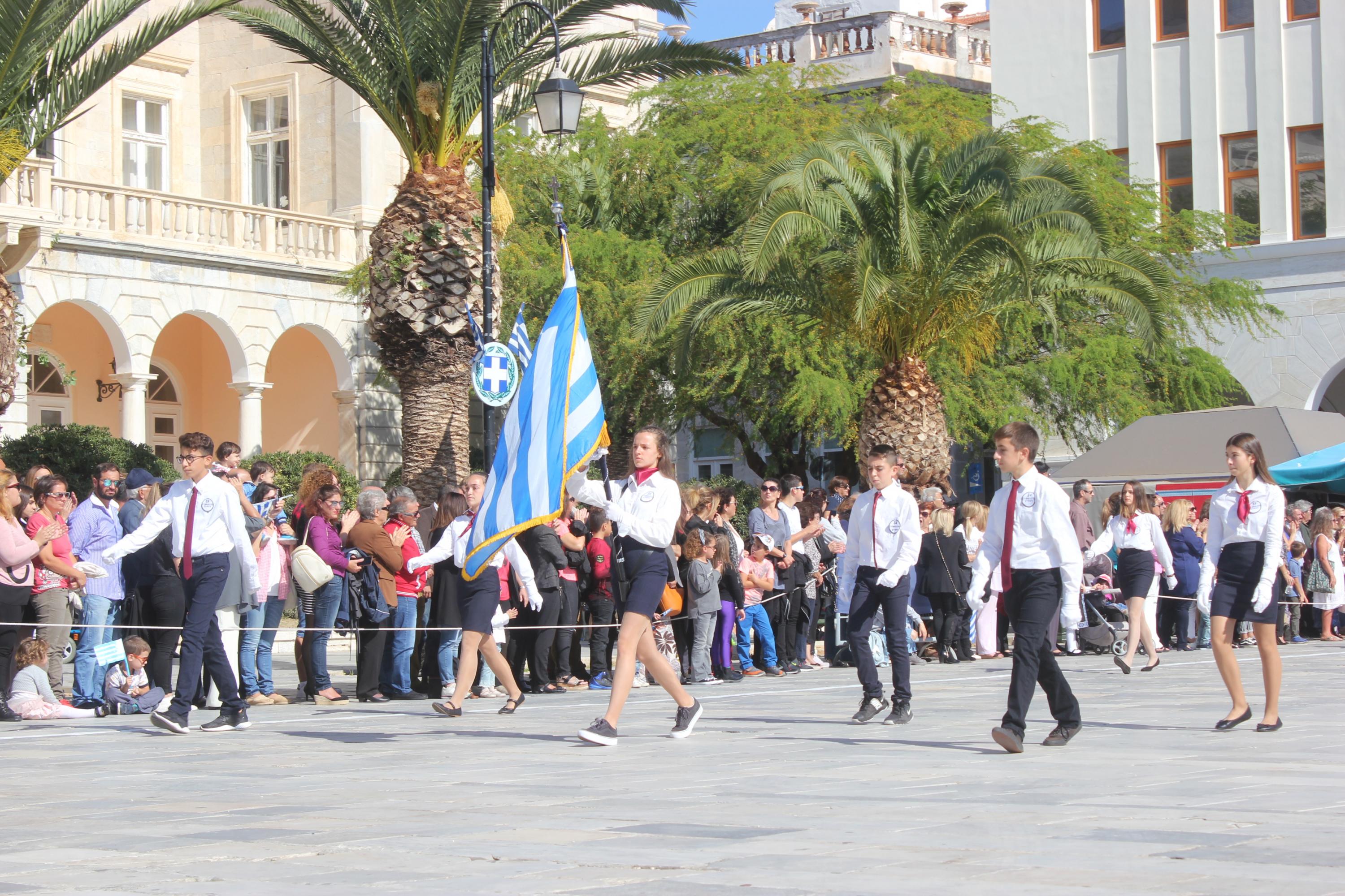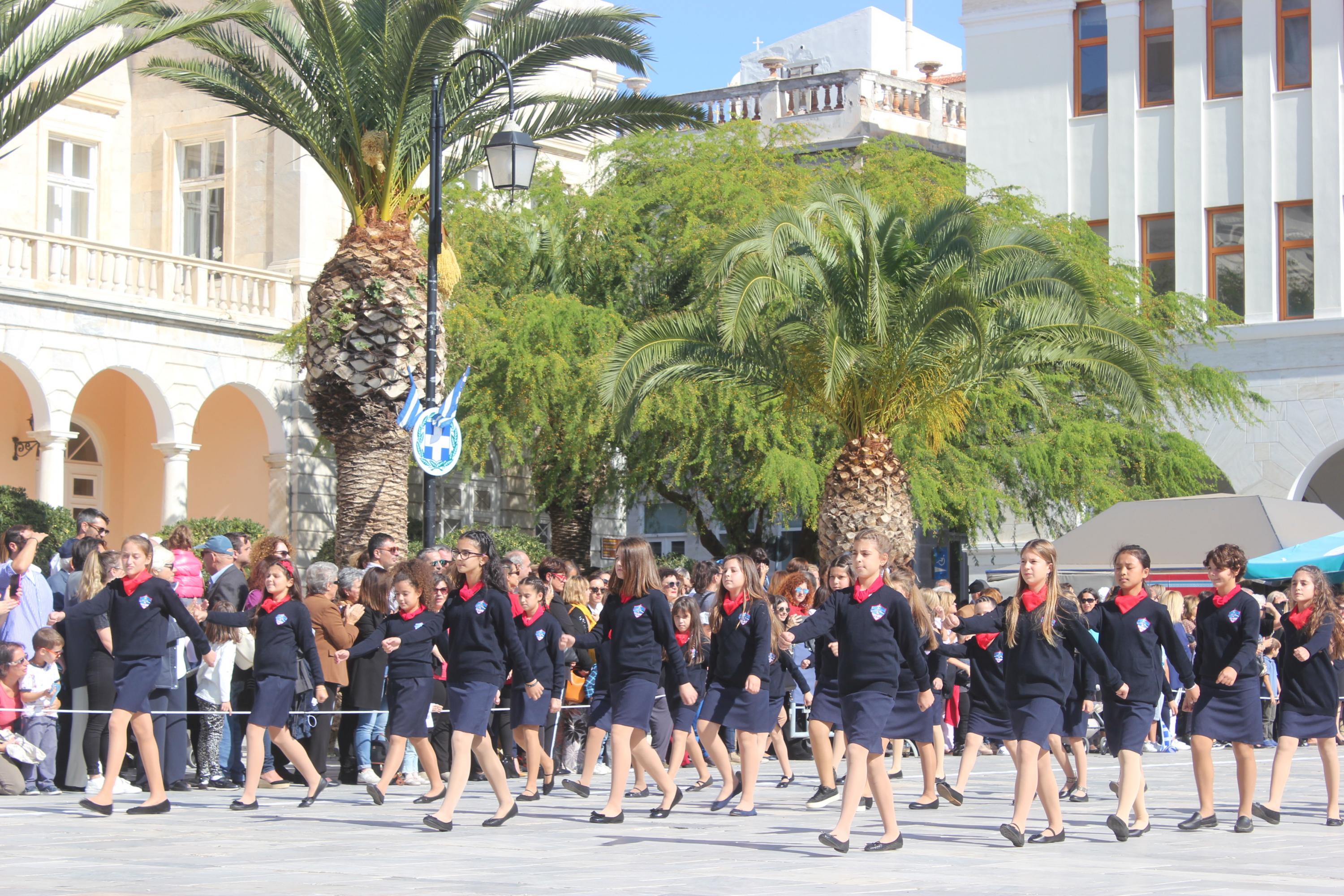 Οι εκδηλώσεις ολοκληρώθηκαν με την καθιερωμένη μαθητική παρέλαση στην πλατεία Μιαούλη. Επικεφαλής της παρέλασης ήταν και φέτος η Φιλαρμονική Δήμου Σύρου – Ερμούπολης, ενώ συμμετείχαν επίσης το Λύκειο Ελληνίδων Σύρου, ο Σύλλογος Μικρασιατών Ερμούπολης Σύρου, ο Σύλλογος Ποντίων και Βορειοελλαδιτών Σύρου «Ο ΕΥΞΕΙΝΟΣ ΠΟΝΤΟΣ», ο Ναυτικός Όμιλος Σύρου, ο Αθλητικός Σύλλογος Tae Kwon Do Ερμούπολης, το Σώμα Ελλήνων Προσκόπων, οι σπουδαστές της Ακαδημίας Εμπορικού Ναυτικού Σύρου και ένοπλο πεζοπόρο τμήμα του Τάγματος Εθνοφυλακής Ερμούπολης.