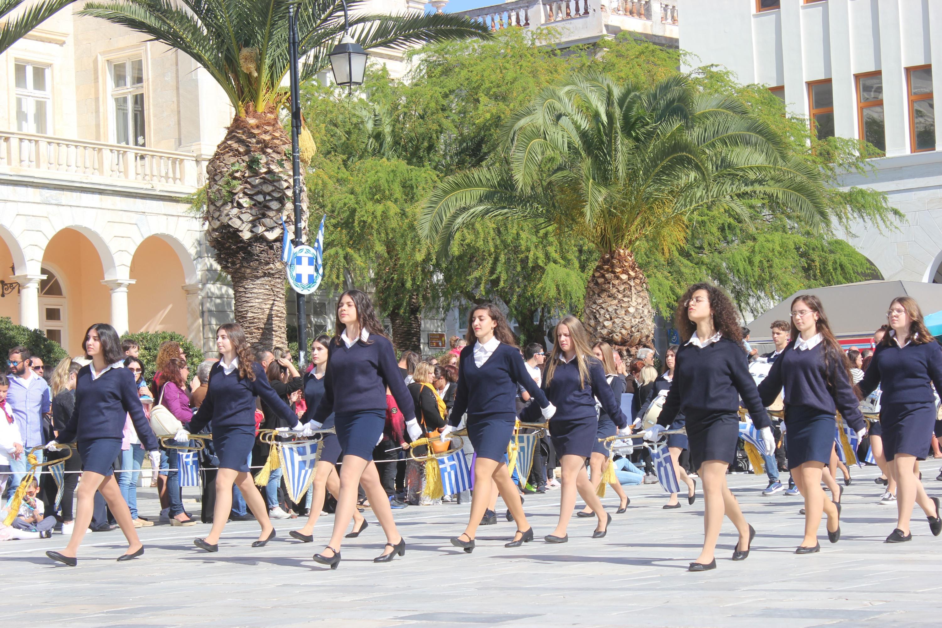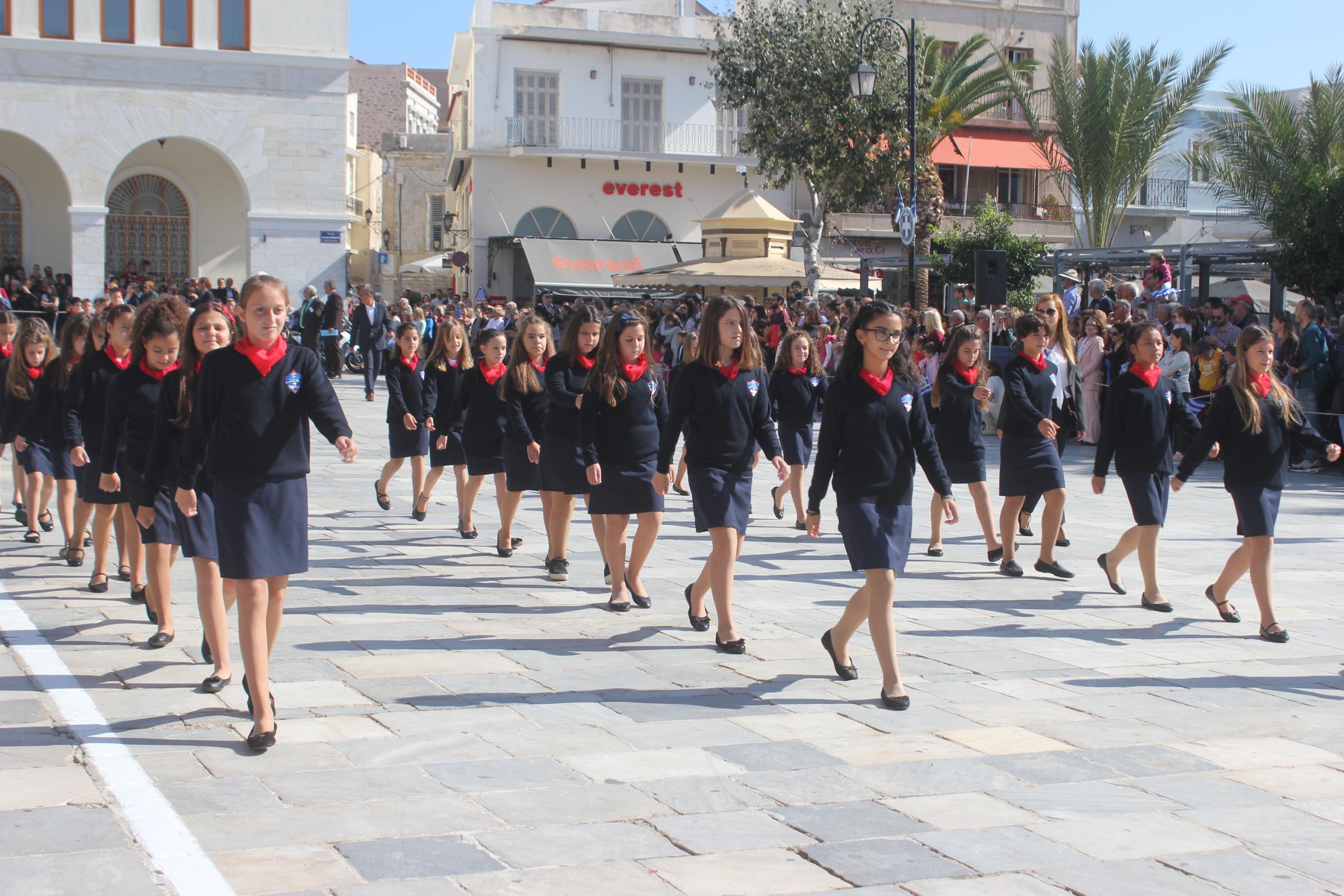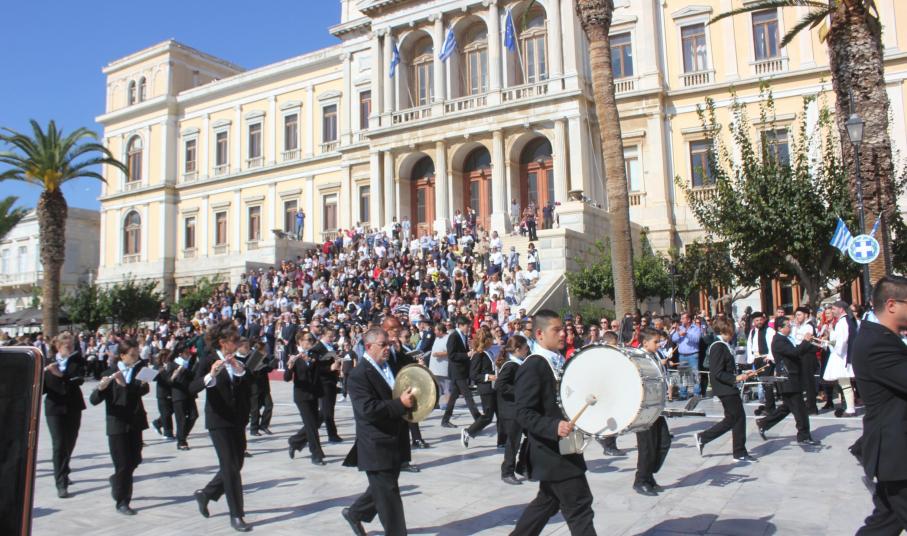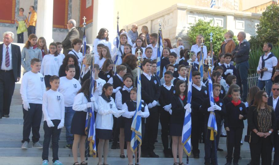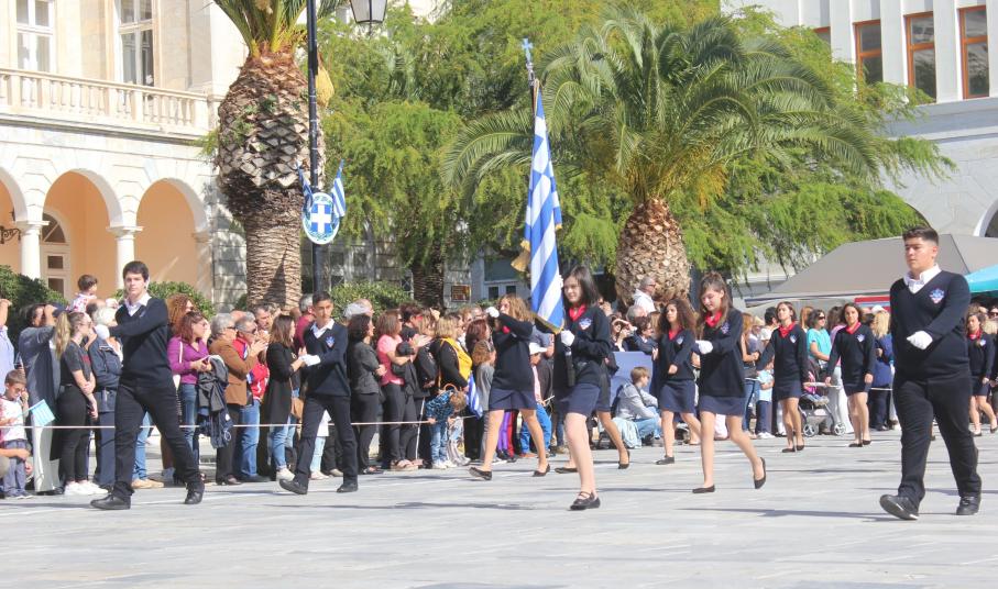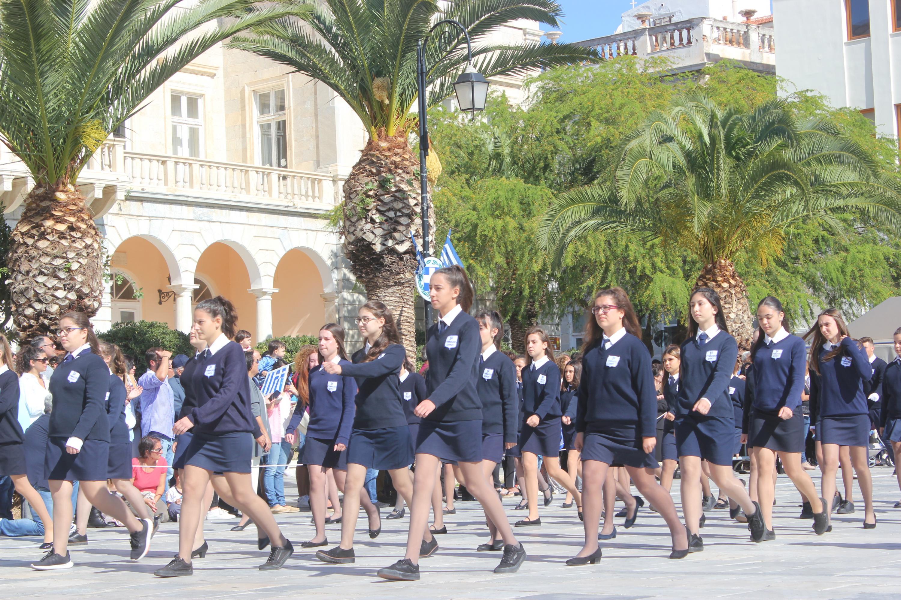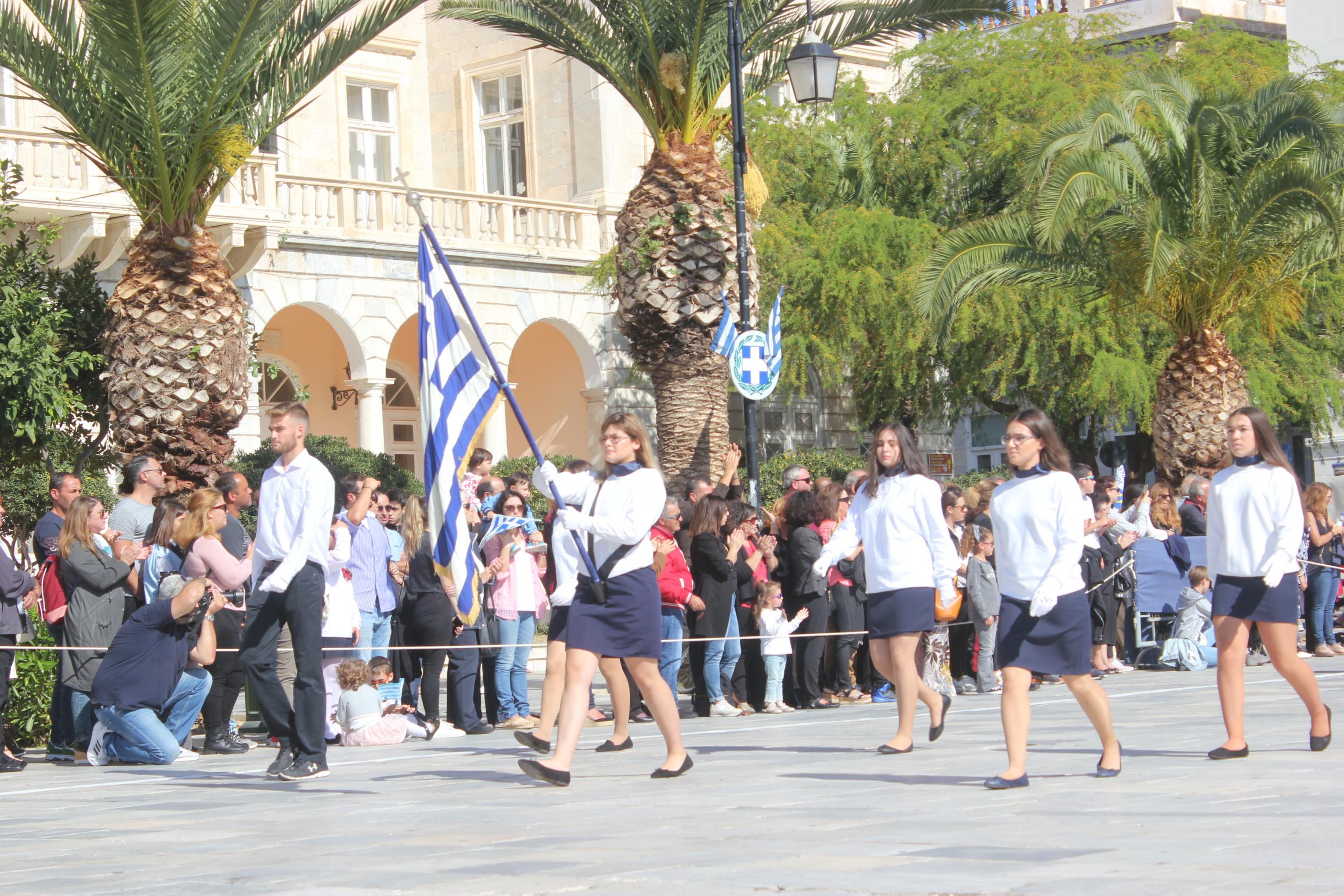 Οι εκδηλώσεις ολοκληρώθηκαν με την καθιερωμένη μαθητική παρέλαση στην πλατεία Μιαούλη. Επικεφαλής της παρέλασης ήταν και φέτος η Φιλαρμονική Δήμου Σύρου – Ερμούπολης, ενώ συμμετείχαν επίσης το Λύκειο Ελληνίδων Σύρου, ο Σύλλογος Μικρασιατών Ερμούπολης Σύρου, ο Σύλλογος Ποντίων και Βορειοελλαδιτών Σύρου «Ο ΕΥΞΕΙΝΟΣ ΠΟΝΤΟΣ», ο Ναυτικός Όμιλος Σύρου, ο Αθλητικός Σύλλογος Tae Kwon Do Ερμούπολης, το Σώμα Ελλήνων Προσκόπων, οι σπουδαστές της Ακαδημίας Εμπορικού Ναυτικού Σύρου και ένοπλο πεζοπόρο τμήμα του Τάγματος Εθνοφυλακής Ερμούπολης.