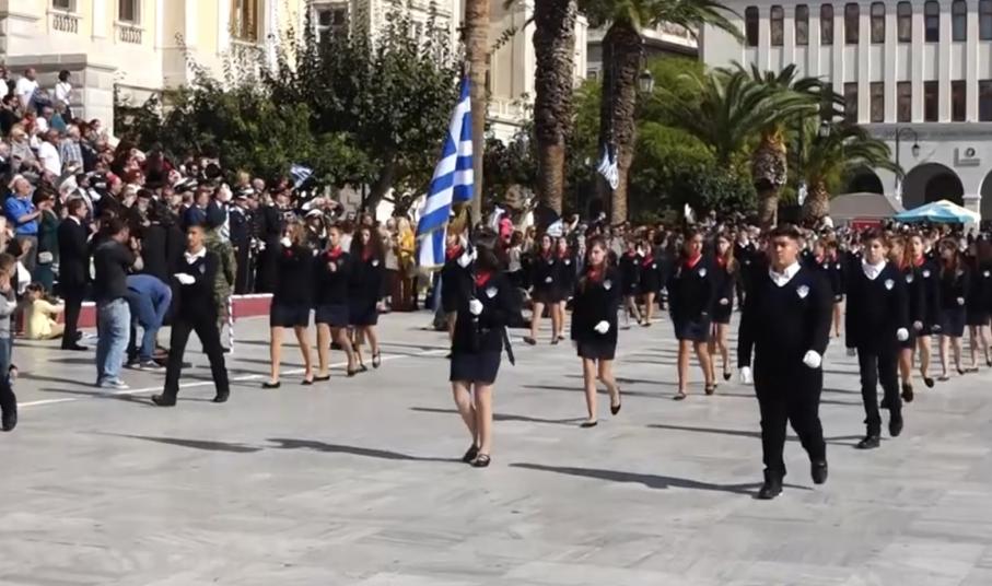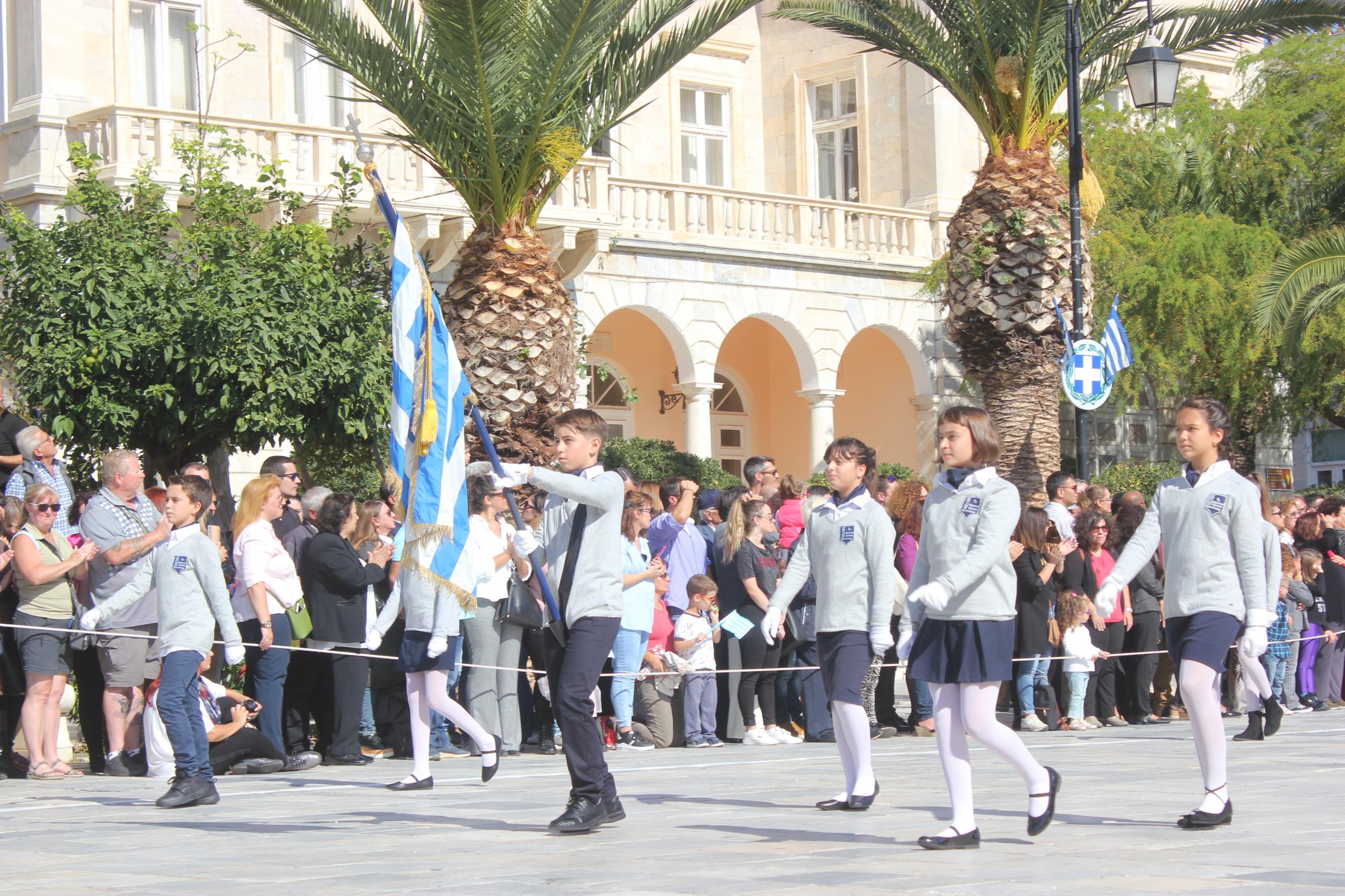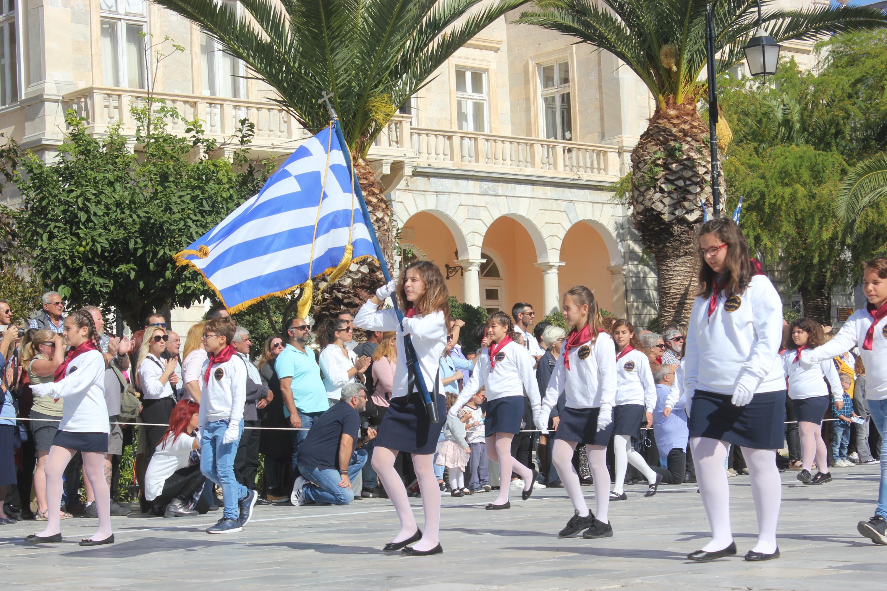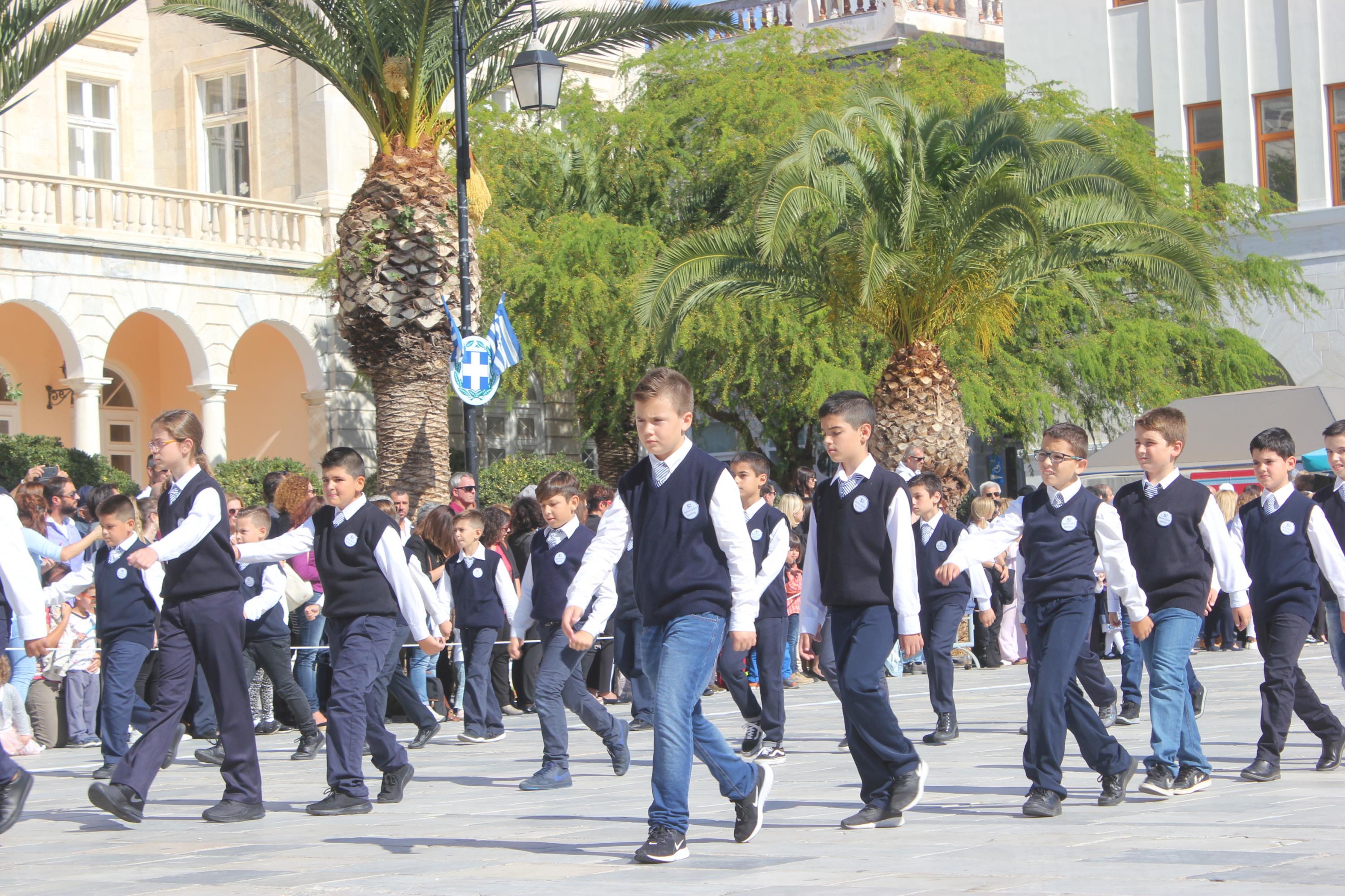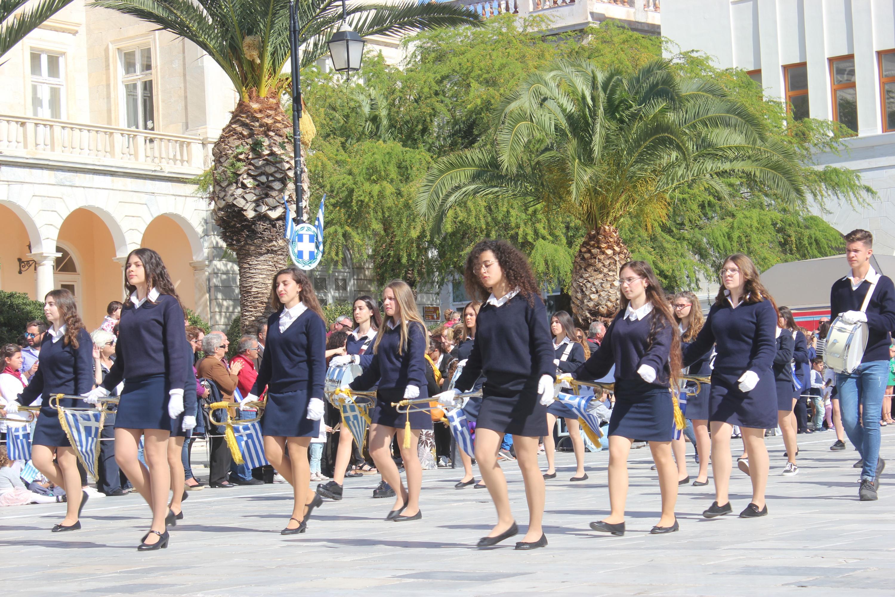 Οι εκδηλώσεις ολοκληρώθηκαν με την καθιερωμένη μαθητική παρέλαση στην πλατεία Μιαούλη. Επικεφαλής της παρέλασης ήταν και φέτος η Φιλαρμονική Δήμου Σύρου – Ερμούπολης, ενώ συμμετείχαν επίσης το Λύκειο Ελληνίδων Σύρου, ο Σύλλογος Μικρασιατών Ερμούπολης Σύρου, ο Σύλλογος Ποντίων και Βορειοελλαδιτών Σύρου «Ο ΕΥΞΕΙΝΟΣ ΠΟΝΤΟΣ», ο Ναυτικός Όμιλος Σύρου, ο Αθλητικός Σύλλογος Tae Kwon Do Ερμούπολης, το Σώμα Ελλήνων Προσκόπων, οι σπουδαστές της Ακαδημίας Εμπορικού Ναυτικού Σύρου και ένοπλο πεζοπόρο τμήμα του Τάγματος Εθνοφυλακής Ερμούπολης.