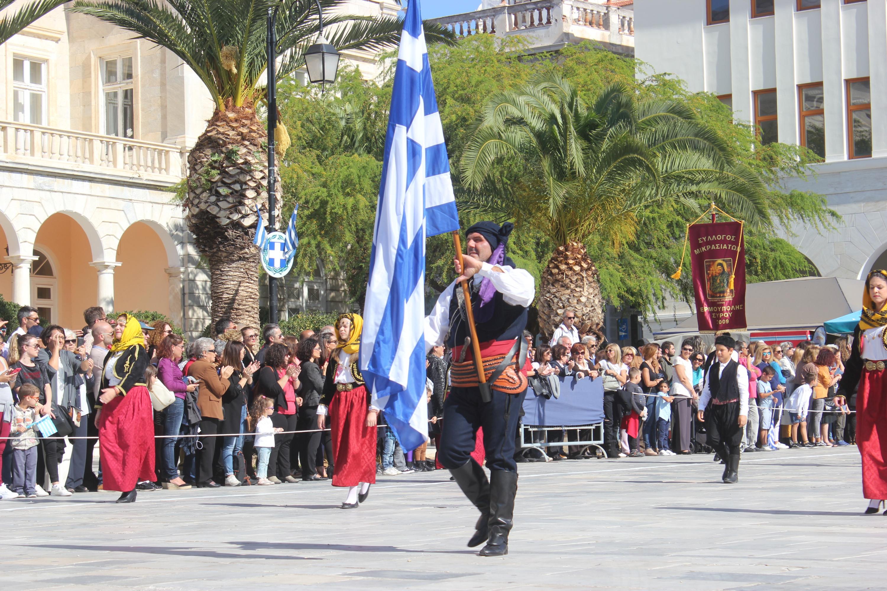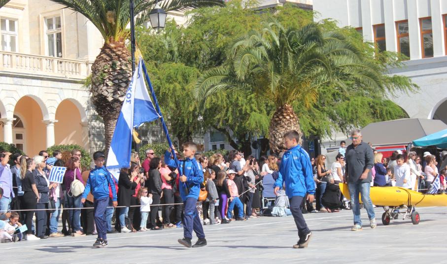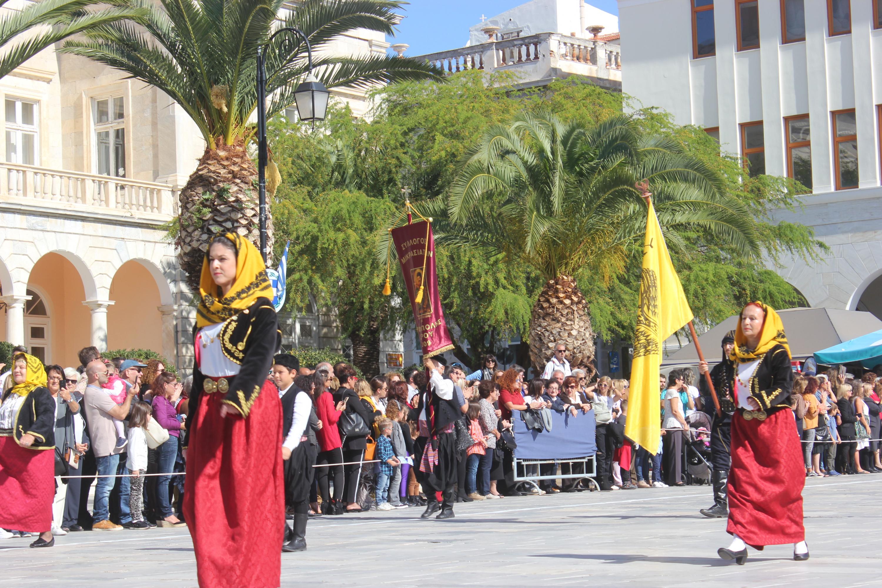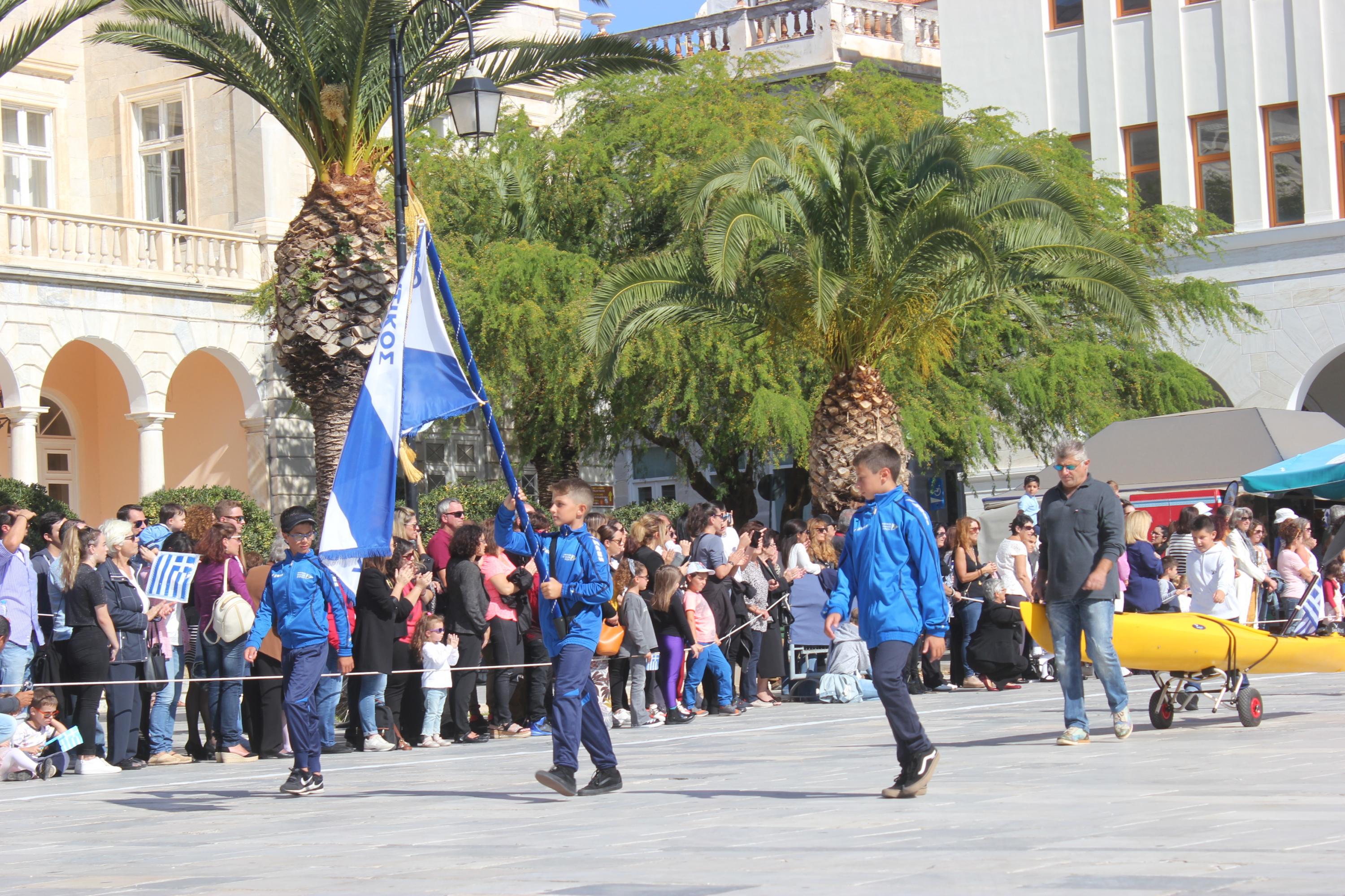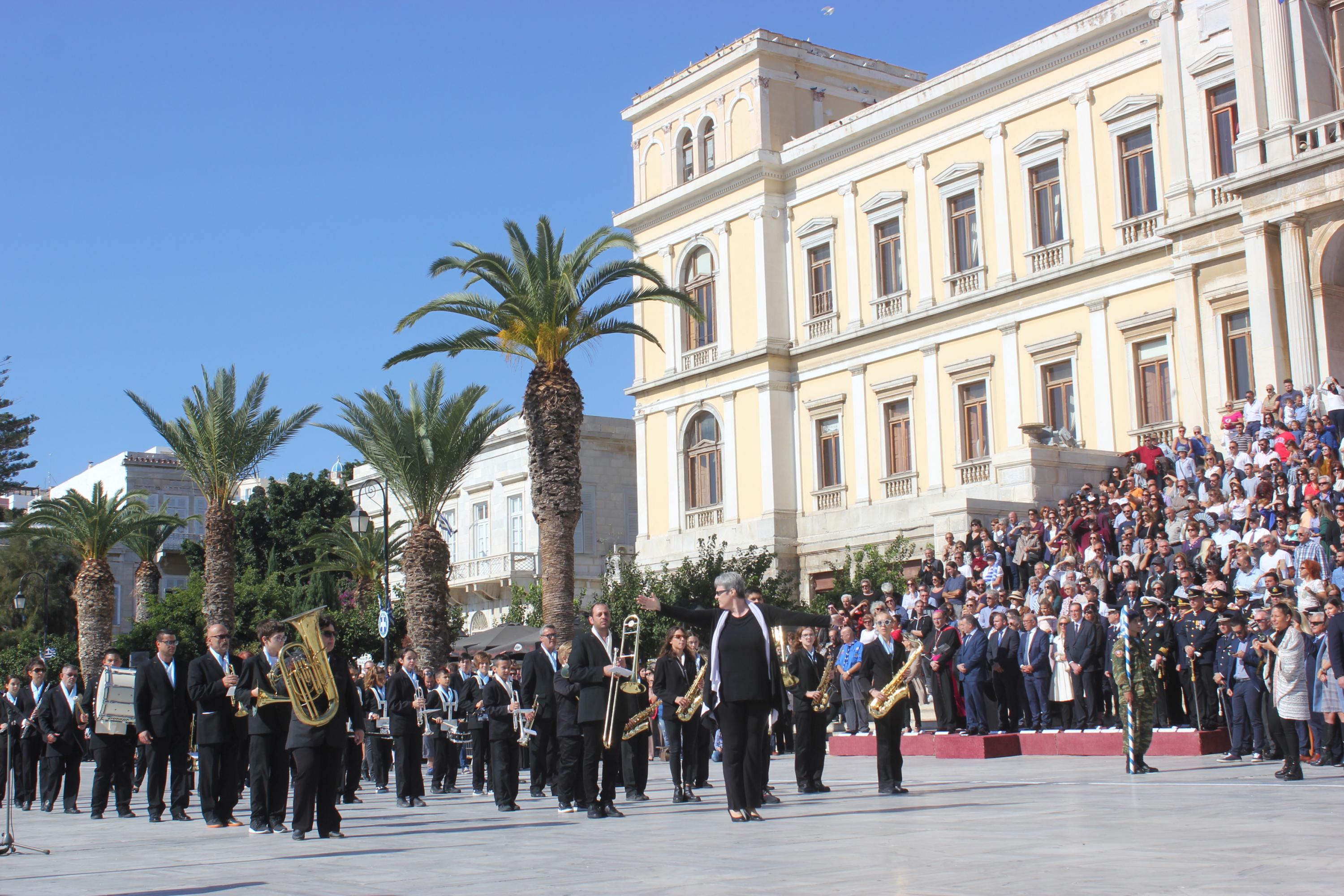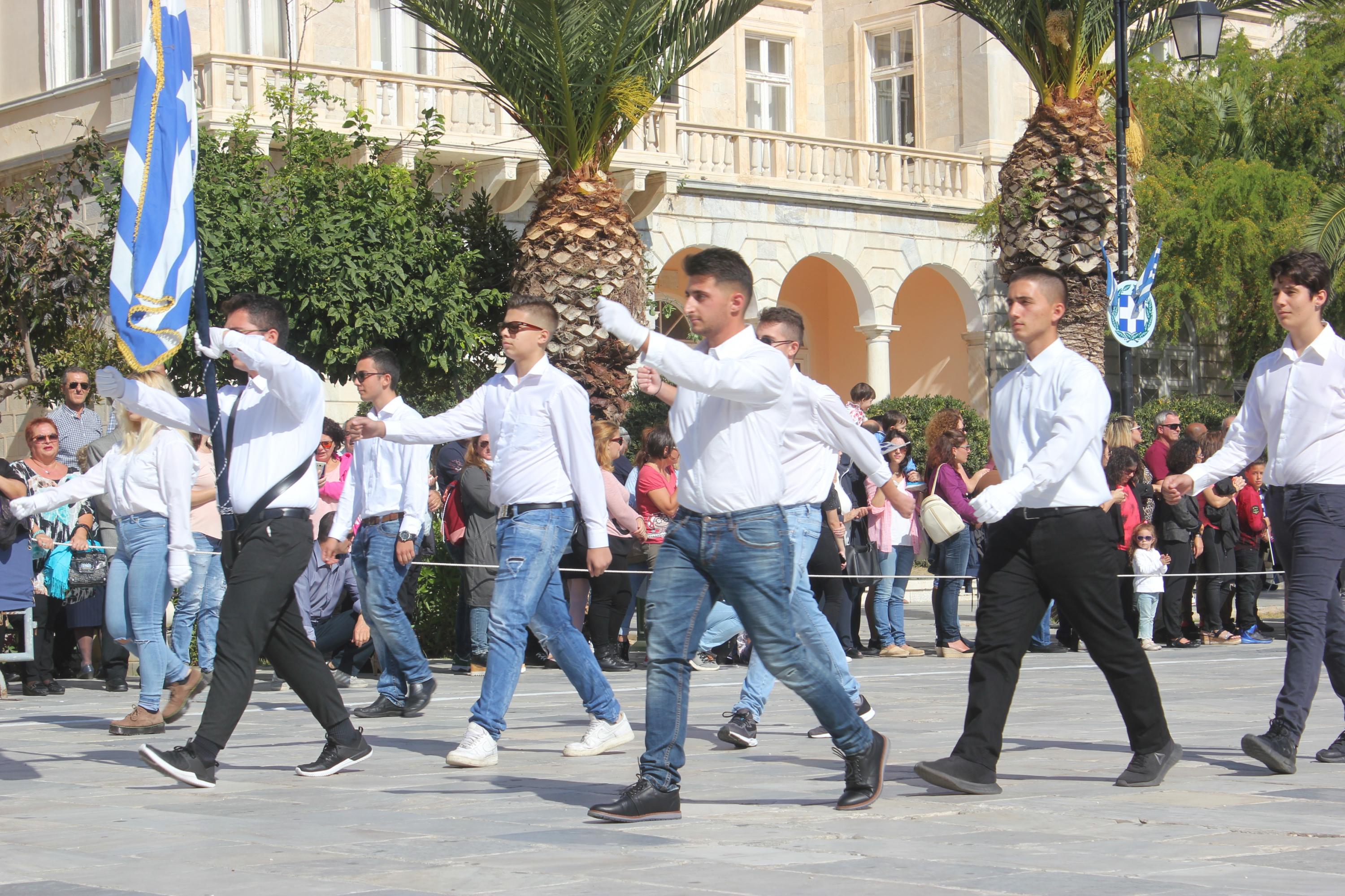 Οι εκδηλώσεις ολοκληρώθηκαν με την καθιερωμένη μαθητική παρέλαση στην πλατεία Μιαούλη. Επικεφαλής της παρέλασης ήταν και φέτος η Φιλαρμονική Δήμου Σύρου – Ερμούπολης, ενώ συμμετείχαν επίσης το Λύκειο Ελληνίδων Σύρου, ο Σύλλογος Μικρασιατών Ερμούπολης Σύρου, ο Σύλλογος Ποντίων και Βορειοελλαδιτών Σύρου «Ο ΕΥΞΕΙΝΟΣ ΠΟΝΤΟΣ», ο Ναυτικός Όμιλος Σύρου, ο Αθλητικός Σύλλογος Tae Kwon Do Ερμούπολης, το Σώμα Ελλήνων Προσκόπων, οι σπουδαστές της Ακαδημίας Εμπορικού Ναυτικού Σύρου και ένοπλο πεζοπόρο τμήμα του Τάγματος Εθνοφυλακής Ερμούπολης.