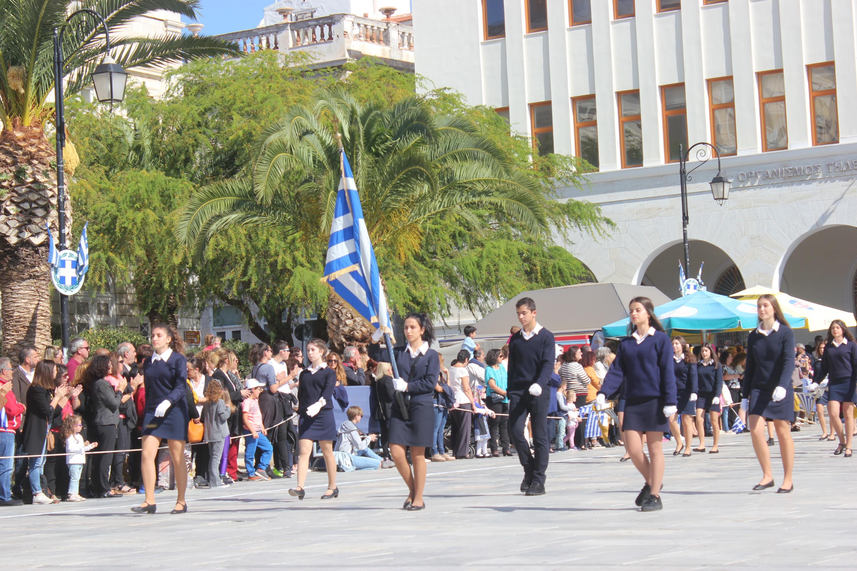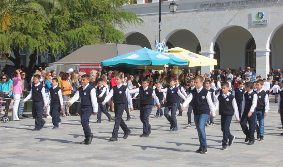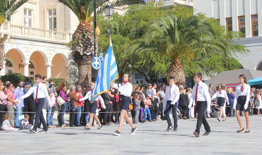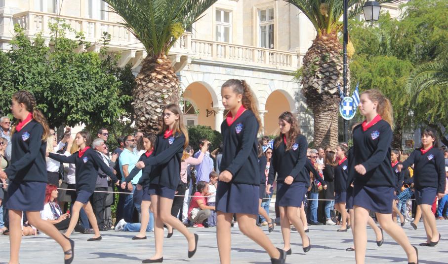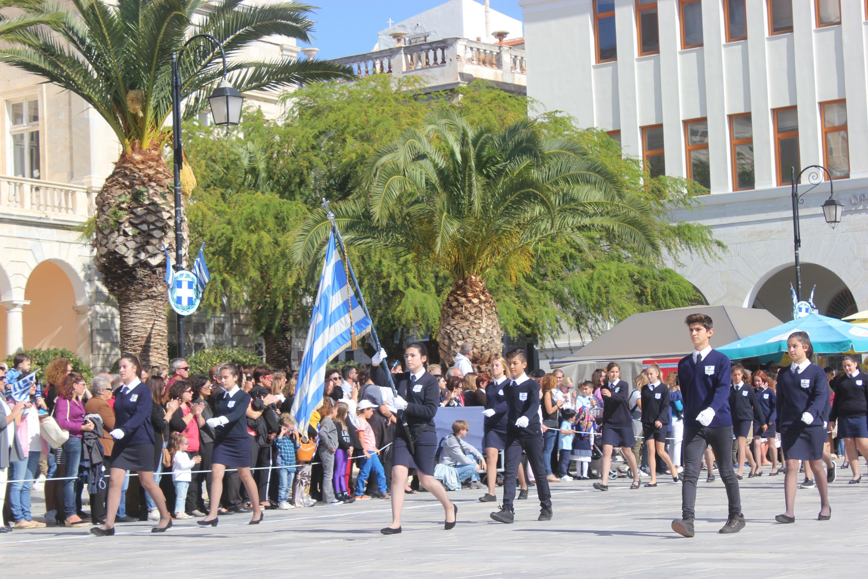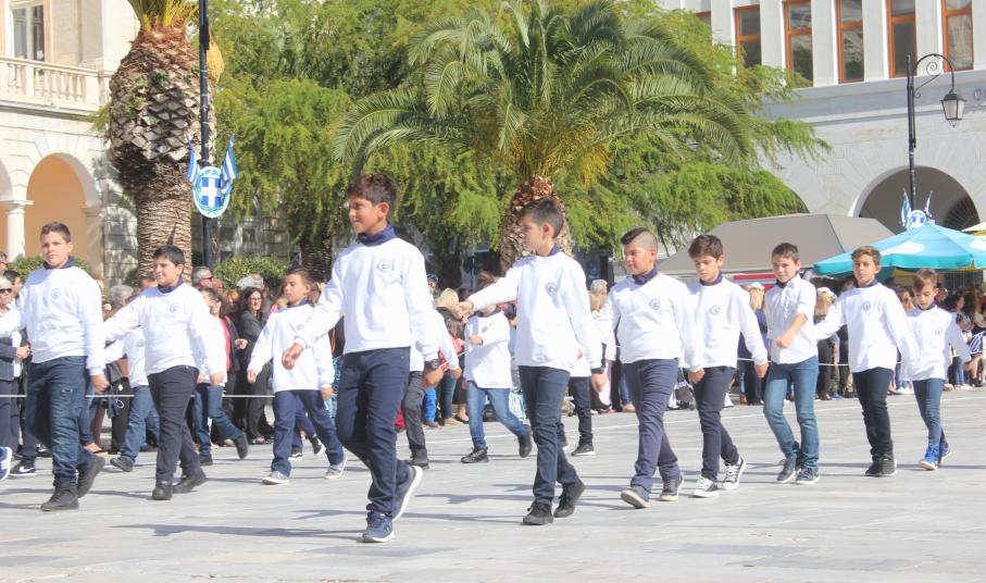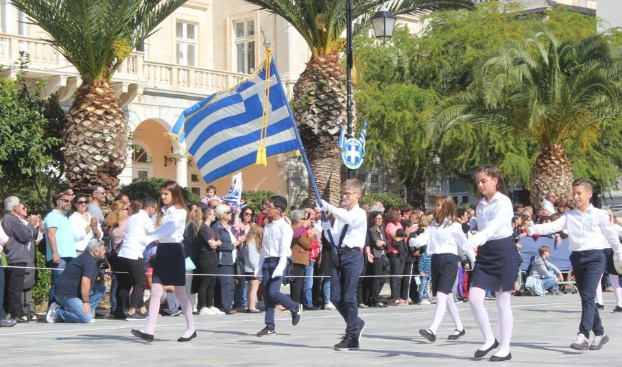 Οι εκδηλώσεις ολοκληρώθηκαν με την καθιερωμένη μαθητική παρέλαση στην πλατεία Μιαούλη. Επικεφαλής της παρέλασης ήταν και φέτος η Φιλαρμονική Δήμου Σύρου – Ερμούπολης, ενώ συμμετείχαν επίσης το Λύκειο Ελληνίδων Σύρου, ο Σύλλογος Μικρασιατών Ερμούπολης Σύρου, ο Σύλλογος Ποντίων και Βορειοελλαδιτών Σύρου «Ο ΕΥΞΕΙΝΟΣ ΠΟΝΤΟΣ», ο Ναυτικός Όμιλος Σύρου, ο Αθλητικός Σύλλογος Tae Kwon Do Ερμούπολης, το Σώμα Ελλήνων Προσκόπων, οι σπουδαστές της Ακαδημίας Εμπορικού Ναυτικού Σύρου και ένοπλο πεζοπόρο τμήμα του Τάγματος Εθνοφυλακής Ερμούπολης.