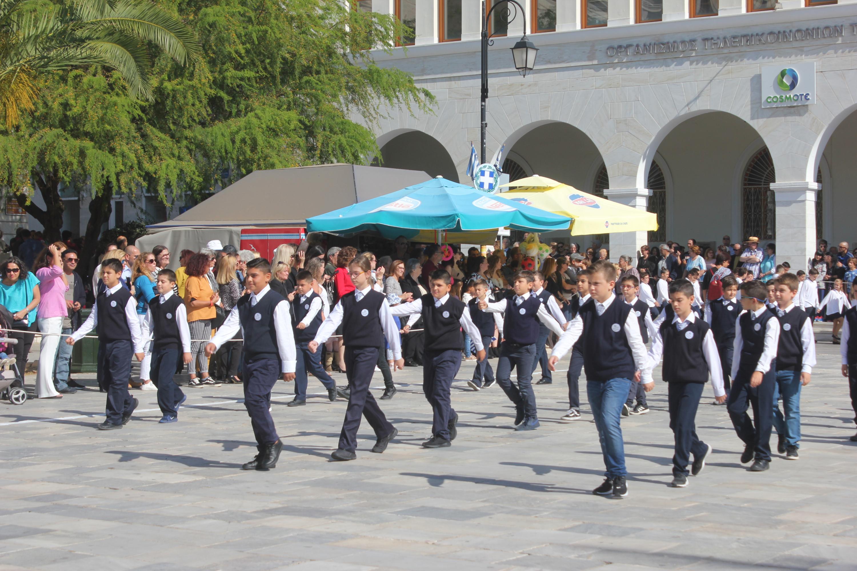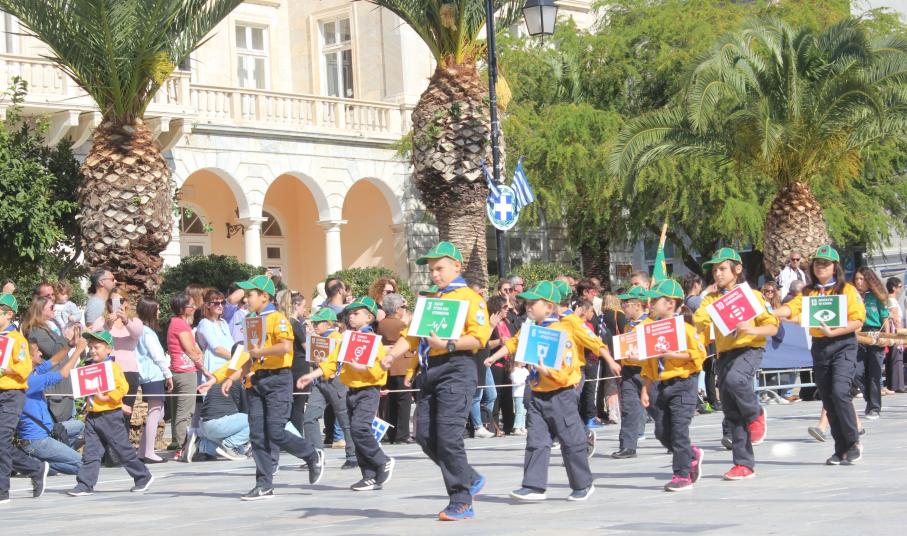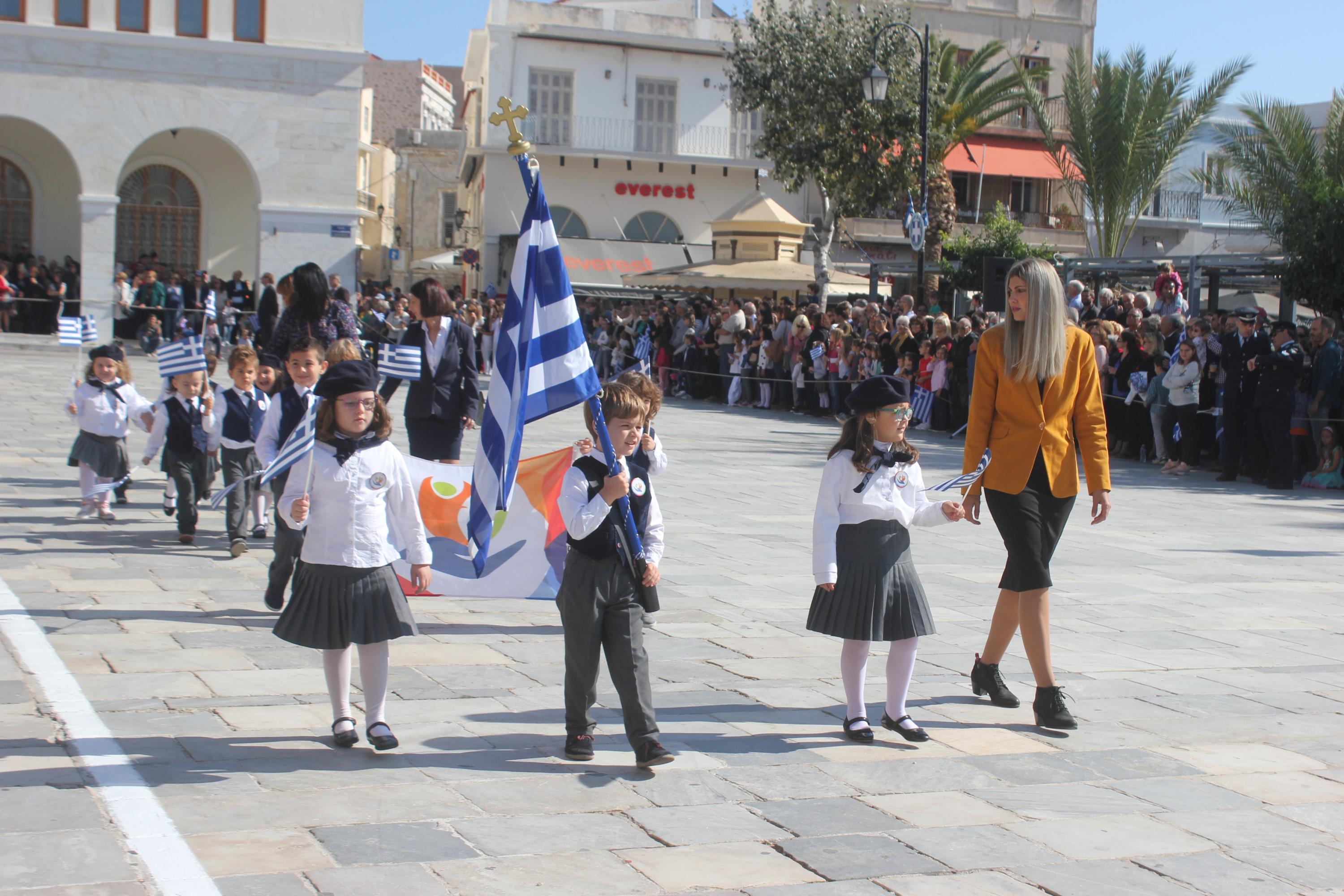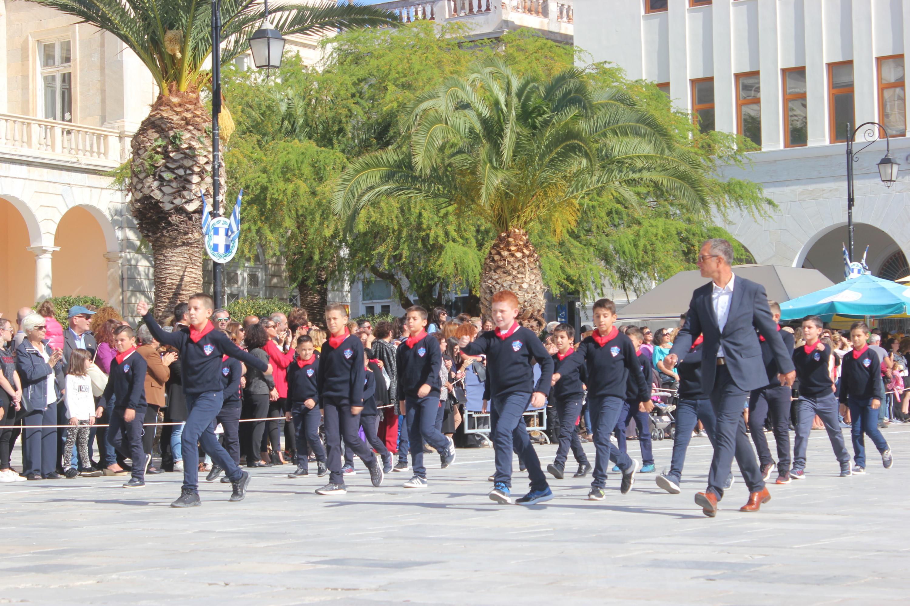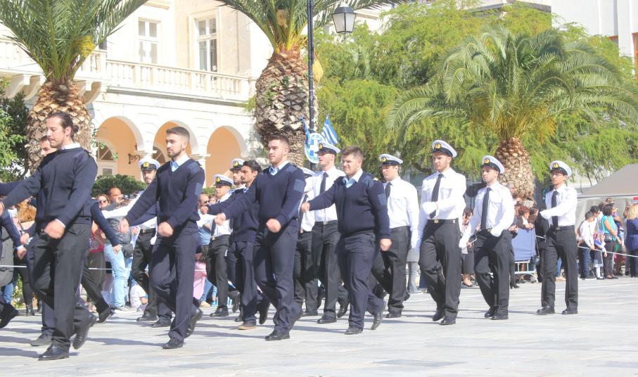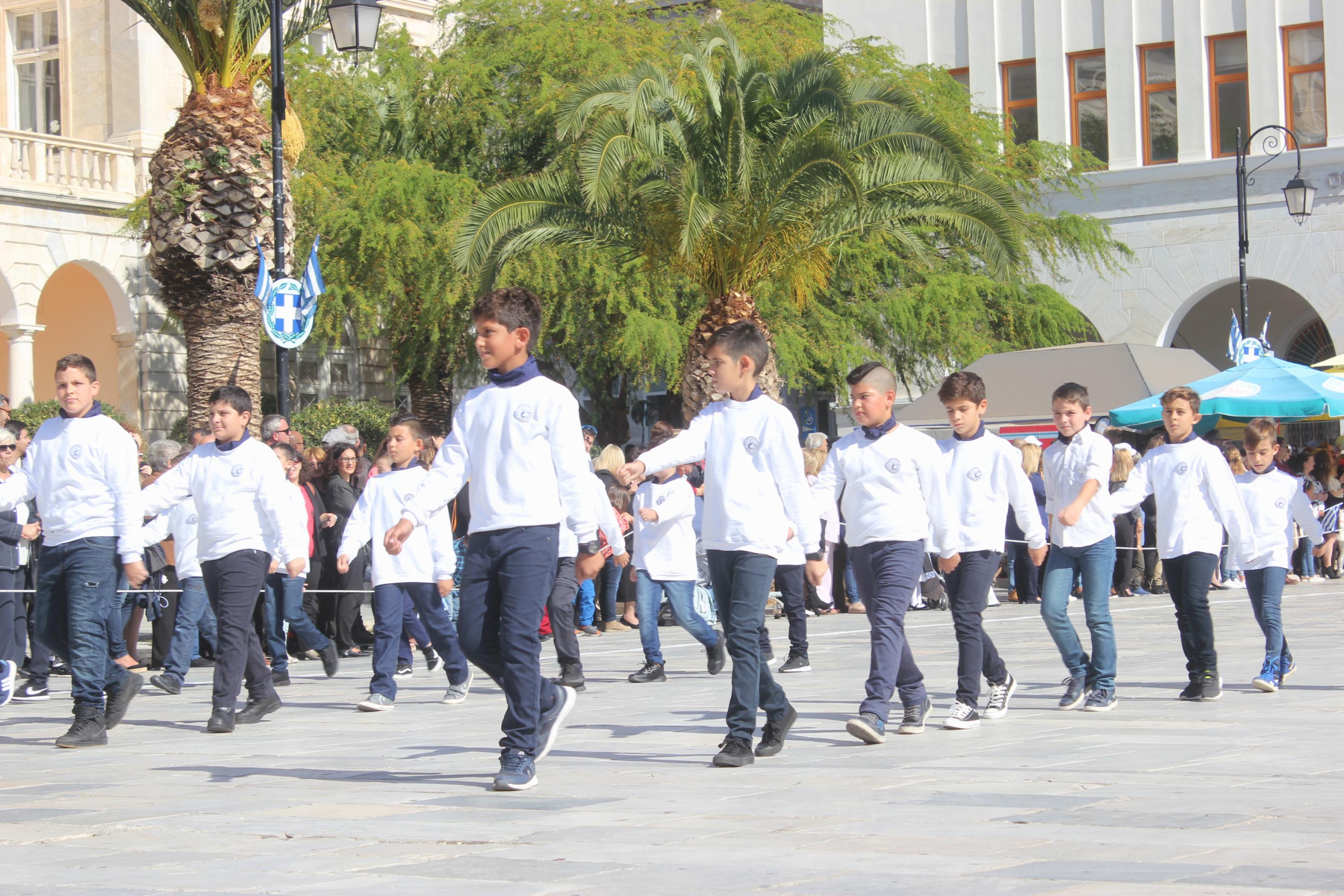 Οι εκδηλώσεις ολοκληρώθηκαν με την καθιερωμένη μαθητική παρέλαση στην πλατεία Μιαούλη. Επικεφαλής της παρέλασης ήταν και φέτος η Φιλαρμονική Δήμου Σύρου – Ερμούπολης, ενώ συμμετείχαν επίσης το Λύκειο Ελληνίδων Σύρου, ο Σύλλογος Μικρασιατών Ερμούπολης Σύρου, ο Σύλλογος Ποντίων και Βορειοελλαδιτών Σύρου «Ο ΕΥΞΕΙΝΟΣ ΠΟΝΤΟΣ», ο Ναυτικός Όμιλος Σύρου, ο Αθλητικός Σύλλογος Tae Kwon Do Ερμούπολης, το Σώμα Ελλήνων Προσκόπων, οι σπουδαστές της Ακαδημίας Εμπορικού Ναυτικού Σύρου και ένοπλο πεζοπόρο τμήμα του Τάγματος Εθνοφυλακής Ερμούπολης.