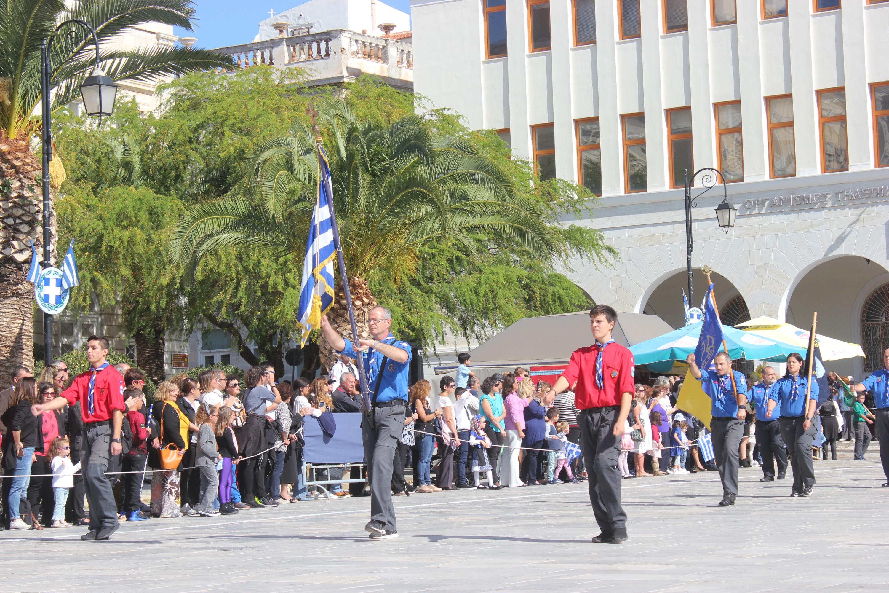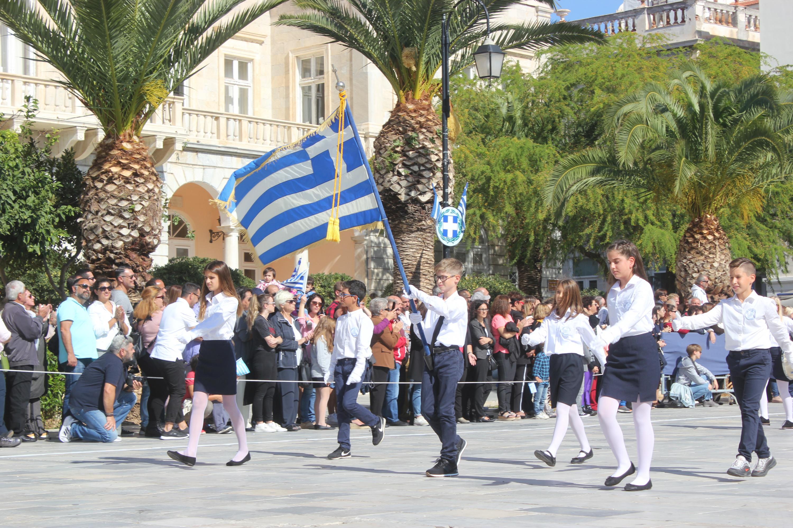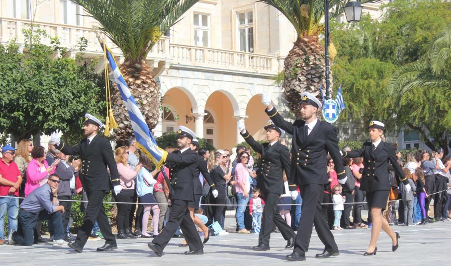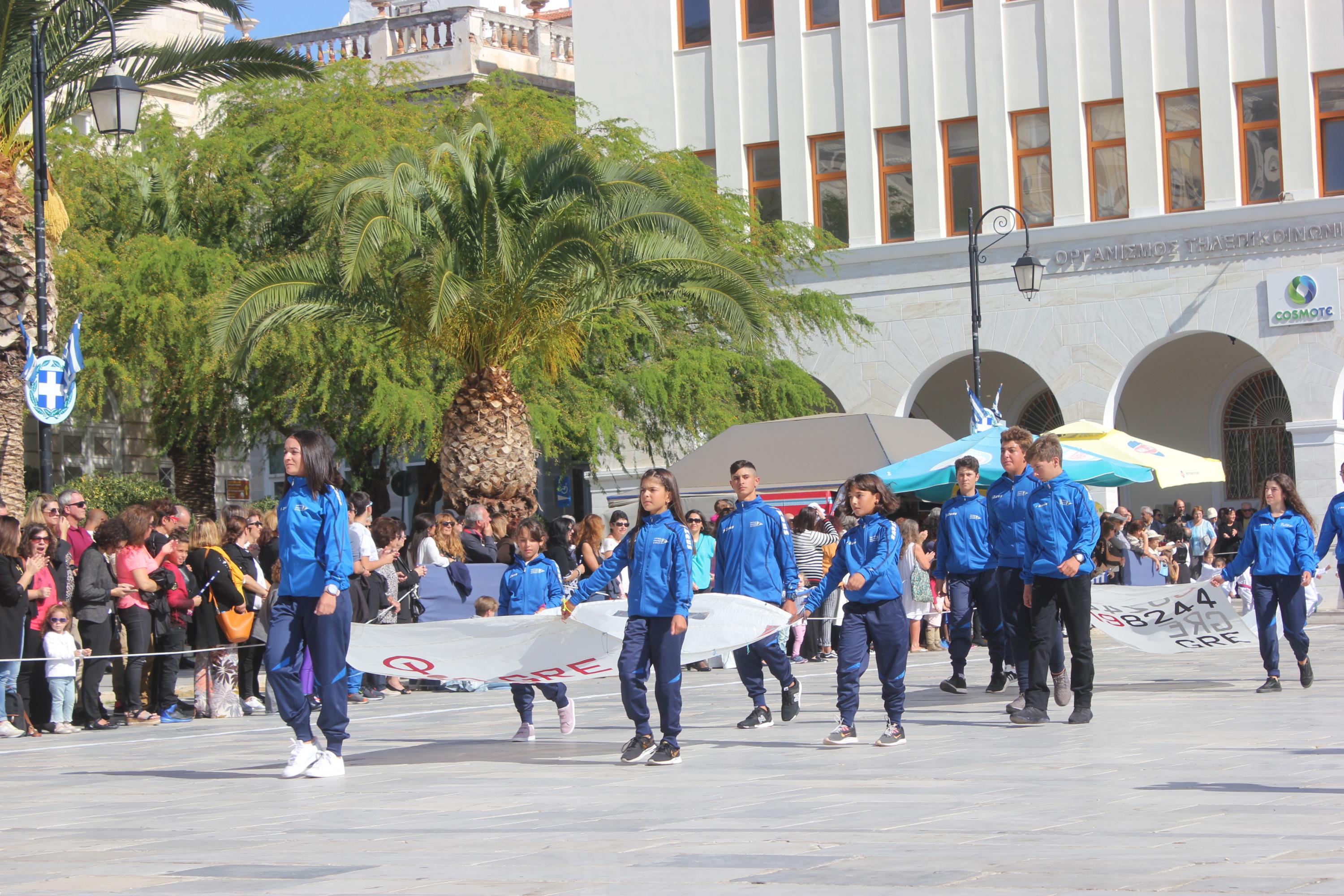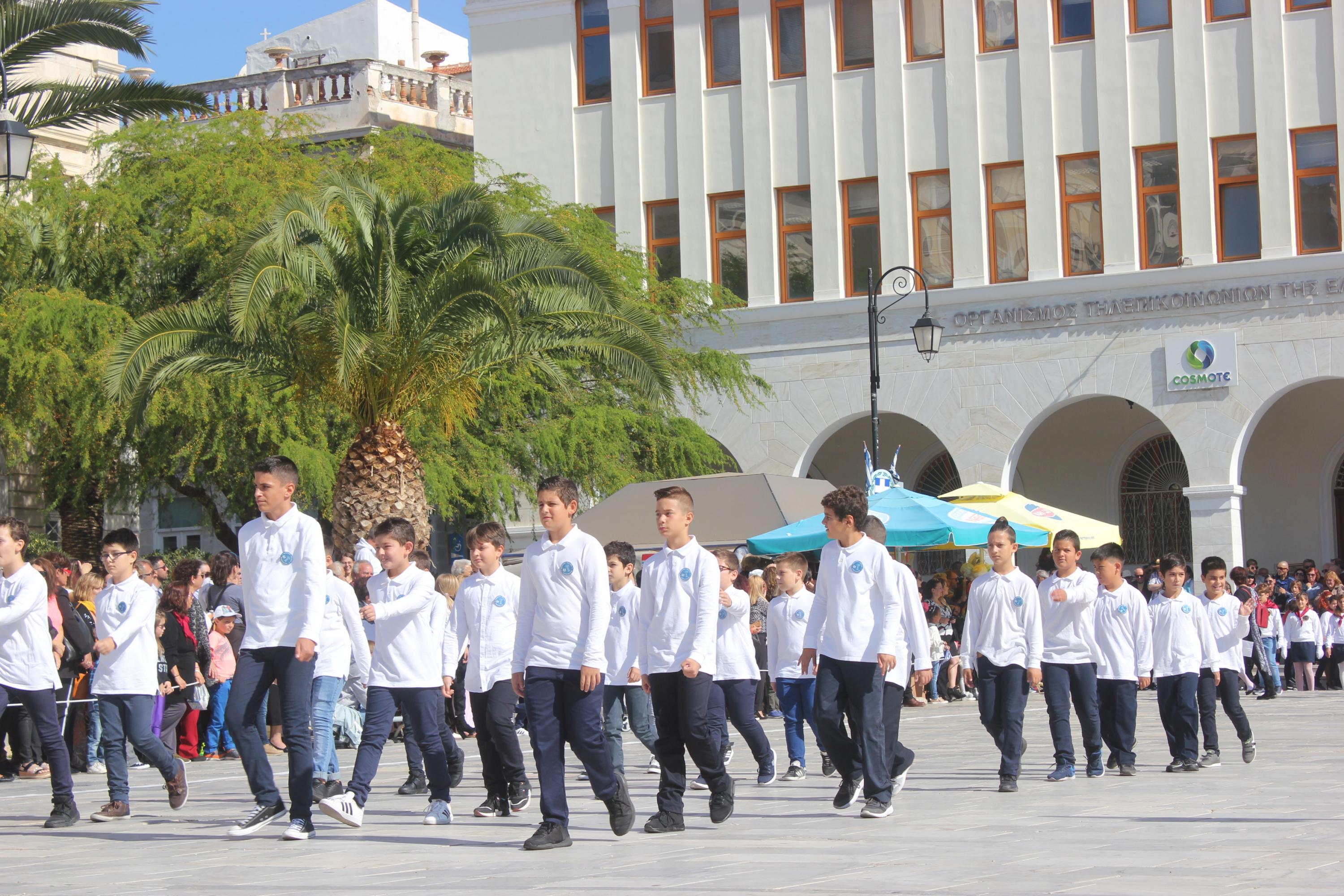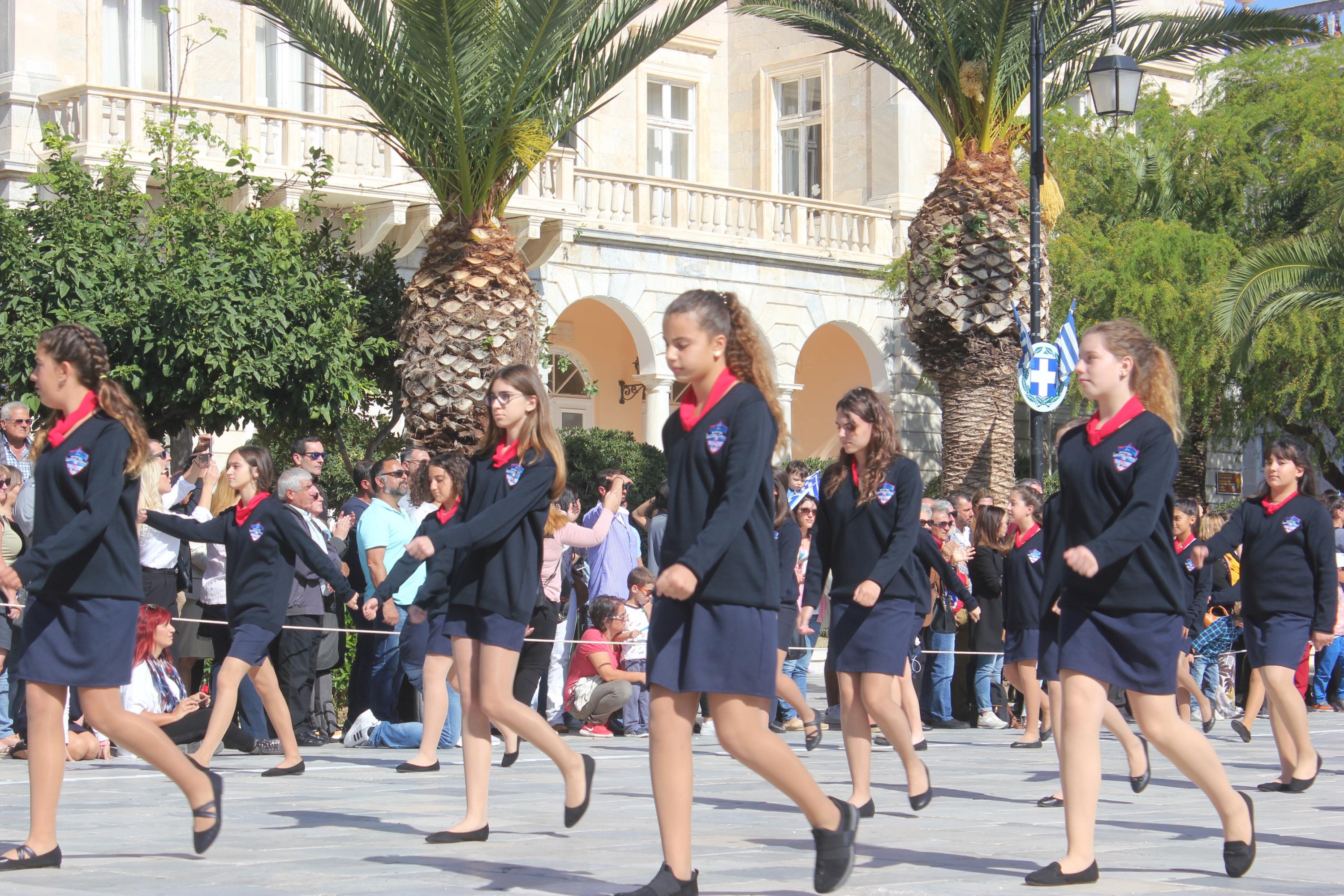 Οι εκδηλώσεις ολοκληρώθηκαν με την καθιερωμένη μαθητική παρέλαση στην πλατεία Μιαούλη. Επικεφαλής της παρέλασης ήταν και φέτος η Φιλαρμονική Δήμου Σύρου – Ερμούπολης, ενώ συμμετείχαν επίσης το Λύκειο Ελληνίδων Σύρου, ο Σύλλογος Μικρασιατών Ερμούπολης Σύρου, ο Σύλλογος Ποντίων και Βορειοελλαδιτών Σύρου «Ο ΕΥΞΕΙΝΟΣ ΠΟΝΤΟΣ», ο Ναυτικός Όμιλος Σύρου, ο Αθλητικός Σύλλογος Tae Kwon Do Ερμούπολης, το Σώμα Ελλήνων Προσκόπων, οι σπουδαστές της Ακαδημίας Εμπορικού Ναυτικού Σύρου και ένοπλο πεζοπόρο τμήμα του Τάγματος Εθνοφυλακής Ερμούπολης.