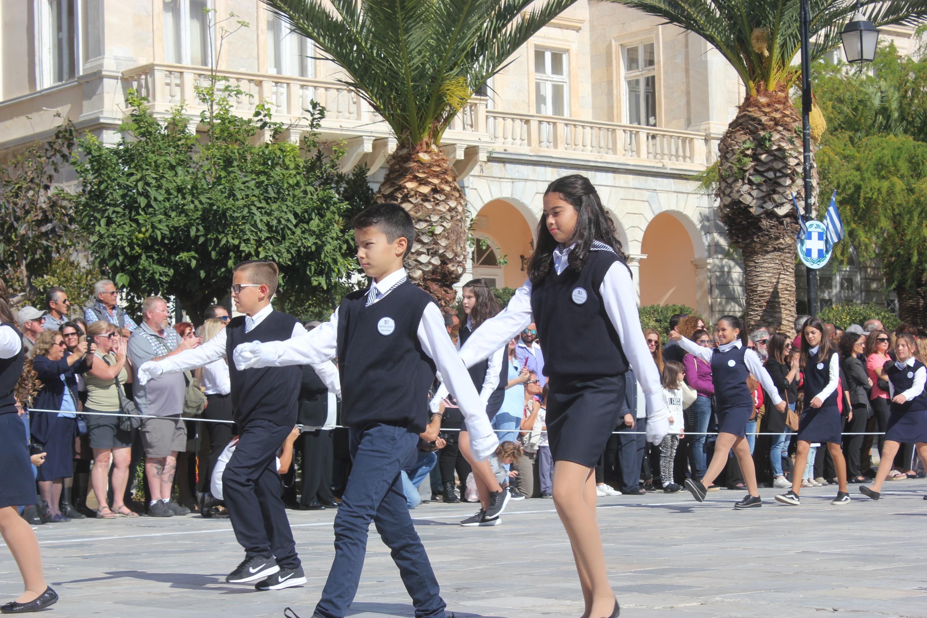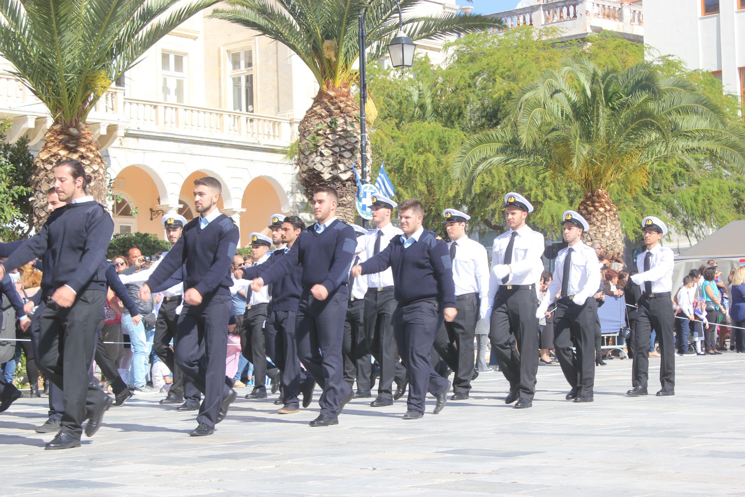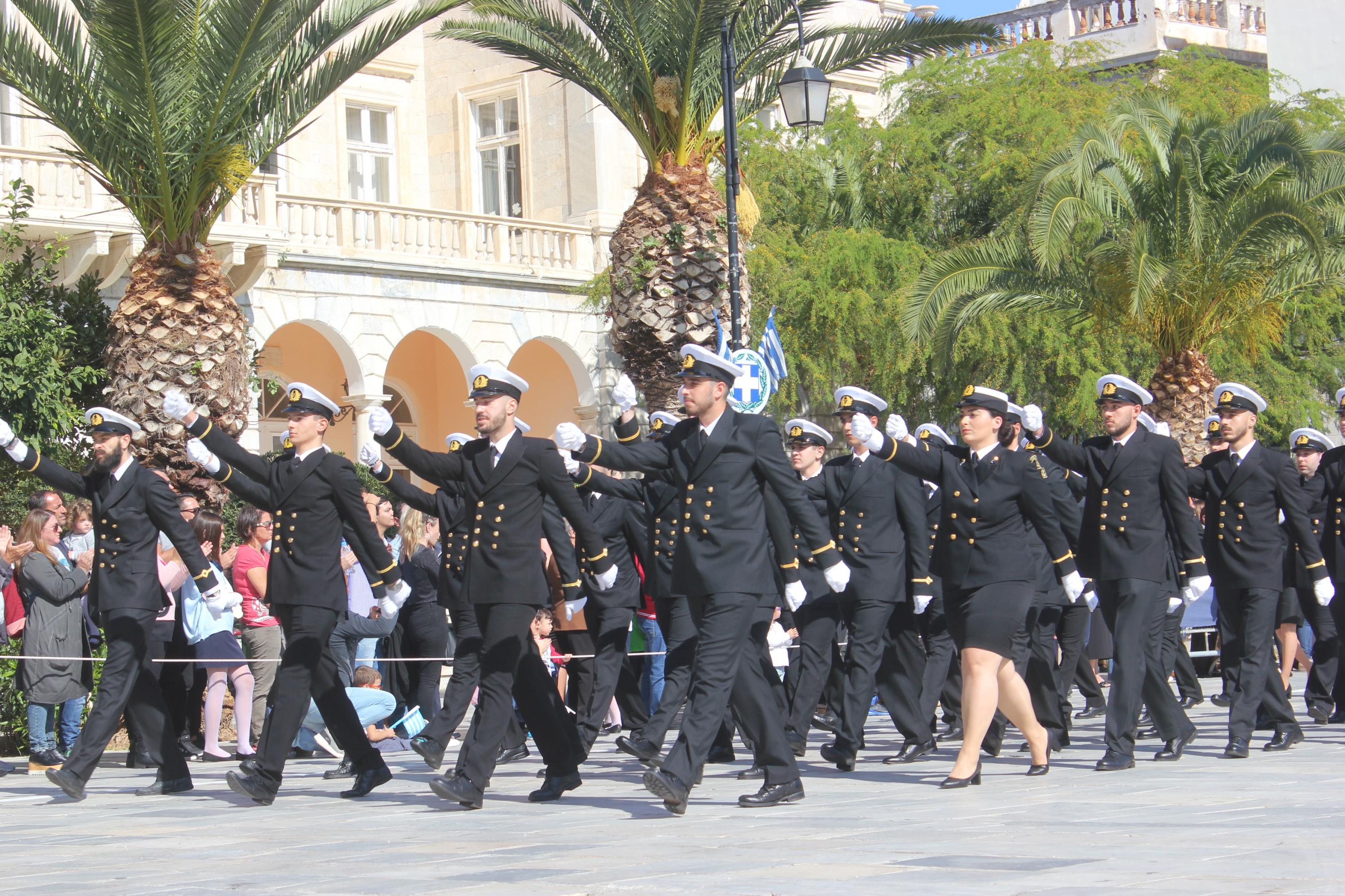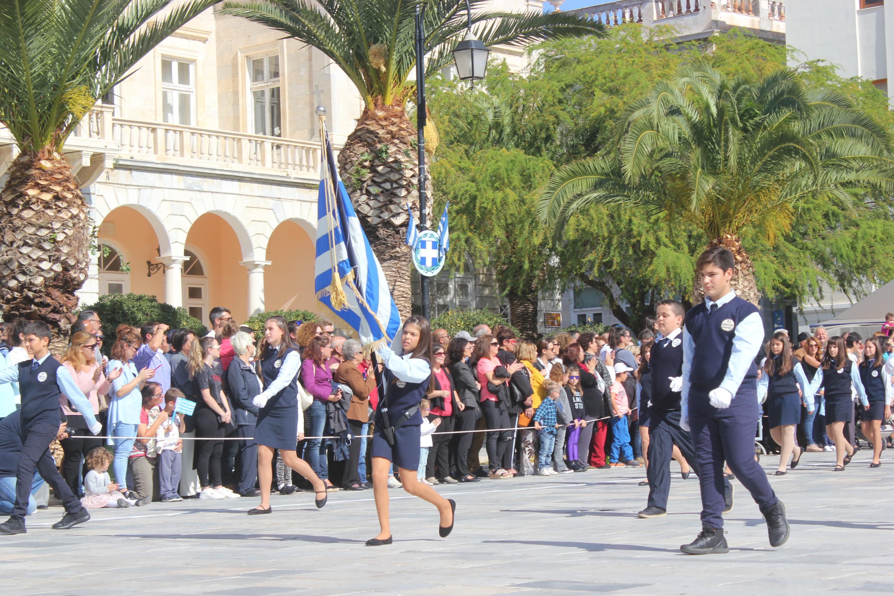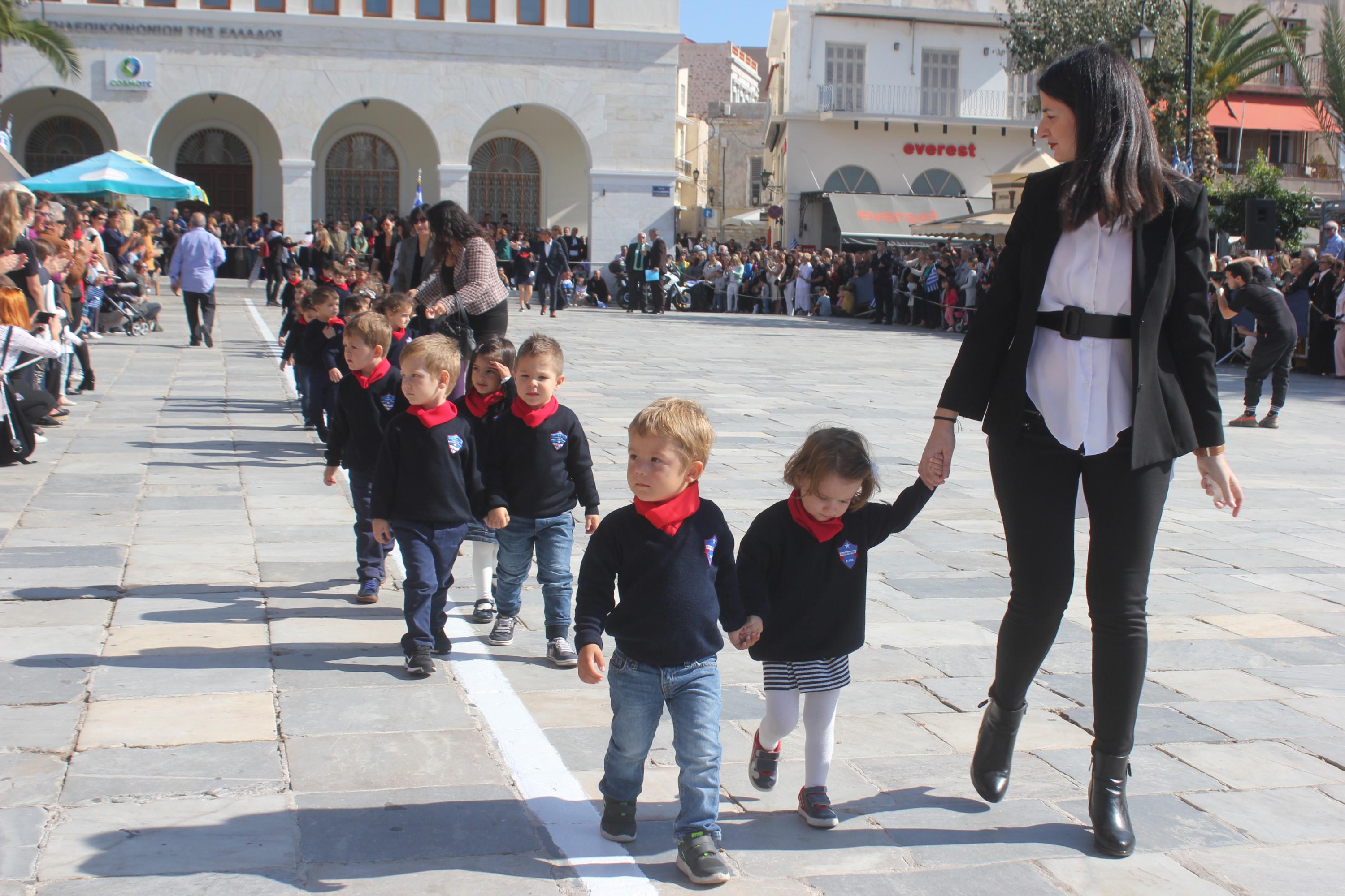 Οι εκδηλώσεις ολοκληρώθηκαν με την καθιερωμένη μαθητική παρέλαση στην πλατεία Μιαούλη. Επικεφαλής της παρέλασης ήταν και φέτος η Φιλαρμονική Δήμου Σύρου – Ερμούπολης, ενώ συμμετείχαν επίσης το Λύκειο Ελληνίδων Σύρου, ο Σύλλογος Μικρασιατών Ερμούπολης Σύρου, ο Σύλλογος Ποντίων και Βορειοελλαδιτών Σύρου «Ο ΕΥΞΕΙΝΟΣ ΠΟΝΤΟΣ», ο Ναυτικός Όμιλος Σύρου, ο Αθλητικός Σύλλογος Tae Kwon Do Ερμούπολης, το Σώμα Ελλήνων Προσκόπων, οι σπουδαστές της Ακαδημίας Εμπορικού Ναυτικού Σύρου και ένοπλο πεζοπόρο τμήμα του Τάγματος Εθνοφυλακής Ερμούπολης.