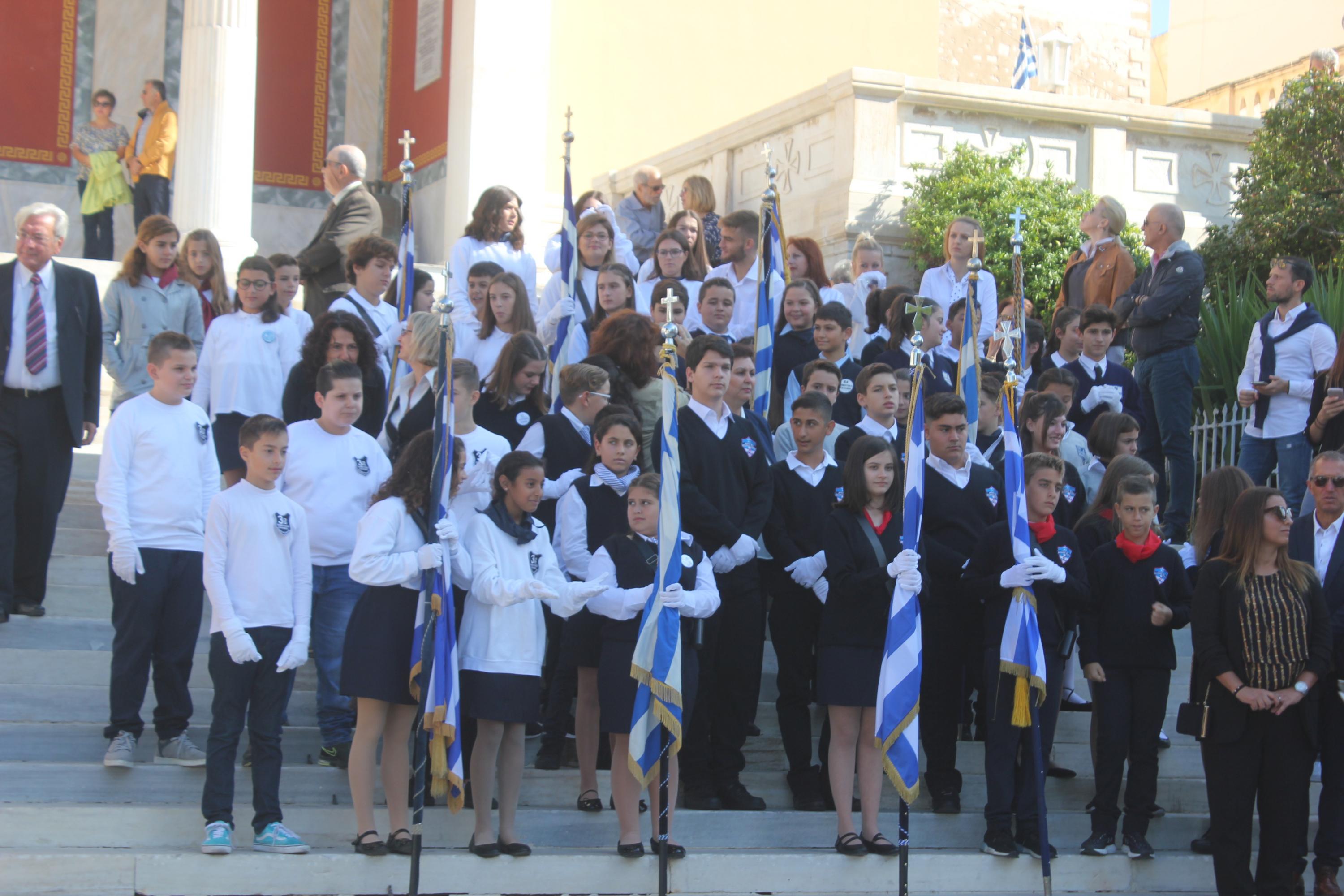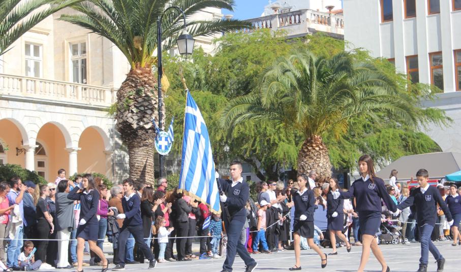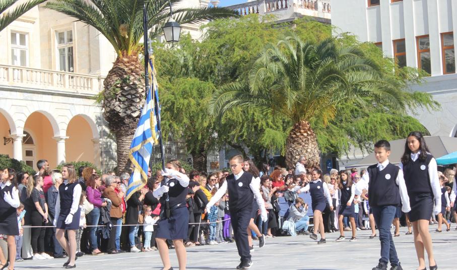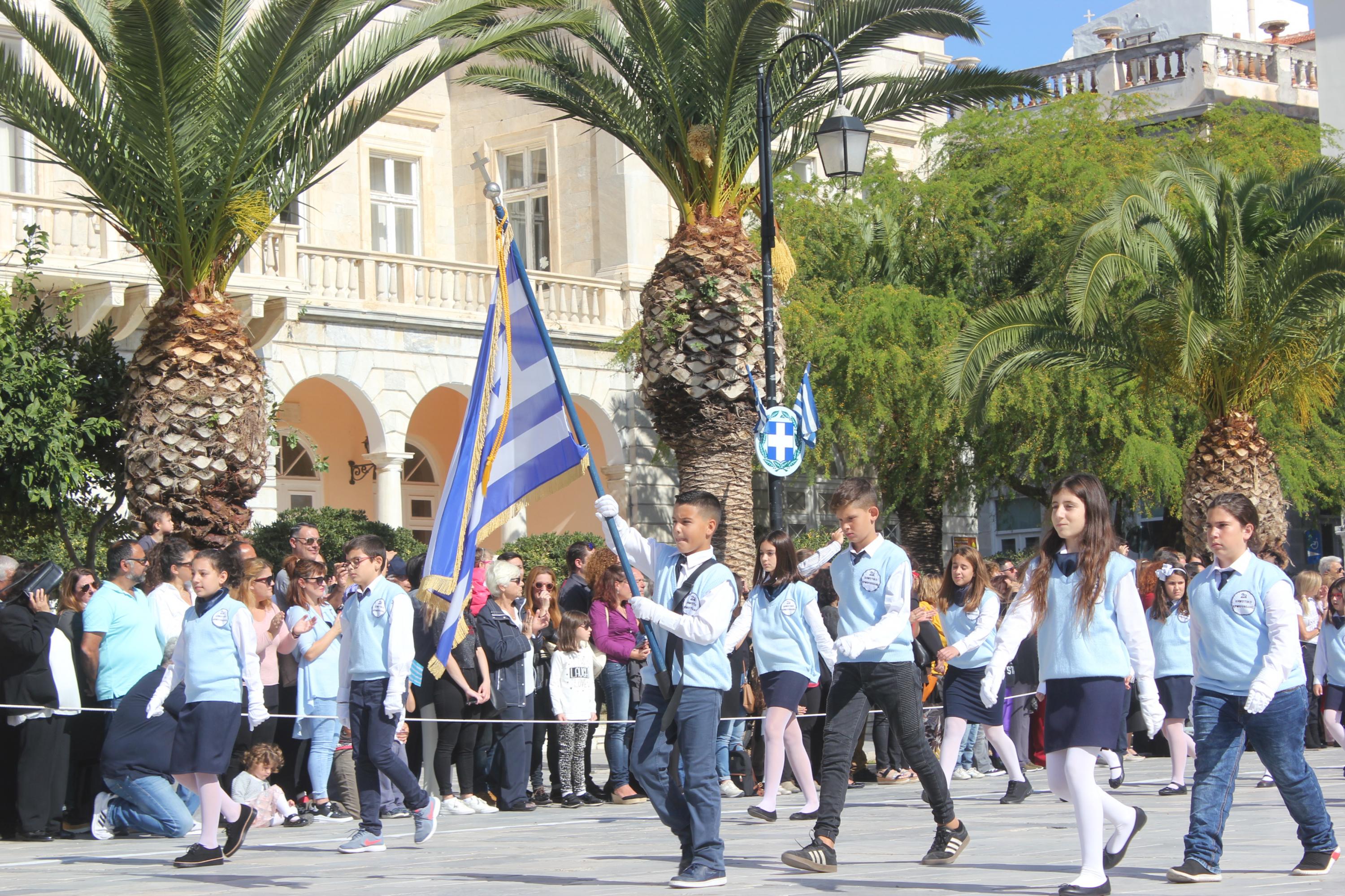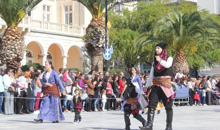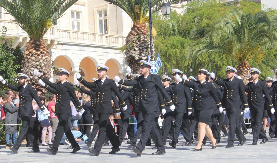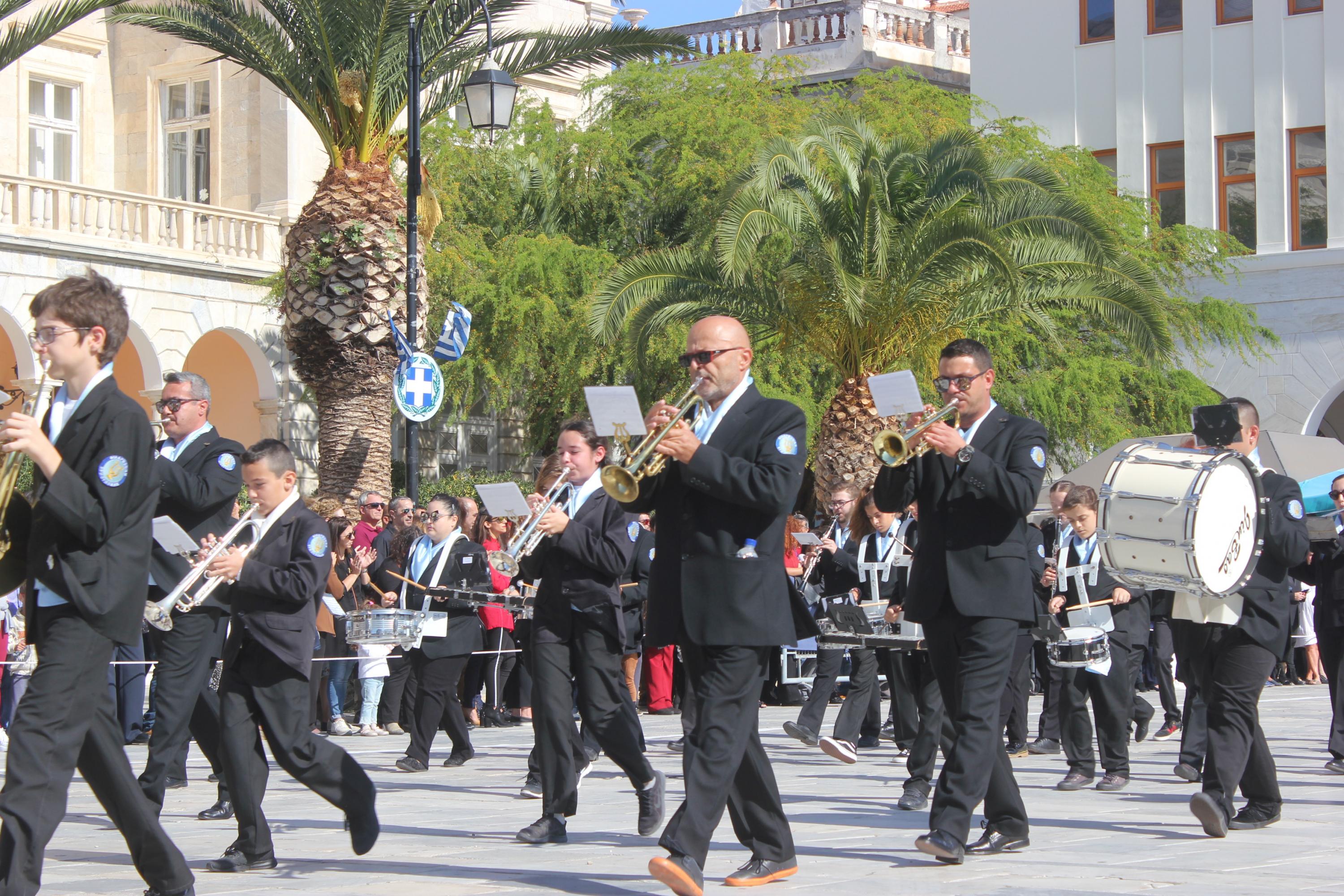 Οι εκδηλώσεις ολοκληρώθηκαν με την καθιερωμένη μαθητική παρέλαση στην πλατεία Μιαούλη. Επικεφαλής της παρέλασης ήταν και φέτος η Φιλαρμονική Δήμου Σύρου – Ερμούπολης, ενώ συμμετείχαν επίσης το Λύκειο Ελληνίδων Σύρου, ο Σύλλογος Μικρασιατών Ερμούπολης Σύρου, ο Σύλλογος Ποντίων και Βορειοελλαδιτών Σύρου «Ο ΕΥΞΕΙΝΟΣ ΠΟΝΤΟΣ», ο Ναυτικός Όμιλος Σύρου, ο Αθλητικός Σύλλογος Tae Kwon Do Ερμούπολης, το Σώμα Ελλήνων Προσκόπων, οι σπουδαστές της Ακαδημίας Εμπορικού Ναυτικού Σύρου και ένοπλο πεζοπόρο τμήμα του Τάγματος Εθνοφυλακής Ερμούπολης.