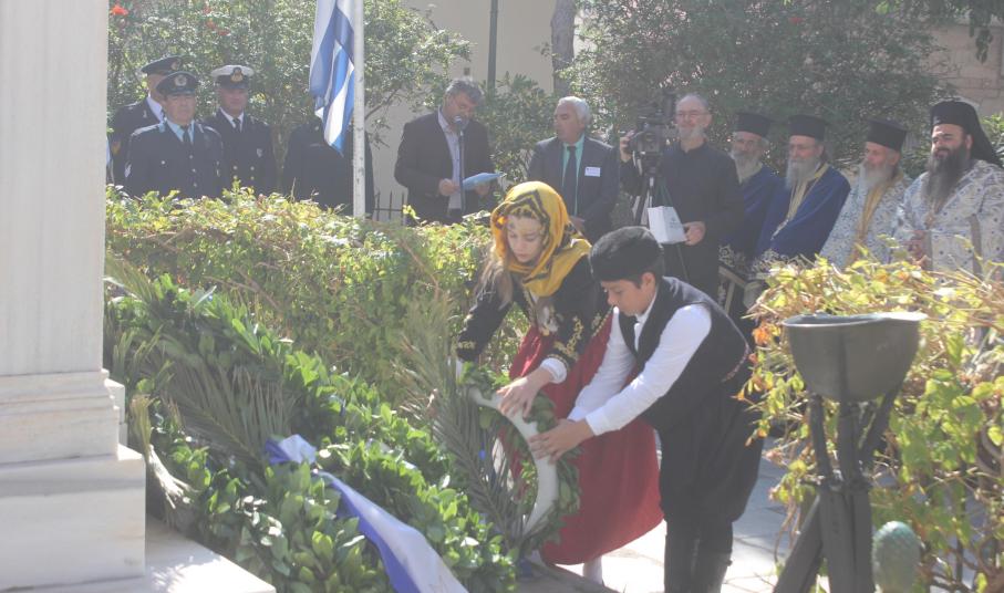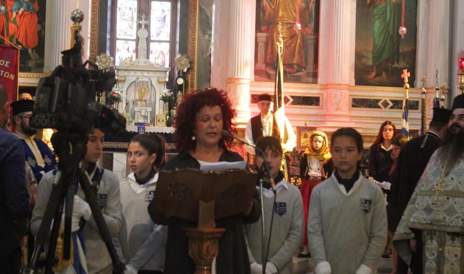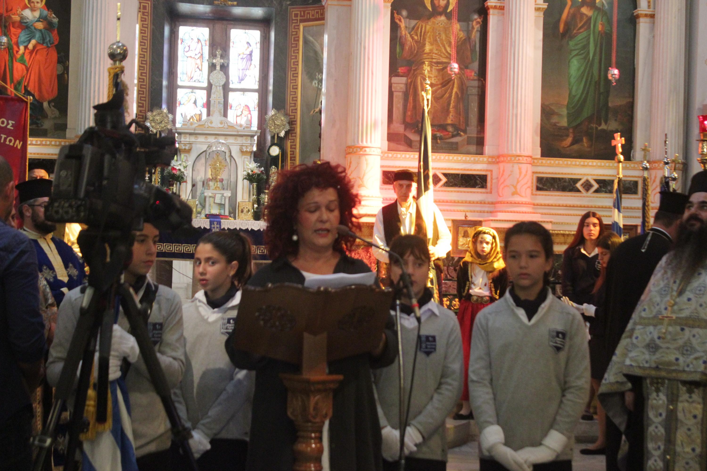 Στη συνέχεια, αναγνώστηκε ο Πανηγυρικός της Ημέρας από την εκπαιδευτικό Πρωτοβάθμιας Εκπαίδευσης Ελισάβετ Αποστολίδου και τελέστηκε επιμνημόσυνη δέηση στο Εθνικό Ηρώο της πόλης, προ του ναού.
