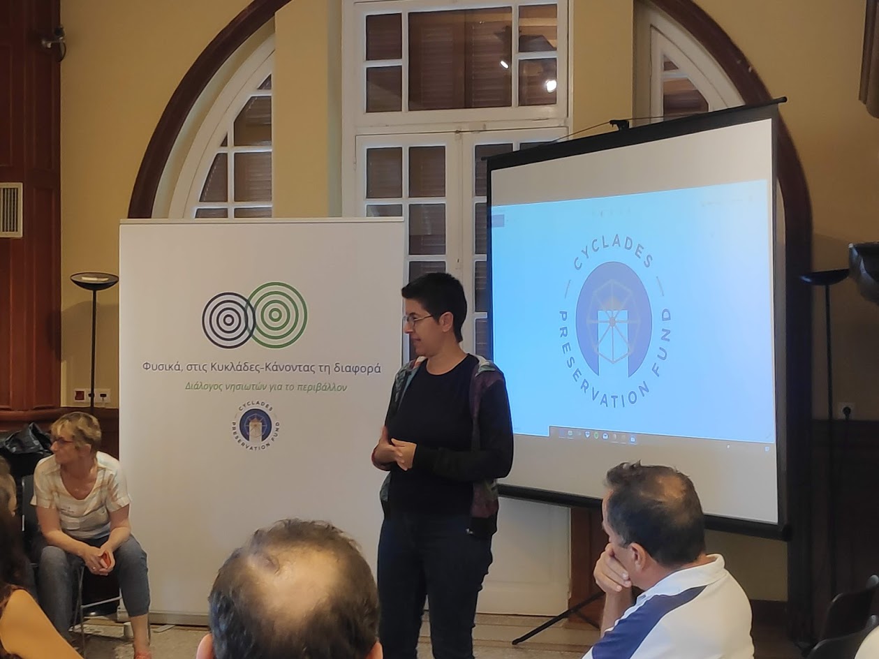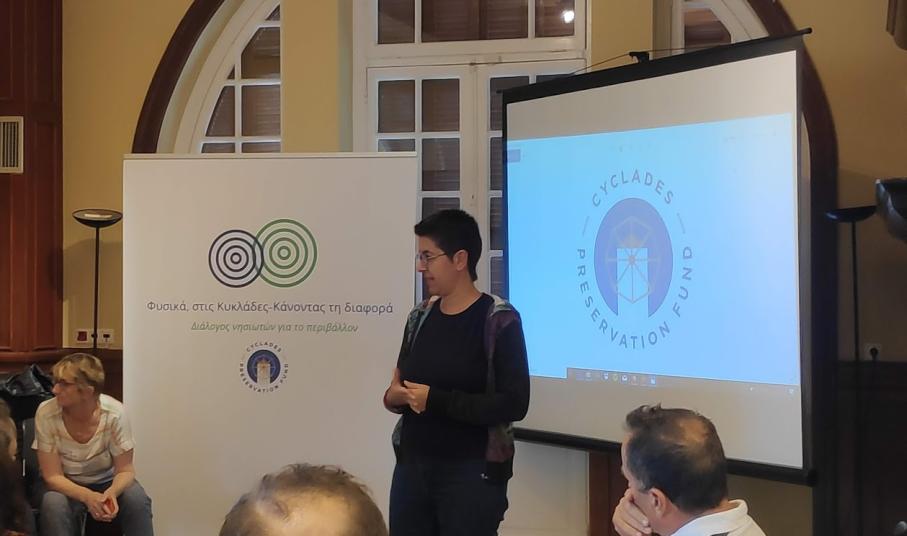 Τον κύκλο των χαιρετισμών έκλεισε η η Τοπική Διευθύντρια του Cyclades Preservation Fund, κ. Άννυ Μητροπούλου, η οποία εξήγησε, πως σκοπός της συνάντησης των εκπροσώπων των φορέων, είναι «να αναγνωρίσουμε, να χαρτογραφήσουμε ανά νησί αυτούς που εμείς ονομάζουμε “local champions”, δηλαδή ανθρώπους, επενδυτές, φορείς, πρωτοβουλίες, συλλογικότητες, που ήδη δραστηριοποιούνται στο νησί τους στην κατεύθυνση της βιωσιμότητας – αν μπορούμε να χρησιμοποιήσουμε τον όρο αυτό για γενικότερο επίπεδο – είτε αυτό έχει να κάνει με την κυκλική οικονομία και τη διαχείριση των απορριμμάτων, είτε έχει να κάνει με την προστασία της βιοποικιλότητας, την προστασία της χλωρίδας και της πανίδας, είτε έχουν αναλάβει δράσεις για θέματα που σχετίζονται με τον οικολογικό τουρισμό και τις ήπιες μορφές του, όπως είναι τα μονοπάτια».