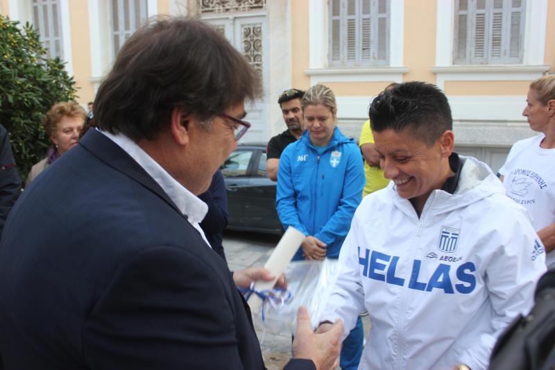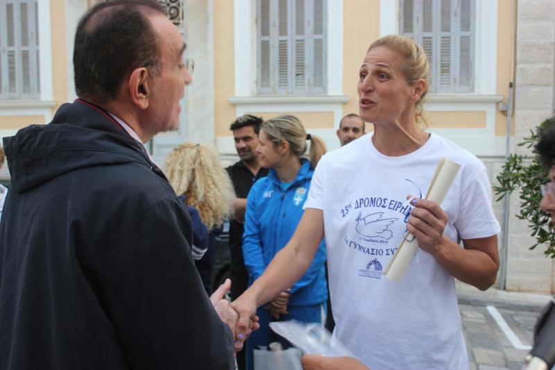 Η Ολυμπιονίκης του στίβου, Δήμητρα Ντόβα, η οποία τα τελευταία χρόνια συμμετέχει σταθερά στον «Δρόμο Ειρήνης», παρέλαβε το αναμνηστικό της από τον Δήμαρχο Σύρου – Ερμούπολης, Νίκο Λειβαδάρα. Η ίδια είναι σπρίντερ με ειδίκευση στα αγωνίσματα των 200 και 400 μέτρων. Διακρίθηκε σε Πανελλήνιους και Πανευρωπαϊκούς αγώνες, ενώ κέρδισε χρυσό μετάλλιο στα 400 μέτρα στους Μεσογειακούς αγώνες 2005 στην Αλμερία. Εκπροσώπησε την Ελλάδα στους Θερινούς Ολυμπιακούς Αγώνες 2004, κατακτώντας μετά από περιπέτεια, την 8η θέση στους τελικούς.
