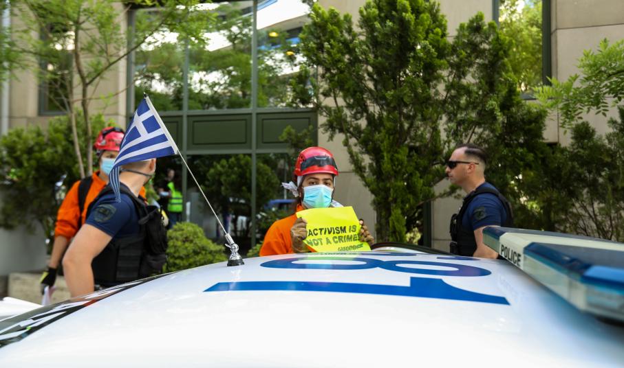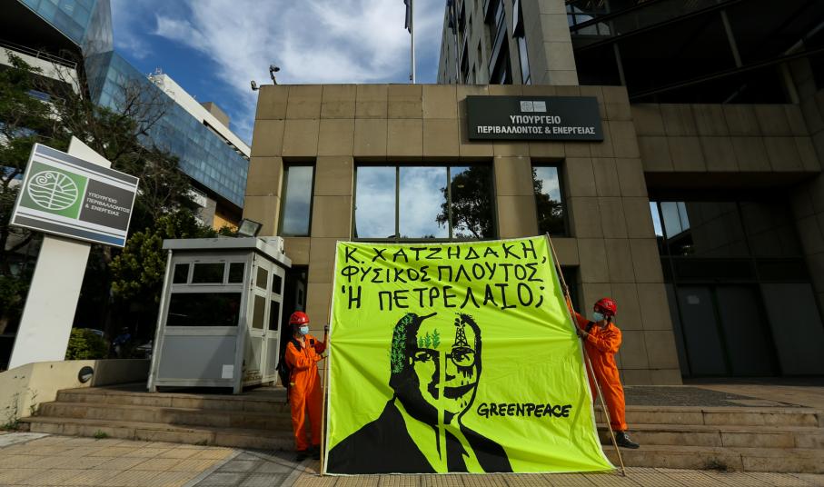 Ακτιβιστές της Greenpeace βρέθηκαν σήμερα το πρωί στο Υπουργείο Περιβάλλοντος και Ενέργειας για να στείλουν ένα ηχηρό μήνυμα στον Υπουργό, ζητώντας του να επιλέξει: “κ. Χατζηδάκη, φυσικός πλούτος ή πετρέλαιο;”. Στην προσπάθειά τους να αναρτήσουν πανό στην κεντρική πρόσοψη του κτιρίου του Υπουργείου και να εκφράσουν ειρηνικά την αντίδρασή τους στο νέο περιβαλλοντικό νόμο, η αστυνομία απάντησε με προσαγωγές 4 ακτιβιστών. Η Greenpeace, με αυτήν την ειρηνική δράση της, ενώνει τη φωνή της με χιλιάδες πολίτες από όλη τη χώρα που αντιδρούν στον νέο περιβαλλοντικό νόμο και συμμετέχουν στη σημερινή Ημέρα Δράσης[1], ο καθένας με τον δικό του ειρηνικό τρόπο. Κοινός παρονομαστής η απαίτηση από τον Υπουργό, κ. Χατζηδάκη να ξεκαθαρίσει αν θα ανταποκριθεί στον θεσμικό του ρόλο και θα προστατέψει το φυσικό περιβάλλον της χώρας ή θα συνεχίσει να υποστηρίζει ως “περιβαλλοντικό εκσυγχρονισμό” την ακόμα μεγαλύτερη υποβάθμιση του περιβάλλοντος, φιμώνοντας παράλληλα την κοινωνία που αγωνιά για το μέλλον της.