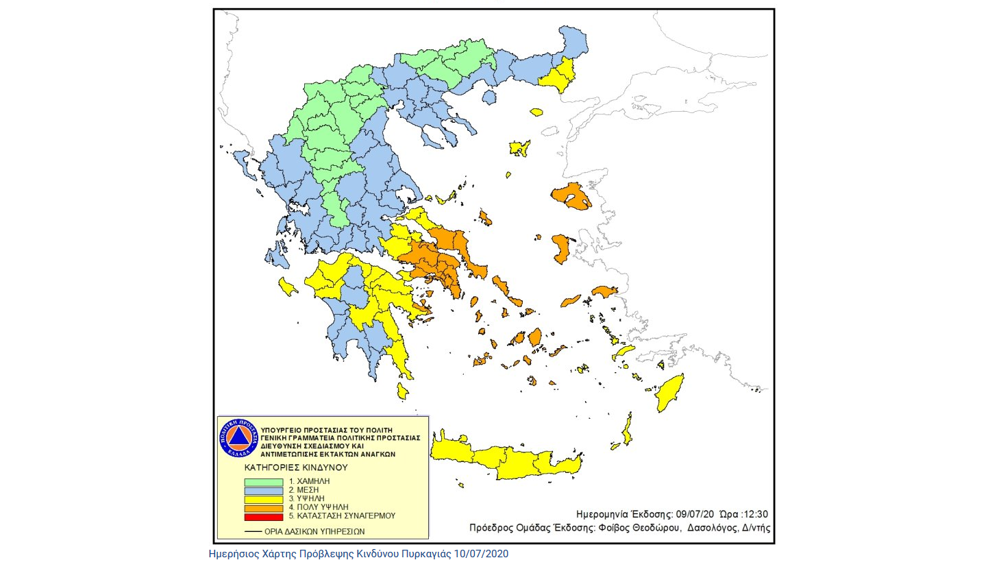 Η Αυτοτελής Διεύθυνση Πολιτικής Προστασίας της Περιφέρειας Νοτίου Αιγαίου ενημερώνει ότι την Παρασκευή 10-7-2020, σύμφωνα με τον Ημερήσιο Χάρτη Πρόβλεψης Κινδύνου Πυρκαγιάς που συντάσσει η Διεύθυνση Σχεδιασμού και Αντιμετώπισης Έκτακτων Αναγκών της Γενικής Γραμματείας Πολιτικής Προστασίας, ο κίνδυνος για την εκδήλωση πυρκαγιών στην Περιφέρεια Νοτίου Αιγαίου (Π.Ε. Κυκλάδων) είναι πολύ υψηλός (Κατηγορία κινδύνου 4) και όλες οι αρμόδιες υπηρεσίες βρίσκονται σε κατάσταση αυξημένης ετοιμότητας.