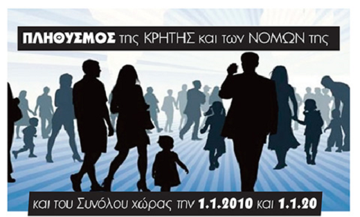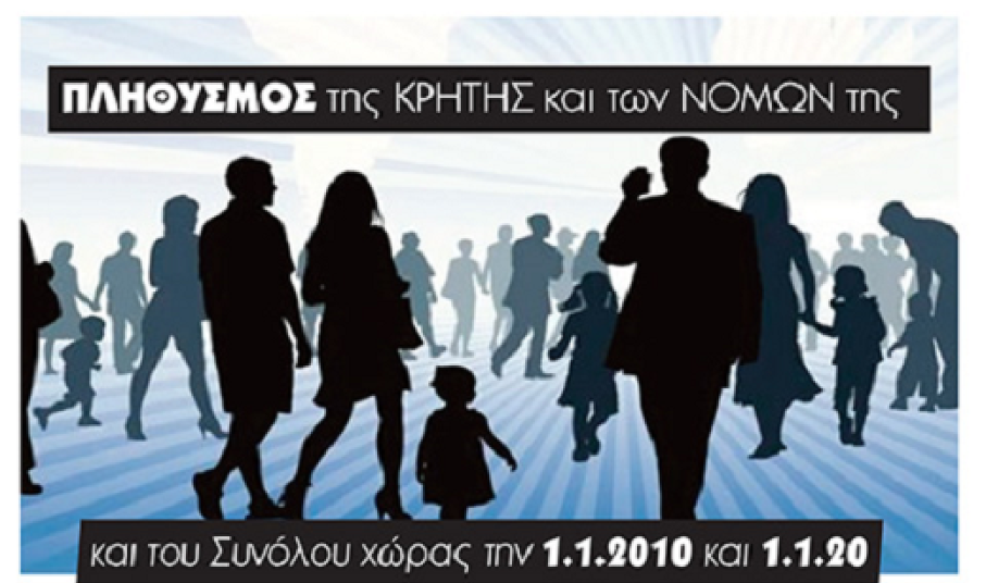 Τα στοιχεία αυτά σε συνδυασμό με τα αντίστοιχα στοιχεία τη ΕΛΣΤΑΤ τα έτη 2010-2019 μας δίνουν τη δυνατότητα να εξετάσουμε τις μεταβολές του πληθυσμού της Κρήτης και των νομών της σε σχέση με εκείνες του Συνόλου (με αναφορές στις άλλες περιφέρειες και νομούς της χώρας) τη δεκαετία των Μνημονίων.
