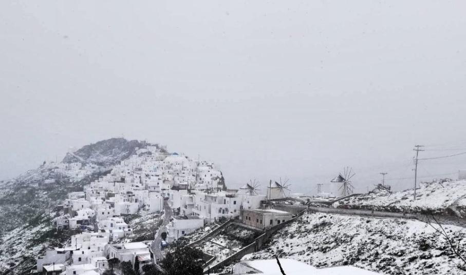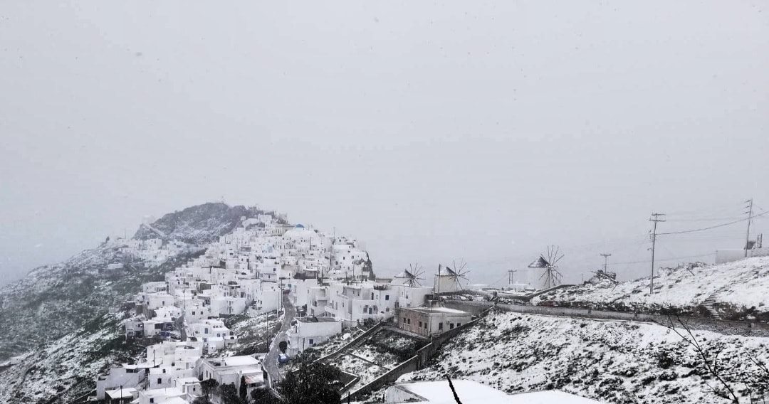 Η «Μήδεια» σε πλήρη ένταση την Τρίτη, 16 Φεβρουαρίου, “αγκάλιασε” τις Κυκλάδες, με πολλά νησιά να ντύνονται στα λευκά, ιδιαίτερα στις ορεινές και ημιορεινές περιοχές, όπως ο Πιττορφός της Άνδρου, η Κόρωνος και η Απείρανθος της Νάξου, η Χώρα της Σερίφου, η Πέρα Μεριά της Κέας και η Χώρα της Αμοργού.