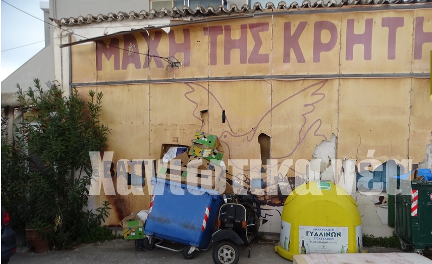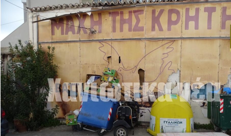 Σκισμένη και με μπροστά της τους κάδους των απορριμμάτων η επετειακή αφίσα για τη μάχη της Κρήτης στην πλατεία του Γαλατά.