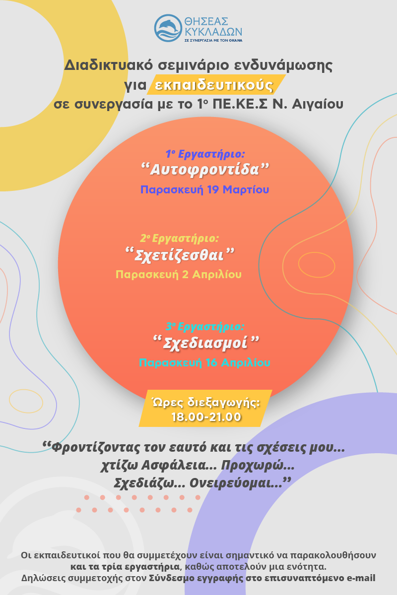 Τo Κέντρο Πρόληψης των Εξαρτήσεων και Προαγωγής της Ψυχοκοινωνικής Υγείας «ΘΗΣΕΑΣ ΚΥΚΛΑΔΩΝ» σε συνεργασία με το 1ο ΠΕ.ΚΕ.Σ Νοτίου Αιγαίου διοργανώνει διαδικτυακό σεμινάριο ενδυνάμωσης για εκπαιδευτικούς όλων των βαθμίδων, με τίτλο: “Φροντίζοντας τον εαυτό και τις σχέσεις μου… χτίζω Ασφάλεια… Προχωρώ… Σχεδιάζω… Ονειρεύομαι…”