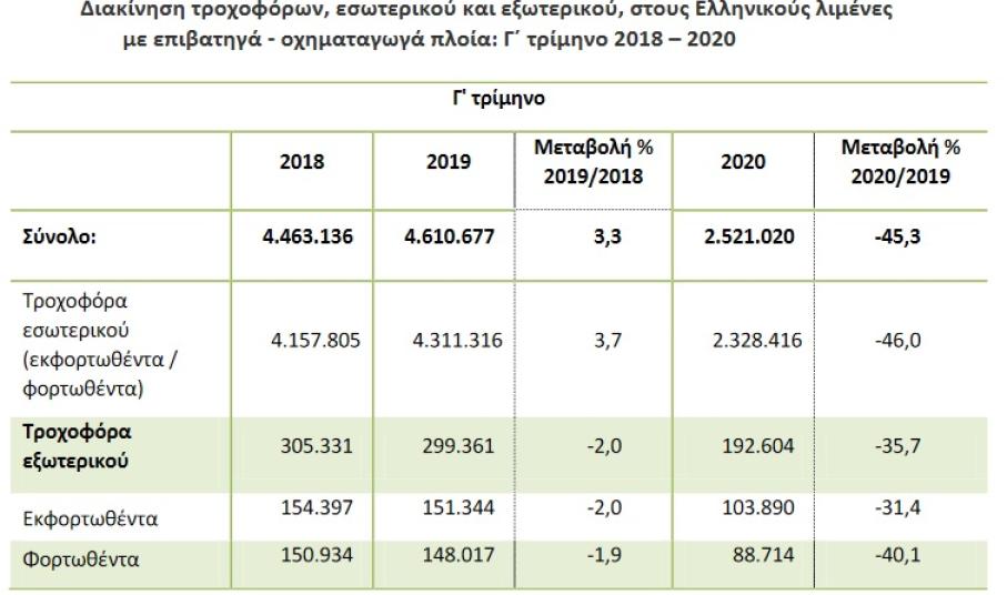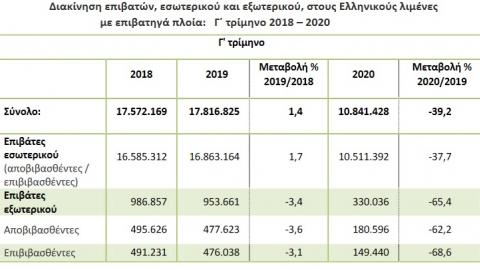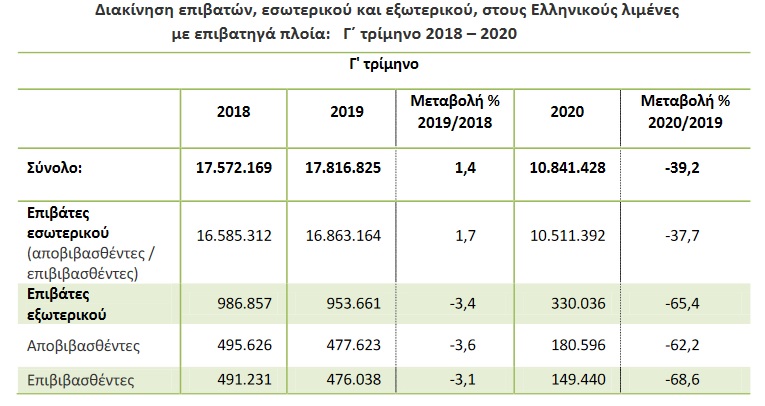 Η συνολική διακίνηση επιβατών στους Ελληνικούς λιμένες το γ΄ τρίμηνο 2020, σε σύγκριση με το γ΄ τρίμηνο του 2019, παρουσίασε μείωση κατά 39,2%, ενώ κατά την αντίστοιχη σύγκριση του γ΄ τριμήνου 2019 προς το γ΄ τρίμηνο 2018 παρατηρήθηκε αύξηση κατά 1,4%.