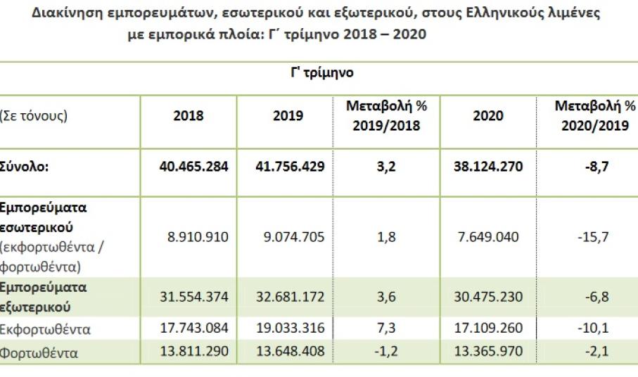 Η συνολική διακίνηση εμπορευμάτων στους Ελληνικούς λιμένες το γ΄ τρίμηνο 2020, σε σύγκριση με το γ΄ τρίμηνο του 2019, παρουσίασε μείωση κατά 8,7%, ενώ κατά την αντίστοιχη σύγκριση του γ΄ τριμήνου 2019 προς το γ΄ τρίμηνο 2018 παρατηρήθηκε αύξηση κατά3,2%.