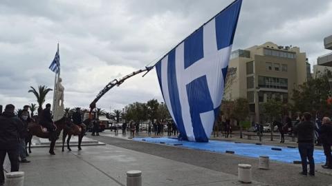 Γεωργαλίδικα άλογα και έφιπποι Κρητικοί συνόδεψαν την τεράστια ελληνική σημαία στην πλατεία Αγνώστου Στρατιώτη υπό τους ήχους του εθνικού ύμνου.