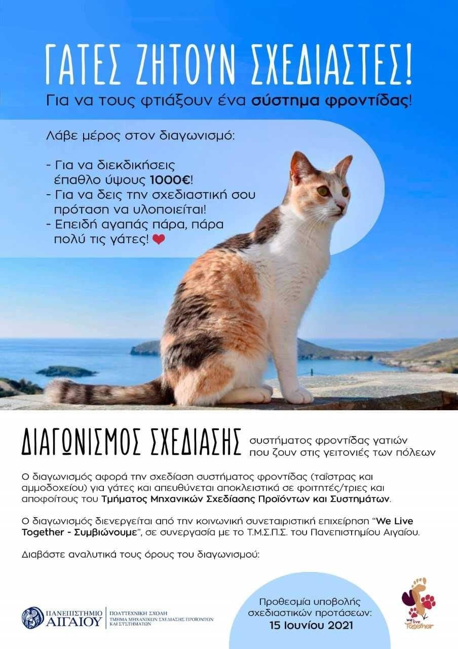 Τις δυνάμεις τους για την καλύτερη δυνατή περιποίηση των αδέσποτων γατιών που ζουν στις γειτονιές των πόλεων, καθώς και την αισθητική αναβάθμιση των εν λόγω περιοχών, ενώνουν το Τμήμα Μηχανικών Σχεδίασης Προϊόντων και Συστημάτων του Πανεπιστημίου Αιγαίου και η Κοινωνική Συνεταιριστική Επιχείρηση «We Live Together – Συμβιώνουμε”.