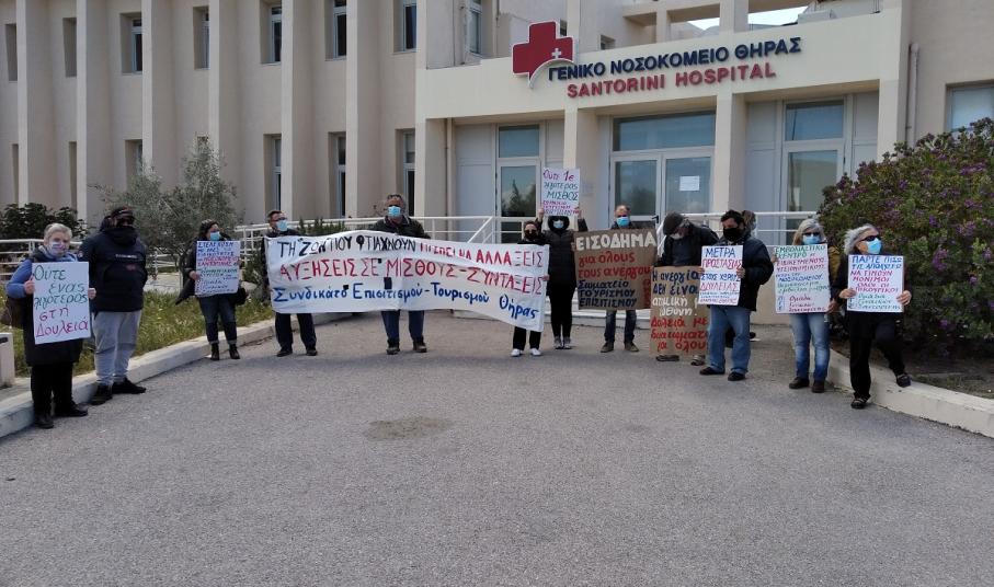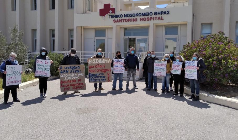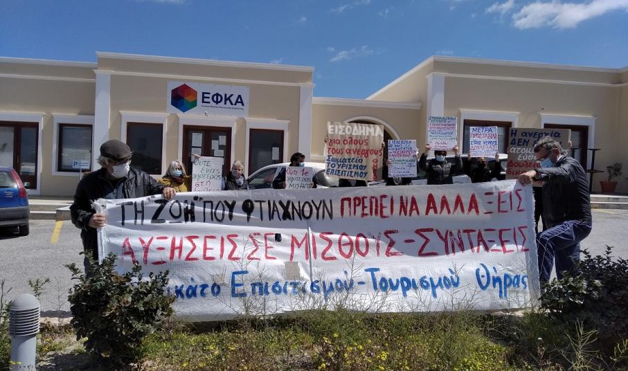 Στη Σαντορίνη πραγματοποιήθηκε κινητοποίηση έξω από τον ΕΦΚΑ Θήρας, στην οποία καλούσε το Συνδικάτο Επισιτισμού Τουρισμού και Συναφών Επαγγελμάτων Επαρχίας Θήρας και την οποία στήριξε και η Ομοσπονδία Γυναικών Ελλάδας. Παραδόθηκαν ψηφίσματα στη διοίκηση του ΕΦΚΑ και στο Δήμο Θήρας, ενώ η κινητοποίηση συνεχίστηκε στο Γενικό Νοσοκομείο Θήρας με τη συμμετοχή αντιπροσωπείας εργαζομένων του νοσοκομείου, με αιτήματα για ενίσχυση των αγροτικών ιατρείων, στελέχωση με μόνιμο προσωπικό του νοσοκομείου, παράταση των συμβάσεων των επικουρικών εργαζομένων που εν μέσω πανδημίας απολύονται.