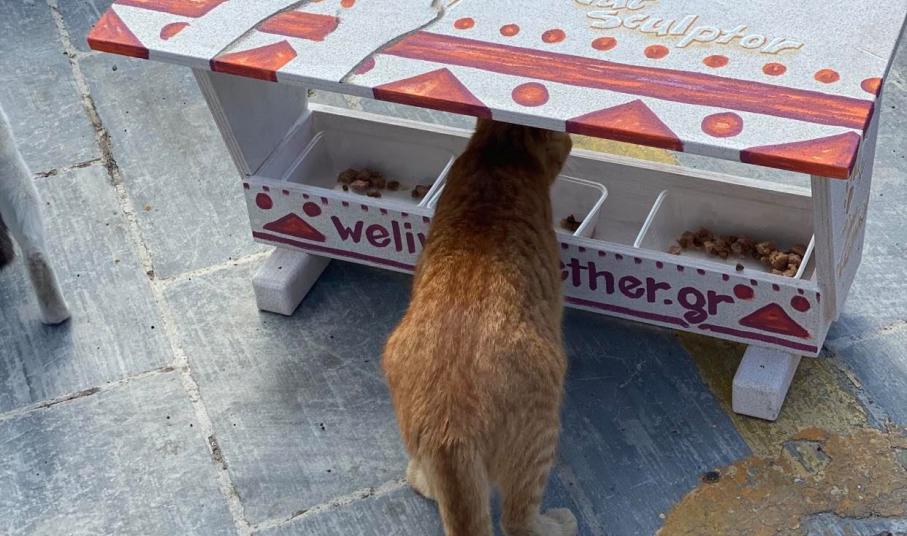 Πριν από λίγες ημέρα τοποθετήθηκε σε κεντρικό σημείο της Χώρας Τήνου η ταΐστρα που φέρει την υπογραφή του «Γατούλη Χαλεπά». Εκεί, συγκεντρώνονται κάθε πρωί στις 11 ένα τσούρμο γάτες, περιμένοντας τη Λήδα να τις φροντίσει. Κονσέρβες, ξηρά τροφή και απομονώνει μία γάτα από τις άλλες για να την ταΐσει μόνο κοτόπουλο.