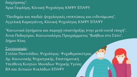 Το ΕΠΑΨΥ διοργανώνει διαδικτυακή ημερίδα με θέμα: ”Ψυχική Υγεία στην πανδημία και στη μετά-covid εποχή: Τρόποι υποστήριξης παιδιών και ενηλίκων”, στην οποία θα συμμετέχουν ο ψυχίατρος και οι ψυχολόγοι του κλιμακίου Κέας από την Κινητή Μονάδα Ψυχικής Υγείας ΕΠΑΨΥ και η κοινωνιολόγος του προγράμματος «Βοήθεια στο Σπίτι» του Δήμου Κέας.