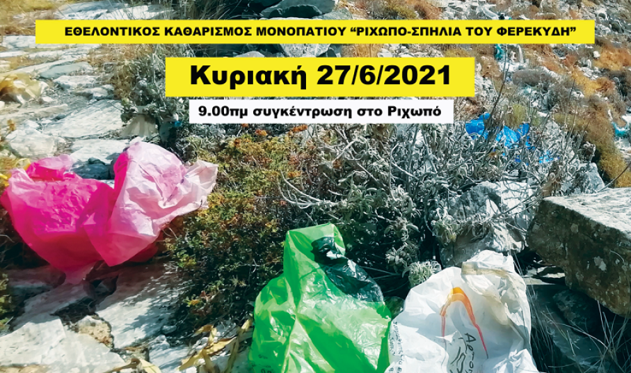 Ύστερα από την επιτυχημένη δράση καθαρισμού στις περιοχές Πανάχραντος, Πελεκανιά και Ανάσταση, είμαστε έτοιμοι για την δεύτερη δράση, αυτή τη φορά με πολύ μεγαλύτερο βαθμό δυσκολίας αλλά και ακόμα μεγαλύτερης σημασίας. Καλούμε τα μέλη, τους φίλους και κάθε πολίτη του νησιού σε εθελοντικό καθαρισμό της περιοχή γύρω από το μονοπάτι που οδηγεί στη σπηλιά του Φερεκύδη, με σημείο εκκίνησης το Ρηχωπό.