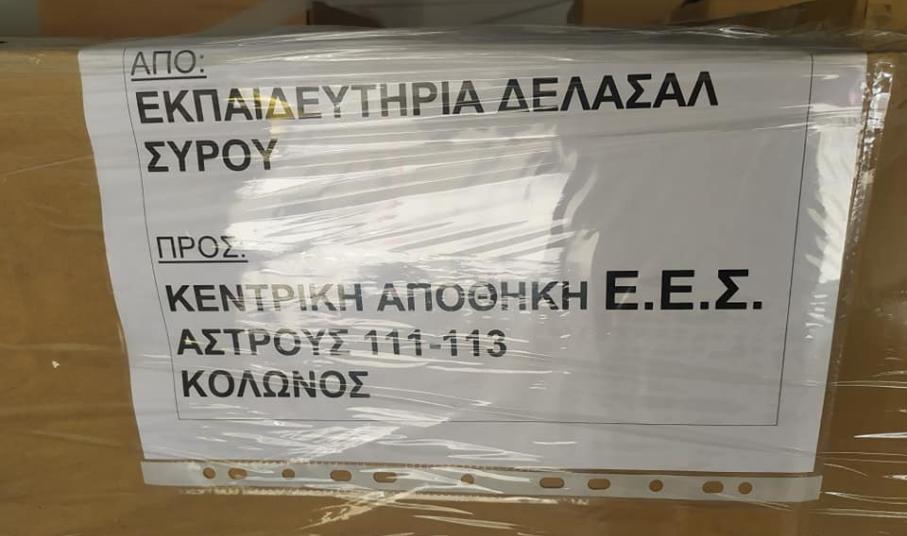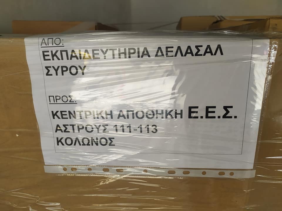 Αξίζει να σημειωθεί ότι πριν από τη δημιουργία αυτής της αλυσίδας, τα Εκπαιδευτήρια Δελασάλ Σύρου ήταν ο μόνος φορέας που είχε ήδη ξεκινήσει με δική του πρωτοβουλία τη συλλογή αγαθών με σκοπό να διατεθούν στις πυρόπληκτες περιοχές. Η διαδικασία αυτή ολοκληρώθηκαν χθες και οι εθελοντές των Εκπαιδευτηρίων συσκεύασαν και οργάνωσαν χθες την αποστολή των ειδών που συγκεντρώθηκαν. Μεταφορική εταιρεία του νησιού παρέλαβε τα αγαθά συσκευασμένα σε παλέτες για να τα παραδώσει στον Ελληνικό Ερυθρό Σταυρό.