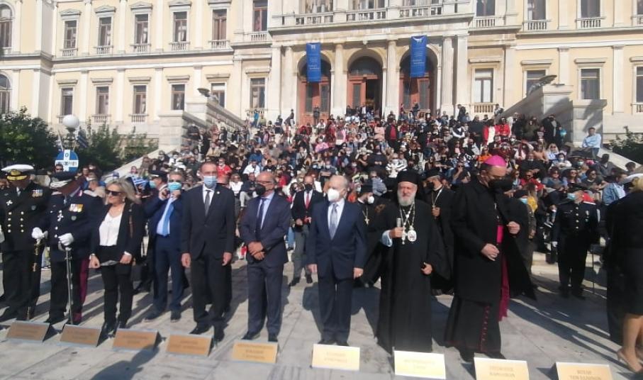 Ταυτόχρονα, παρουσία του Καθολικού Επισκόπου Σύρου Σεβ. π. Πέτρου Στεφάνου, του Γενικού Γραμματέα Επαγγελματικής Εκπαίδευσης, Κατάρτισης και Διά Βίου Μάθησης, Γεώργιου Βούτσινου, των βουλευτών Κυκλάδων, Γιάννη Βρούτση, Κατερίνας Μονογυιού, Φίλιππου Φόρτωμα, Νίκου Συρμαλένιου, εκπροσώπων των τοπικών αρχών, αλλά και αντιπροσωπειών της σχολικής κοινότητας της Σύρου, τελέστηκε στον Ιερό Ναό Αγίου Νικολάου, Επίσημη Δοξολογία, προεξάρχοντος του Σεβασμιωτάτου Μητροπολίτη Σύρου κ. Δωροθέου Β’.