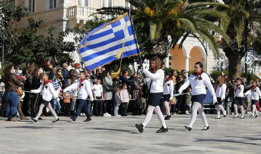Η παρέλαση άνοιξε με το Λύκειο Ελληνίδων Σύρου, θεματοφύλακα των παραδόσεων και της Εθνικής μας κληρονομιάς. Προηγήθηκε η σημαία του Συνδέσμου Αναπήρων και Θυμάτων Πολέμου φερόμενη τιμητικά από νέους και νέες του Λ.Ε.Σ.