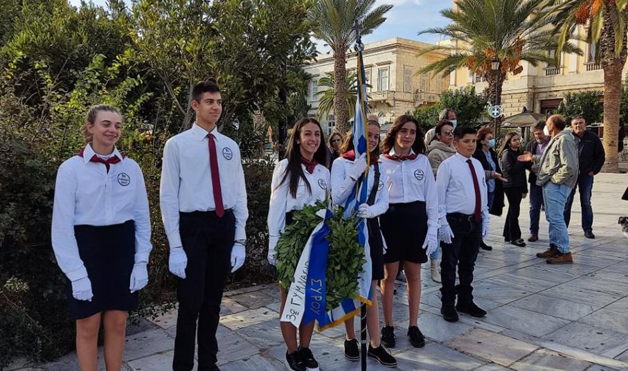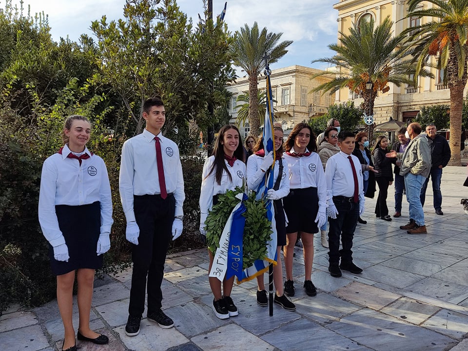 Παρουσία του Δημάρχου Σύρου – Ερμούπολης, Νίκου Λειβαδάρα πραγματοποιήθηκε η κατάθεση στεφάνων στο Ηρώο των Πεσόντων από μαθητές του ΕΠΑΛ Σύρου, του 4ου Πειραματικού Δημοτικού Σχολείου Ερμούπολης, του 5ου Δημοτικού Σχολείου Ερμούπολης, του Εσπερινού ΕΠΑΛ Σύρου και τους σπουδαστές και τις σπουδάστριες του Δημόσιου Ινστιτούτου Επαγγελματικής Κατάρτισης (ΔΙΕΚ) του Γενικού Νοσοκομείου Σύρου.
