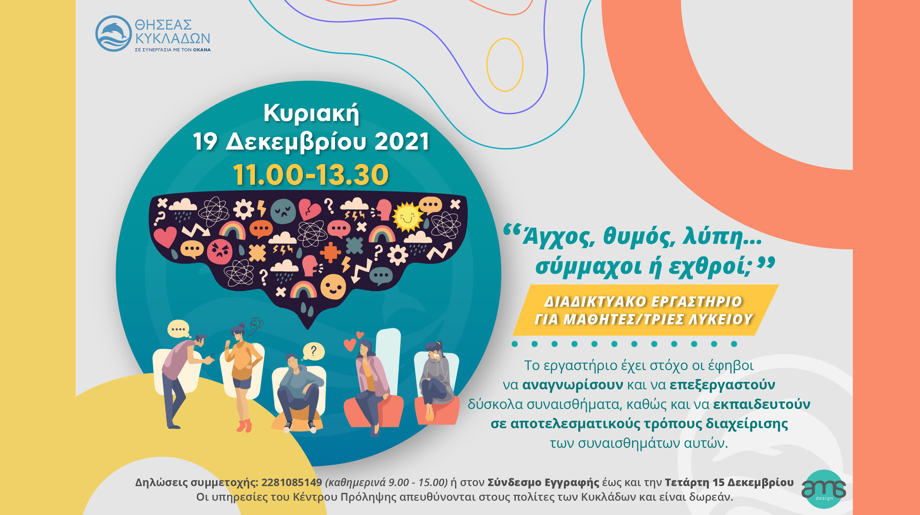 Το Κέντρο Πρόληψης «ΘΗΣΕΑΣ ΚΥΚΛΑΔΩΝ» προσκαλεί μαθητές/τριες Λυκείου να συμμετέχουν σε διαδικτυακό εργαστήριο την Κυριακή 19 Δεκεμβρίου 2021,  στις 11:00- 13:30 με τίτλο: «Άγχος, θυμός, λύπη… σύμμαχοι ή εχθροί;».