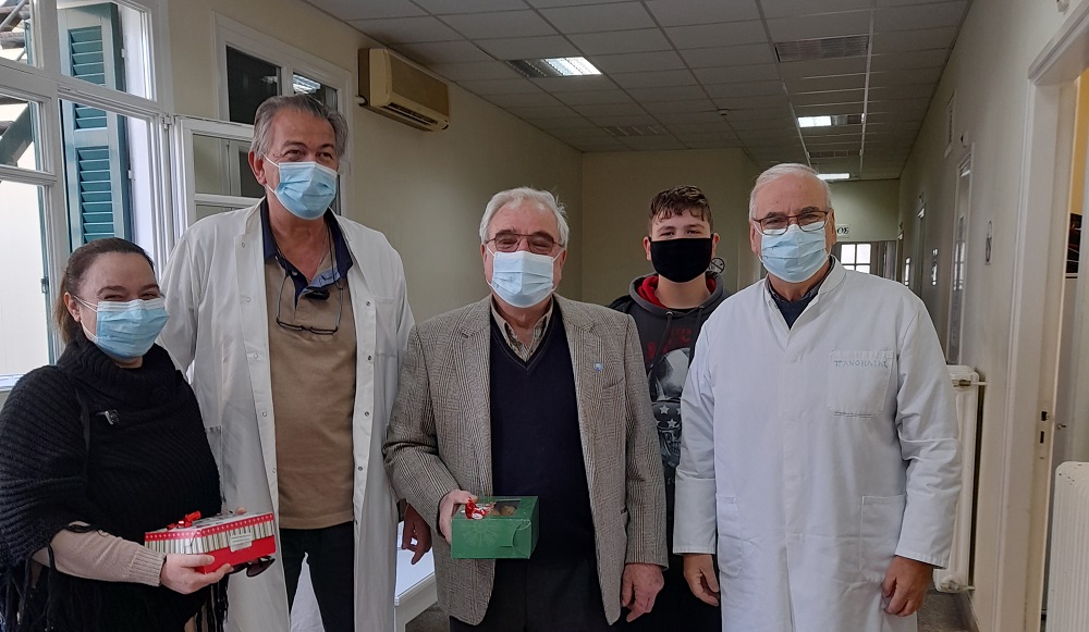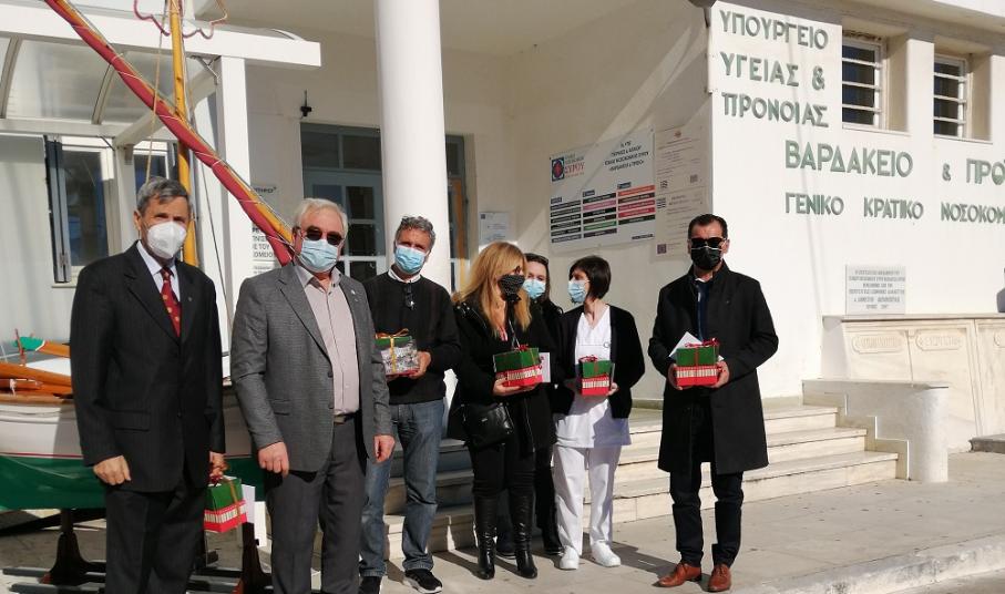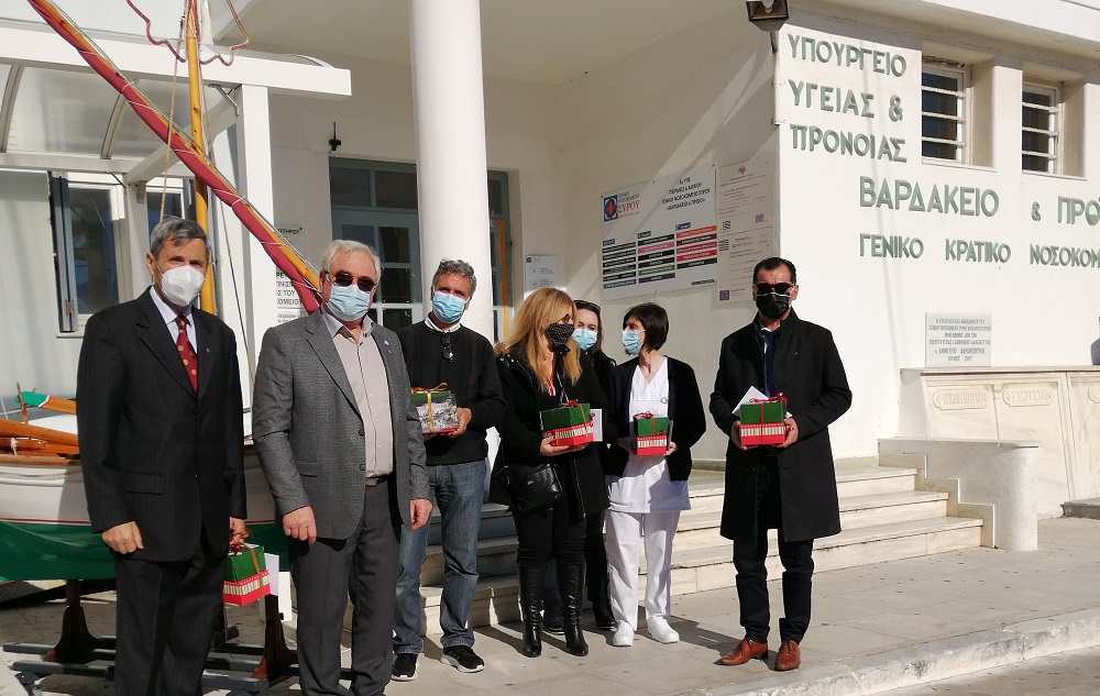 Την Παρασκευή 24 Δεκεμβρίου ο Πρόεδρος του Ροταριανού Ομίλου Ερμουπόλεως  και  το μέλος Δέσποινα Βούρτση επισκέφτηκαν  το Εμβολιαστικό Κέντρο του Κ.Υ. –Μ.Υ Ερμούπολης,  όπου ευχήθηκαν στο προσωπικό χρόνια πολλά, υγεία και δύναμη για να επιτελούν το επίπονο έργο τους προκειμένου να έχουμε ένα καλύτερο αύριο. Παράλληλα τους προσέφεραν τα πατροπαράδοτα γλυκά κουραμπιέδες και μελομακάρονα .