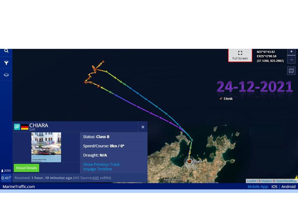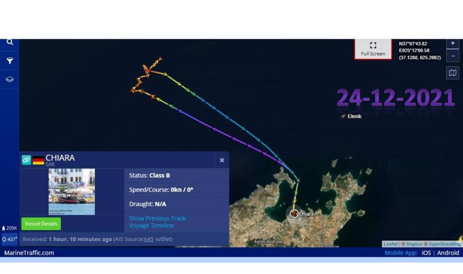 Μετά από κλήση του Λιμεναρχείου Πάρου, αργά το απόγευμα της παραμονής των Χριστουγέννων, Παρασκευής 24-12-2021, το Διασωστικό σκάφος της ΕΟΔ Κυκλάδων, CHIARA, με 5μελές πλήρωμα, έσπευσε σε περιοχή ναυαγίου, 5 ν.μ. Β-ΒΔ του ακρωτηρίου Κόρακας.