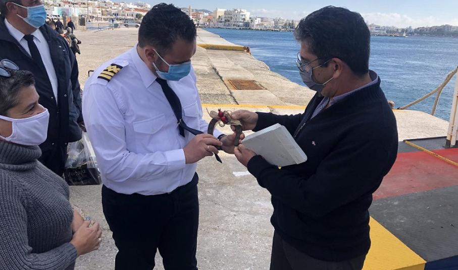Εκεί, περίμεναν τον καπετάνιο και τα μέλη του πληρώματος η Δήμαρχος Σίφνου, κ. Μαρία Ναδάλη, εκπρόσωποι του Δήμου Σίφνου, του Λιμενικού Ταμείου, ο Πρόεδρος και μέλη του Πολιτιστικού Συλλόγου Σίφνου, ο πρόεδρος του Οικολογικού Συλλόγου Καμαρών, καθώς επίσης στελέχη της Λιμενικής Αρχής και ακτοπλοϊκοί πράκτορες του νησιού.