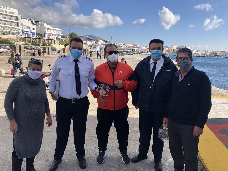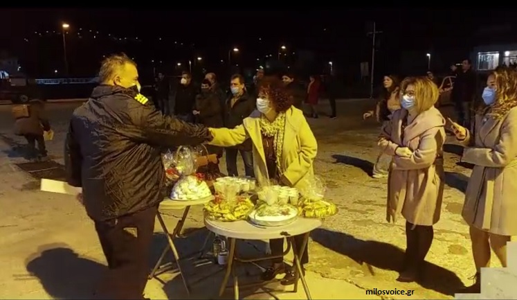 Εκεί, το υποδέχτηκαν οι Αντιδήμαρχοι Κιμώλου, κ.κ. Παναγιώτης Σάρδης και Ελισάβετ Βαμβακάρη, μαζί με πολίτες, στελέχη του Λιμενικού και επιβάτες, οι οποίοι προσέφεραν στον καπετάνιο και το πλήρωμα του «ΑΔΑΜΑΝΤΙΟΣ ΚΟΡΑΗΣ» ένα καλάθι με κρασιά, καθώς επίσης την παραδοσιακή λαδένια Κιμώλου και γλυκίσματα.