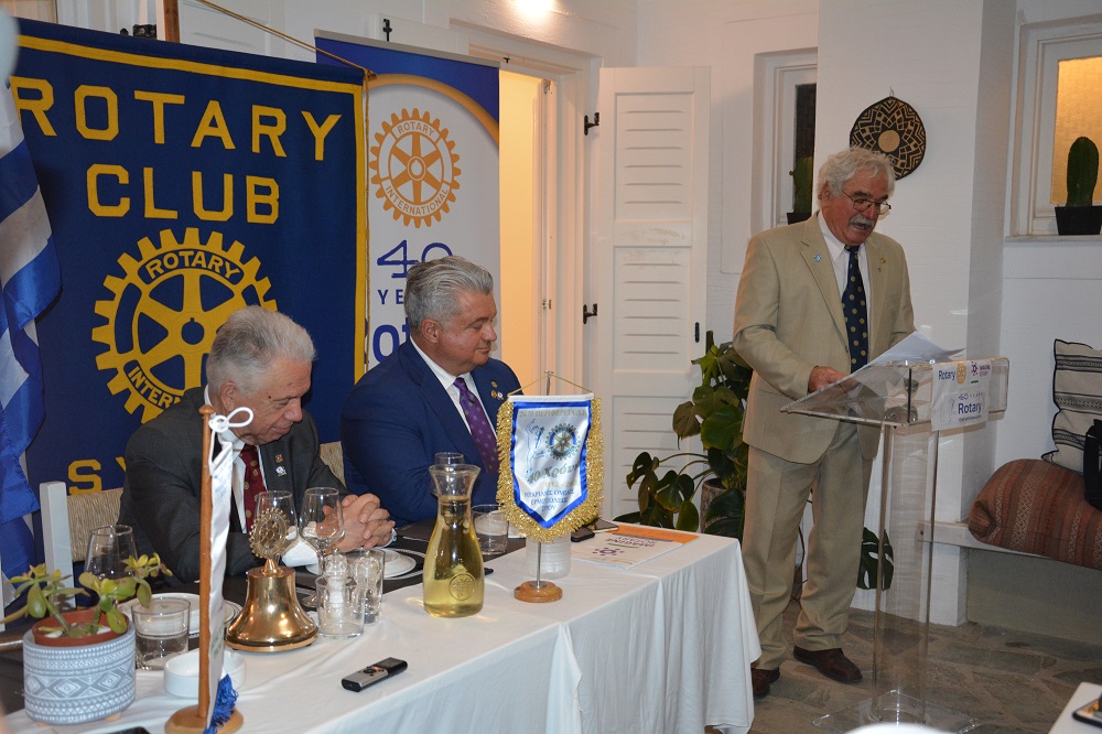 Αμέσως μετά, ακολούθησε η ομιλία του Προέδρου: “Η σημερινή ημέρα είναι πολύ σημαντική και καθοριστική για την πορεία του Ρόταρυ στην Ελλάδα. Οι μέχρι χθες, δύο ροταριανές Περιφέρειες, η 2484 και η 2470, που κάλυπταν τον ελλαδικό χώρο, για λόγους διοικητικούς ενώθηκαν και επίσημα από σήμερα αποτελούν την 2475 νέα ροταριανή περιφέρεια”. Απευθυνόμενος στον Διοικητή Ιωάννη Κατσόγιαννη και στον Β’ Διοικητή Γιάννη Κοιμτζόγλου, ο κ. Τζαναβάρης είπε πως είναι ιδιαίτερη χαρά και τιμή που η πρώτη επίσκεψη του Διοικητή της νέας περιφέρειας είναι στον Ροταριανό Όμιλο Ερμουπόλεως ο οποίος φέτος γιορτάζει τα 40 χρόνια παρουσίας και δράσης του στην κοινωνία.