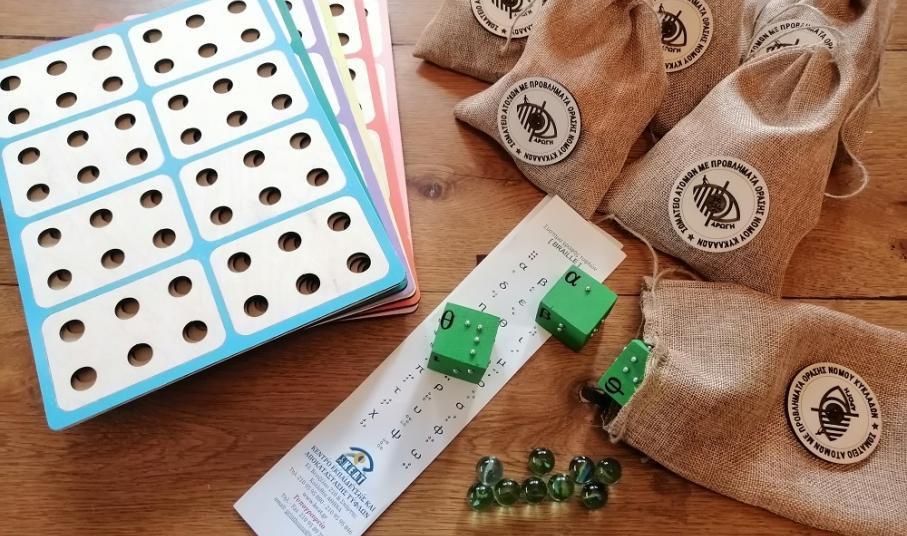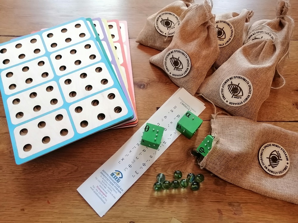 Αρχικά, δημιουργήθηκε  ένα επιτραπέζιο παιχνίδι, προκειμένου οι μαθητές και οι μαθήτριες να είναι σε θέση να αντιληφθούν το σύστημα γραφής Braille στο οποίο εκπαιδεύονται τα άτομα με οπτική αναπηρία και κυρίως τα μικρά παιδιά. Το συγκεκριμένο παιχνίδι αποτελείται από μια ξύλινη επιφάνεια, μεγέθους όσο μια σελίδα Α4 , διάτρητη στο σχηματισμό το εξάστιγμου , ώστε σε κάθε θέση ανάλογα με το γράμμα που επιθυμούμε να σχηματίσουμε να τοποθετούνται οι     γυάλινες μπίλιες, που «κρύβονται» μέσα σε ένα υφασμάτινο πουγκί μαζί με τους πολύχρωμους ξύλινους κύβους, οι οποίοι στην κάθε τους πλευρά έχουν σχηματισμένα   τα γράμματα της ελληνικής αλφαβήτου.