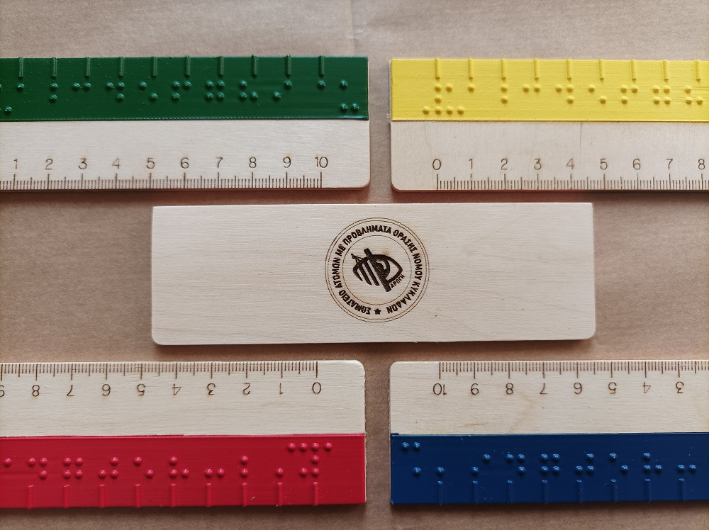 Τη συνέχεια των ειδικών κατασκευών, διαδέχτηκε η δημιουργία ενός ανάγλυφου χάρακα 10 εκ. με τη γραφή Braille στη μια πλευρά της επιφάνειάς του, προκειμένου να μπορούν να τον χρησιμοποιήσουν και οι μαθητές με οπτική αναπηρία. Τα ξύλινα χαρακάκια κατασκευάστηκαν από τη FABRIKA σε ποικιλία χρωμάτων,  πορτοκαλί, πράσινο, κόκκινο και κίτρινο χρώμα, με ανάγλυφες γραμμές ανά εκατοστό, σε συνδυασμό με  την αρίθμηση στο σύστημα γραφής braille, από την μια πλευρά και από την άλλη όπως τον γνωρίζουμε, φέροντας στην πίσω όψη του το λογότυπο της ΑΡΩΓΗΣ.