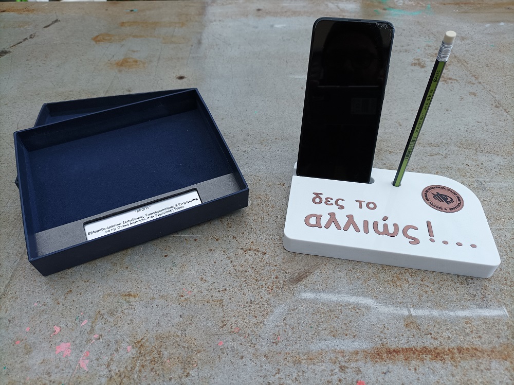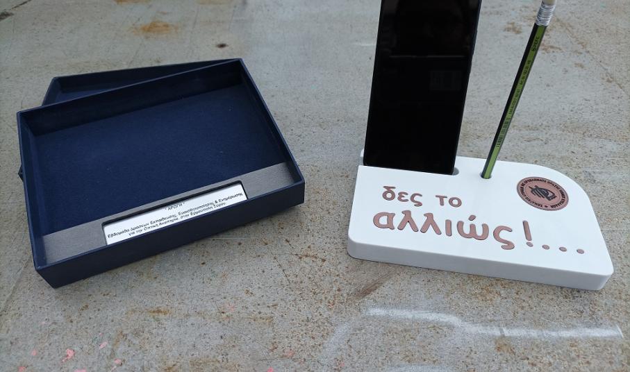 Η παρουσίαση των δημιουργικών κατασκευαστικών προτάσεων, ολοκληρώνεται με την ειδική μαρμάρινη κατασκευή που δημιουργήθηκε και προσφέρθηκε ως αναμνηστικό δώρο, κατά τη διάρκεια της εβδομάδας των εκπαιδευτικών και ενημερωτικών δράσεων για την οπτική αναπηρία που πραγματοποιήθηκε στη Σύρο τον περασμένο Απρίλιο. Με κεντρικό μήνυμα τη φράση «Δες το αλλιώς» η μαρμάρινη κατασκευή, μπορεί να είναι ταυτόχρονα εικαστική ως κάθετο επιτραπέζιο διακοσμητικό αντικείμενο αλλά και χρηστική ως οριζόντια επιτραπέζια βάση με ειδική εγκοπή –θέση για κινητό τηλέφωνο και με ειδική θέση στήριξης για μολύβι ή πένα, ανάλογα με την επιθυμία του χρήστη.