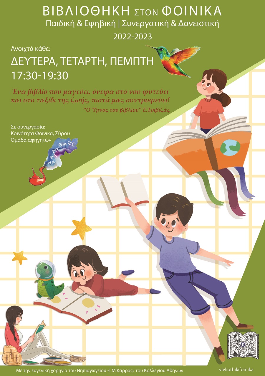 Η κοινοτική Βιβλιοθήκη στον Φοίνικα, Παιδική & Εφηβική, Συνεργατική & Δανειστική ανοίγει ξανά! Μετά την έρευνα κοινού που έγινε την άνοιξη του 2022, έγινε αντιληπτό ότι χρειάζεται κι αξίζει να αυξηθούν οι μέρες και να αλλάξουν οι ώρες λειτουργίας. Έτσι, θα λειτουργεί 3 φορές την εβδομάδα, αλλά και με ραντεβού για τα σχολεία και τους εκπαιδευτικούς οργανισμούς του νησιού.