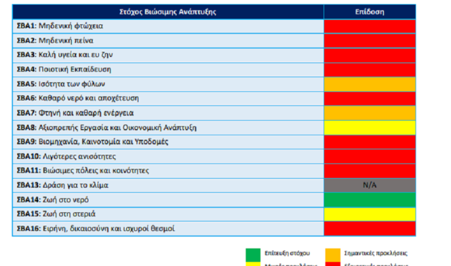 Το “Δίκτυο λύσεων βιώσιμης ανάπτυξης”, το Οικονομικό Πανεπιστήμιο Αθηνών, το ερευνητικό κέντρο “Αθηνά” και το “Παρατηρητήριο περιφερειακών πολιτικών”, με την υποστήριξη της Data Consultants, προχωρούν στην πρώτη καταγραφή της προόδου επίτευξης των 17 στόχων βιώσιμης ανάπτυξης (ΣΒΑ) σε περιφερειακό επίπεδο, οι οποίοι συγκεκριμένα είναι: ΣΒΑ1: Μηδενική φτώχεια, ΣΒΑ2: Μηδενική πείνα, ΣΒΑ3: Καλή υγεία και ευ ζην, ΣΒΑ4: Ποιοτική Εκπαίδευση, ΣΒΑ5: Ισότητα των φύλων, ΣΒΑ6: Καθαρό νερό και αποχέτευση, ΣΒΑ7: Φτηνή και καθαρή ενέργεια, ΣΒΑ8: Αξιοπρεπής Εργασία και Οικονομική Ανάπτυξη, ΣΒΑ9: Βιομηχανία, Καινοτομία και Υποδομές, ΣΒΑ10: Λιγότερες ανισότητες, ΣΒΑ11: Βιώσιμες πόλεις και κοινότητες, ΣΒΑ12: Υπεύθυνη κατανάλωση και παραγωγή, ΣΒΑ13: Δράση για το κλίμα, ΣΒΑ14: Ζωή στο νερό, ΣΒΑ15: Ζωή στη στεριά, ΣΒΑ16: Ειρήνη, δικαιοσύνη και ισχυροί θεσμοί, ΣΒΑ17: Συνεργασία για τους στόχους.