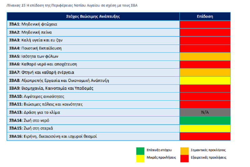 Η Περιφέρεια Νοτίου Αιγαίου συγκεκριμένα αντιμετωπίζει εξαιρετικές προκλήσεις για την επίτευξη των στόχων “Μηδενική φτώχεια”, “Μηδενική πείνα”, “Καλή υγεία και ευ ζην”, “Ποιοτική εκπαίδευση”, “Καθαρό νερό και αποχέτευση”, “Βιομηχανία, καινοτομία και υποδομές”, “Λιγότερες ανισότητες” , “Βιώσιμες πόλεις και κοινότητες”, “Ειρήνη, δικαιοσύνη και ισχυροί θεσμοί”. Είναι ενδεικτικό ότι πάνω από το 30% των κατοίκων αντιμετωπίζουν κίνδυνο φτώχειας ή κοινωνικού αποκλεισμού, ενώ σχεδόν το 20% όσων ζουν σε πόλεις αντιμετωπίζουν σοβαρή υλική στέρηση. Η περιοχή του Νοτίου Αιγαίου έχει επιτύχει τον στόχο “Ζωή στο νερό” ενώ αντιμετωπίζει μικρές προκλήσεις για την επίτευξη -πριν από το 2030- των στόχων “Αξιοπρεπής εργασία και οικονομική ανάπτυξη” και “Ζωή στη στεριά”. Σημαντικές παραμένουν οι προκλήσεις για τους στόχους “Ισότητα των φύλων” και “Φθηνή και καθαρή εργασία”.