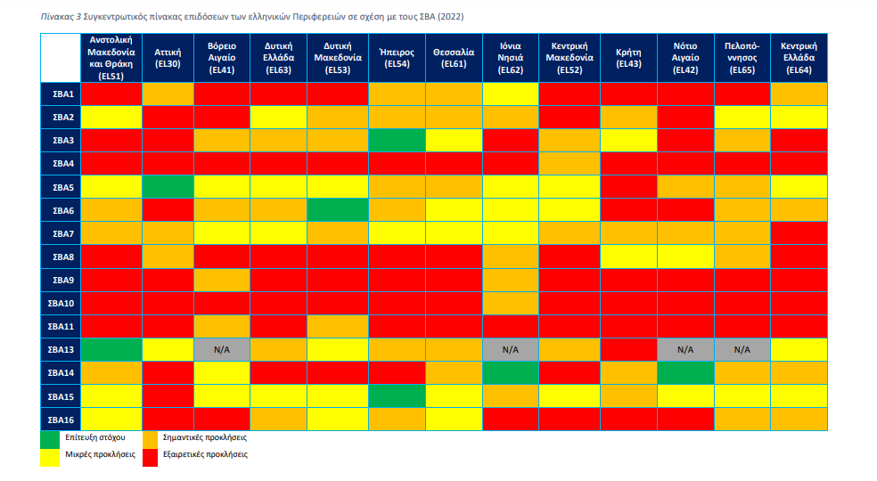 Θετική εντύπωση προκαλεί η Περιφέρεια Θεσσαλίας, η οποία είναι η μόνη ελληνική Περιφέρεια που έχει ήδη εκπληρώσει τις απαιτήσεις για τη βιωσιμότητα έως το 2030, κατά περισσότερο από 50%. Οι Περιφέρειες Ιονίων Νήσων, Ανατολικής Μακεδονίας και Θράκης, καθώς και Δυτικής Μακεδονίας φαίνεται να αντιμετωπίζουν κάποιες δυσκολίες, ενώ δεν μπορεί να περάσει απαρατήρητο το γεγονός ότι οι Περιφέρειες Αττικής, Νοτίου Αιγαίου και Κρήτης, βρίσκονται στις τελευταίες θέσεις και θα πρέπει να προσπαθήσουν περισσότερο για να ξεπεράσουν σημαντικές προκλήσεις για την επίτευξη των ΣΒΑ έως το 2030, δεδομένου ότι πάνω από το 60% του ελληνικού πληθυσμού κατοικεί σε αυτές τις περιοχές.