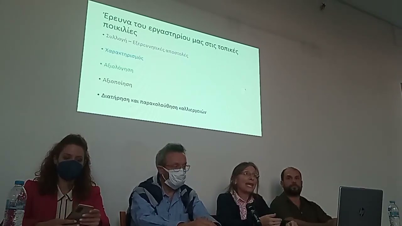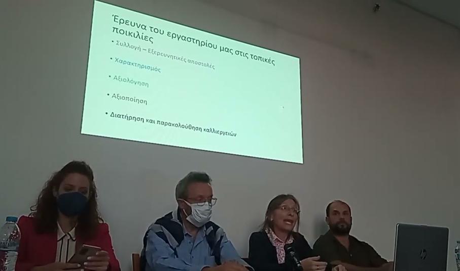 Ο Δρ. Ροίκος Θανόπουλος (γεωπόνος, τμήμα γεωργικών εκμεταλλεύσεων, Γεωπονικό Πανεπιστήμιο Αθηνών και Ινστιτούτο Γενετικής Βελτίωσης και Φυτογενετικών Πόρων) στην παρουσίαση του θέματος «Ανάδειξη και αξιοποίηση των τοπικών ποικιλιών (εγγραφή στον Εθνικό Κατάλογο ποικιλιών και ως στοιχείου άυλης πολιτιστικής κληρονομιάς)» μίλησε για το σύγχρονο μοντέλο ανάπτυξης της γεωργίας, το οποίο απαίτησε τη διάδοση των καλλιεργούμενων (εμπορικών) ποικιλιών για μεγάλες αποδόσεις και ομοιογένεια με αποτέλεσμα να αντικατασταθούν σε μεγάλο βαθμό οι τοπικές ποικιλίες, πρακτική που οδήγησε στη μείωση της ποικιλότητας και στη γενετική διάβρωση. Στη συνέχεια, αναφέρθηκε στην ανάγκη ένταξης των τοπικών ποικιλιών στη γεωργία του σήμερα λόγω της καταλληλότητάς τους για καλλιέργεια σε συνθήκες βιώσιμης γεωργίας - χαμηλών εισροών καθώς και για βιολογική γεωργία, ενώ μπορούν να χρησιμοποιηθούν για παραγωγή τοπικών προϊόντων με προστιθέμενη αξία. Αναφέρθηκε επίσης στην κατοχύρωση τοπικών ποικιλιών με προστατευόμενη ονομασία προέλευσης (Π.Ο.Π.), προστατευόμενη γεωγραφική ένδειξη (Π.Γ.Ε.) και εγγραφή στον εθνικό κατάλογο ποικιλιών και τα κριτήρια που απαιτούνται.